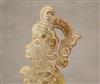 CHINESE WESTERN ZHOU DYNASTY CROUCHING FIGURE WITH DRAGON CROWN. Patinated and incised light green calcified jade of a human-like crouching figure with a dragon crown. Western Zhou dynasty. Height: 13 cm, 5 1/16 inches. Reference: similar jades in the Palace Museum, 'Chinese Jade Selected articles from Orientations 1983-1996" p. 165. Fig. 5. Note: The Western Zhou (circa.?1046[1] - 771 BC) was a period of Chinese history corresponding roughly to the first half of the Zhou dynasty. NOTE: A copy of the consignor's purchase receipt will be provided upon request. Estimate $400-600 PROVENANCE: Acquired in the early 1990s from Frank H. Crane's "The Hundred Antiques" store (Stirling, Ontario, Canada). Mr. Crane was a frequent visitor to Hong Kong where he acquired Archaic jades mainly from Mr. Lai Loy's well known and prominent shop near the Man Mo Temple on Hollywood Road. Mr. Lai (Chinese, 1926-2012) was the descendant of antique dealers from Guangzhou, China. In 2005, stones from the collection were verbally authenticated by Dr. Sarah Milledge Nelson (American, 1931 - 2020), a noted archaeologist and Distinguished Professor Emerita from the Department of Anthropology, University of Denver.