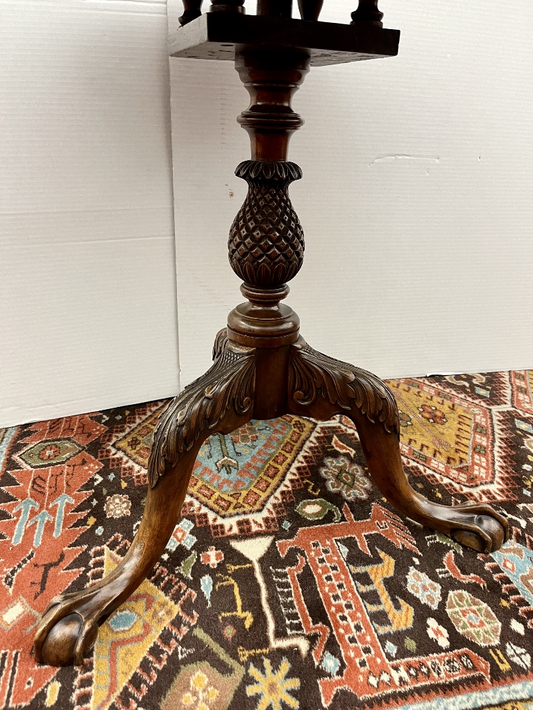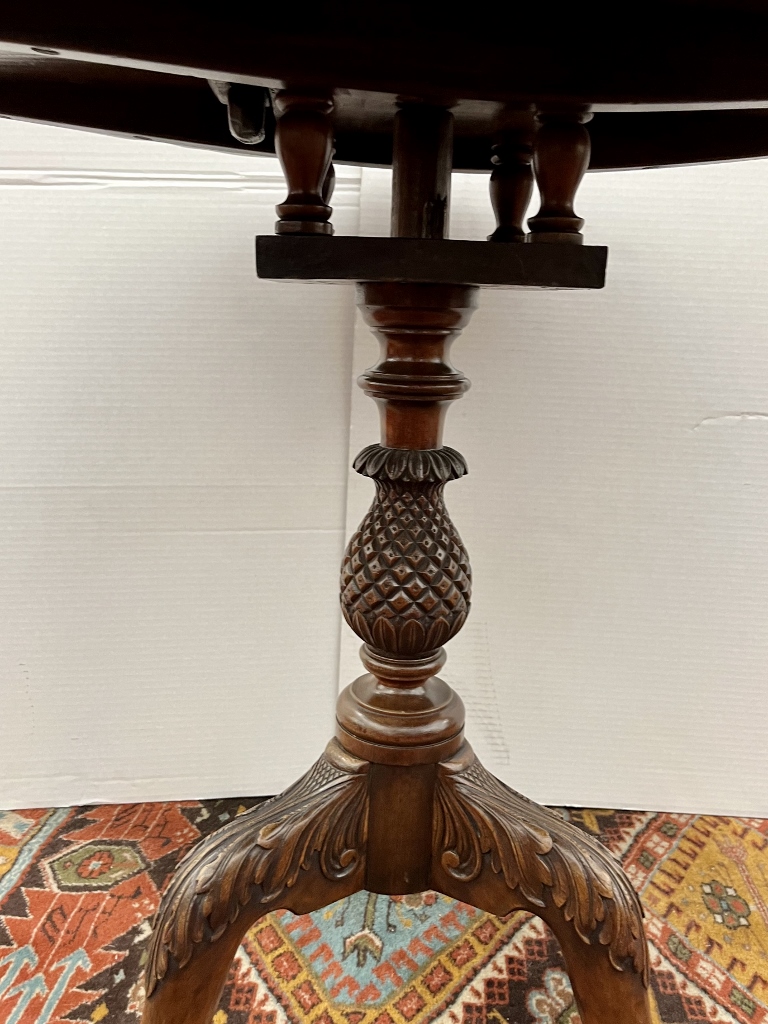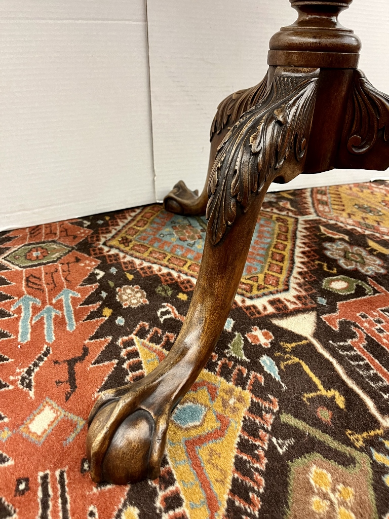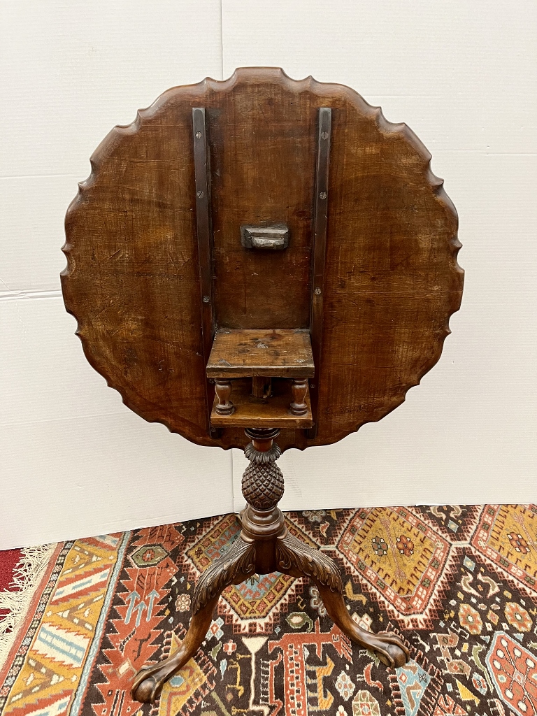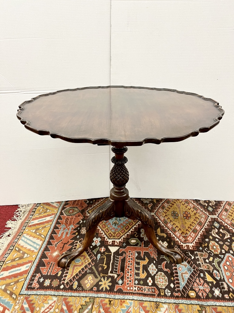 CHIPPENDALE STYLE CARVED MAHOGANY TILT-TOP TEATABLE WITH PIECRUST TOP, 19th century. Bird-cage mechanism; carved pedestal raised on three cabriole legs ending in claw-and-ball feet H: 29 in.; top, D: 30 3/4 in.Estimate $250-350