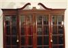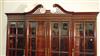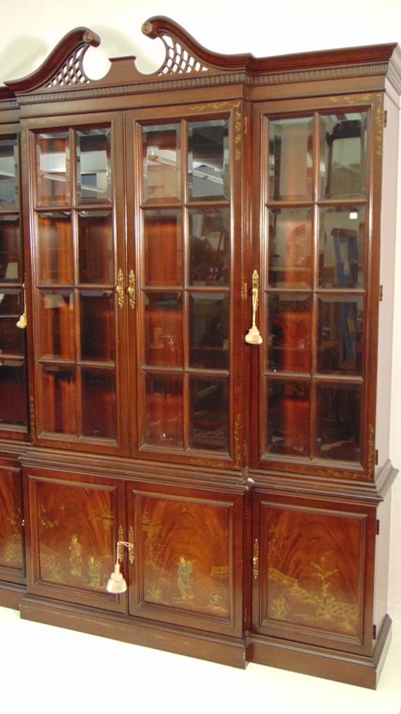 CHIPPENDALE STYLE MAHOGANY CHINOISERIE DECORATED BREAKFRONT. Lattice-pierced scrolling broken arch pediment over four cabinet doors each divided by mullions into eight beveled glass panes, opening to three shelves; lower section has four paneled cabinet doors; plinth base; overall decorated in colors and gilt with figures on landscapes and trailing branch decoration. - H: 86". W: 72". D: 16". Estimate $500-700
