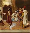 CLEMENT PUJOL DE GUASTAVINO (Spanish / French, 1850 - 1905). Audience Before the Emir, Signed C. Pujol lower right. Oil on panel. Framed. - Sight: 30.5 x 38.5 inches; frame: 38.5 x 46 inches Estimate $75,000-85,000 PROVENANCE Sotheby's, 19th Century European Art Including The Orientalist Sale, 18 April 2008, Lot 183 ARTIST PROFILE: Clement Pujol de Guastavino was active/lived in France, Spain. Clement Pujol de Guastavino is known for Orientalist figure and genre painting. Clemente Pujol began his artistic training studying at the School of Fine Arts in Barcelona, Spain. In 1871 he participated for the first time in the Fine Arts exhibitions organized in Barcelona, which he attended every year until 1876. At that time he decided to move to Paris to continue his artistic training under the guidance of Louis Nicolas Cabat, although he later trained under the guidance of the artist Leon Gérome, with whom he was introduced to the orientalist trend. That same year, 1876, he participated in the Paris Salon, although he continued to send many works to the exhibitions in Barcelona.
