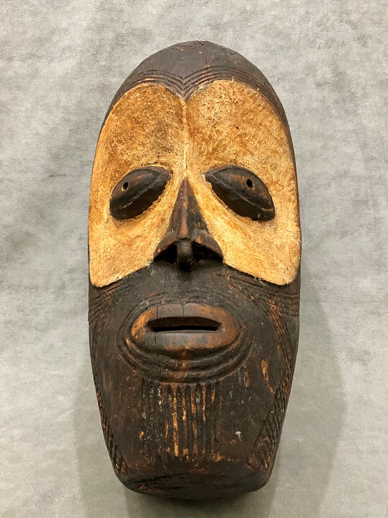 CONGOLESE LEGA FACE MASK (LUKWAKONGO). These masks, known as lukwakongo, have a heart-shaped face framed by a line formed by the nose, the eyebrows, and the planes of the cheeks. The face is whitened with clay, while the forehead and edges characteristically have a glossy brown patina. The holes running around the lower edge of this mask would originally have held a beard made of liana fibers. Lukwakongo are never worn on the face, but are instead tied to the arm or displayed on a fence at Bwami meetings. - Height approximately: 17 inches. Estimate $90-120