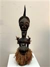 CONGOLESE SONGYE NKISI POWER FIGURE. Songye Nkisi power figure from the Democratic Republic of Congo. These figures, central to Songye communities, served as intermediaries between ancestral spirits and the living, bringing benefit to the entire community rather than belonging to an individual. Carved from wood and adorned with materials like raffia, metal, cloth, leather, horn, and beads, the figure has a large head, a protruding abdomen, and no visible feet. The face typically features a jutting chin, a geometric nose, and sculpturally prominent eyes. - Height: 33 inches.