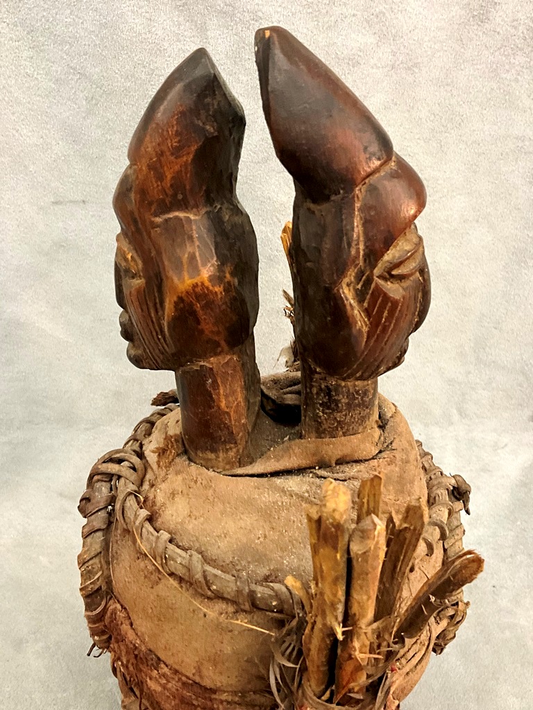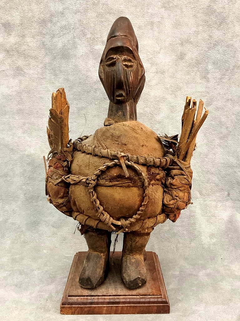 CONGOLESE TEKE BATEKE POWER RELIQUARY FIGURE. Teke Bateke power reliquary figure also known as minkisi. They serves as powerful spiritual object. The figures were believed to house spirits and were used for protection, healing, and personal empowerment. The sharp beard, narrow facial scarification, and brimmed hairstyle contrast with the smooth encasement of empowering materials. The materials used to create the encasement, as well as the specific form of the figure, varied depending on the intended purpose and the individual who commissioned it. - Height: 14 inches (including base). Estimate $150-200