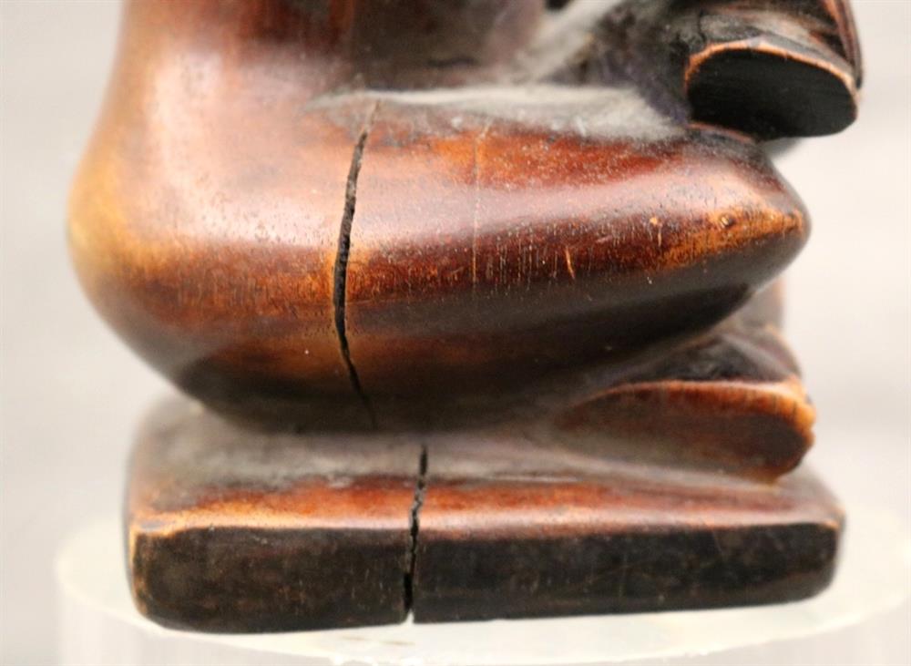 CONGOLESE YOMBE PHEMBA FEMALE NURSING CHILD. Patinated and decorated Kongo Yombe maternity figure, also known as a "phemba" or "pfemba". These figures are traditionally carved from wood and depict a mother seated with a child on her lap. The mother is shown with elaborate hairstyles, scarification patterns, and beaded adornments, reflecting her high status in Kongo society. These figures were not just representations of motherhood, but also served as protective objects, particularly for women during childbirth and for ensuring the well-being of children. They were also used in fertility rituals and as commemorative objects, honoring ancestral mothers. The figures are often adorned with glass eyes, which are believed to give them the ability to see into the spiritual world. The child's position can vary, sometimes lying in repose, other times actively interacting with the mother. These figures are considered important examples of Kongo art, reflecting the high value placed on women and children in Kongo culture. - Height: 10 inches. Estimate $400-600