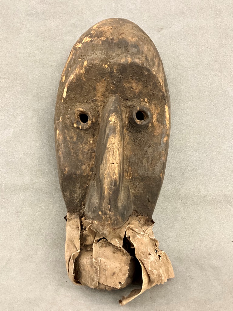 CONGOLOSE BWAMI SOCIETY LEGA MASK. Lega mask from the Democratic Republic of the Congo, used by the Bwami society. These masks represent an individual's rank and moral values within the society. The mask is made of wood and it is accented with kaolin, featuring a flat, elliptical shape with pierced edges for fiber attachment, small pierced eyes, an elongated nose. - Height: 14 inches. Estimate $70-100
