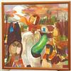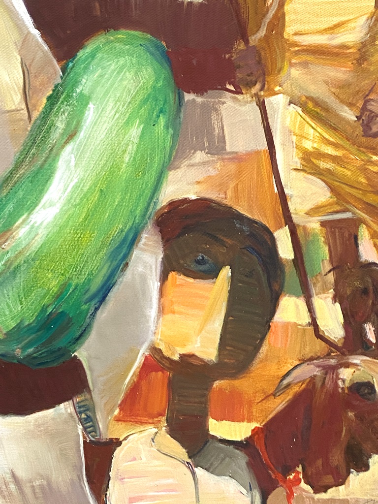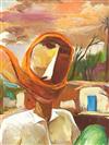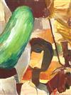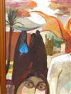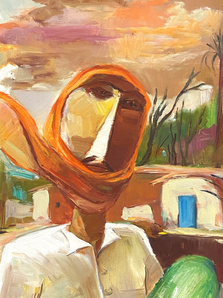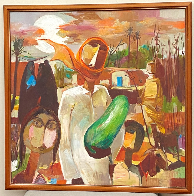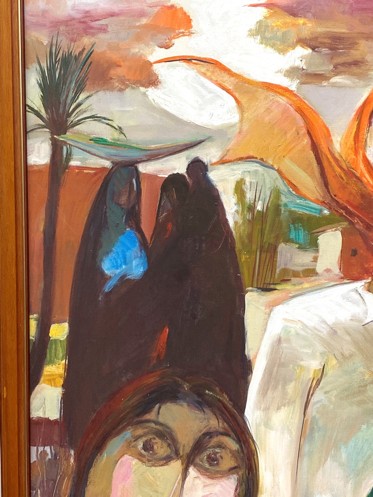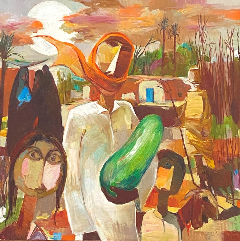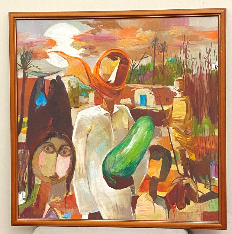 CONTEMPORARY ASIAN SCHOOL (20th century). Figure Holding a a Large Green Gourd, Vibrant, figurative painting characterized by bold colors ; it depicts a group of Middle Eastern figures suggested by the distant palm trees and the low, earth-toned buildings with a small, bright blue door. The scene is set under a dramatic sky with a large, pale sun or moon, casting warm, saturated light, and the overall mood is energetic and rooted in a specific cultural context, possibly illustrating a market scene or a rural gathering. Signed lower right. Framed. - 39" x 39" Estimate $250-350