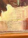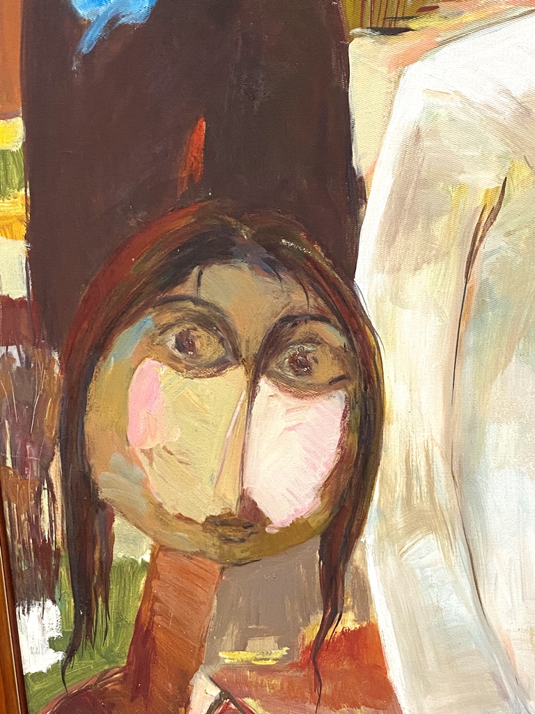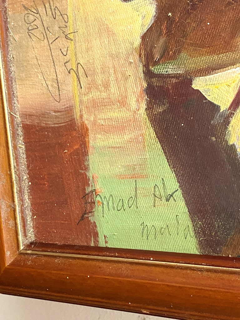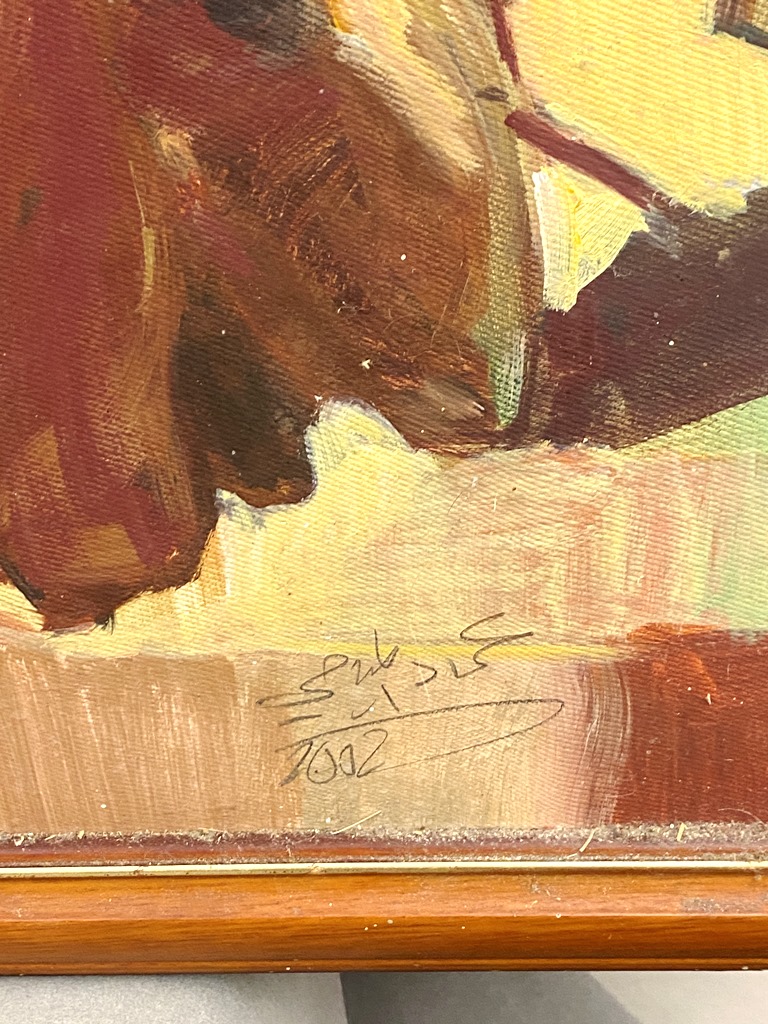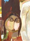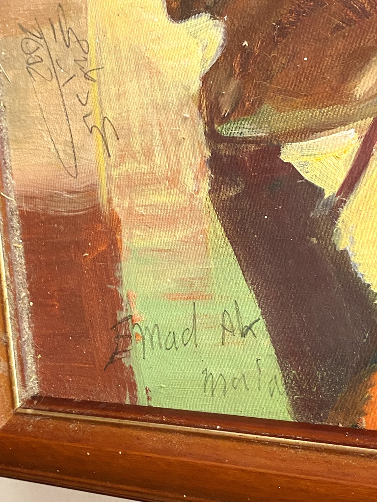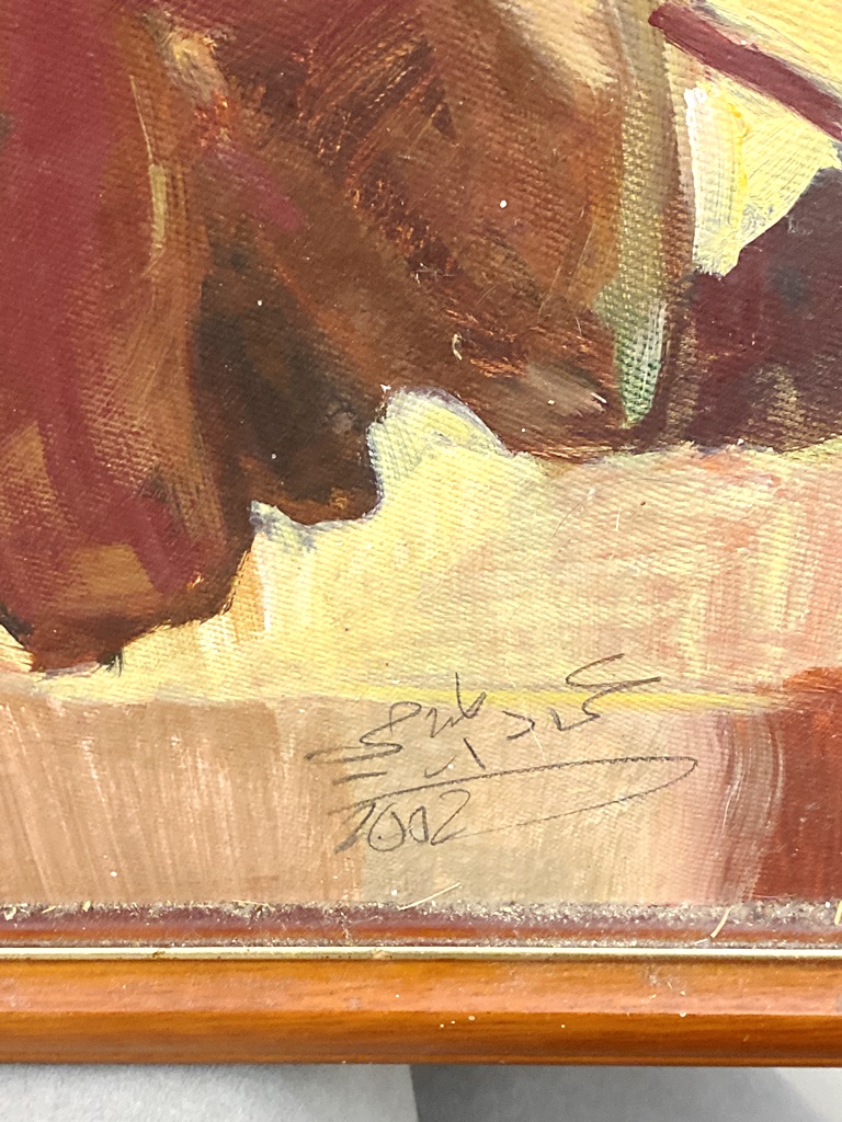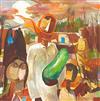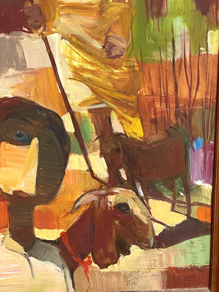 CONTEMPORARY ASIAN SCHOOL (20th century). Figure Holding a a Large Green Gourd, Vibrant, figurative painting characterized by bold colors ; it depicts a group of Middle Eastern figures suggested by the distant palm trees and the low, earth-toned buildings with a small, bright blue door. The scene is set under a dramatic sky with a large, pale sun or moon, casting warm, saturated light, and the overall mood is energetic and rooted in a specific cultural context, possibly illustrating a market scene or a rural gathering. Signed lower right. Framed. - 39" x 39" Estimate $250-350