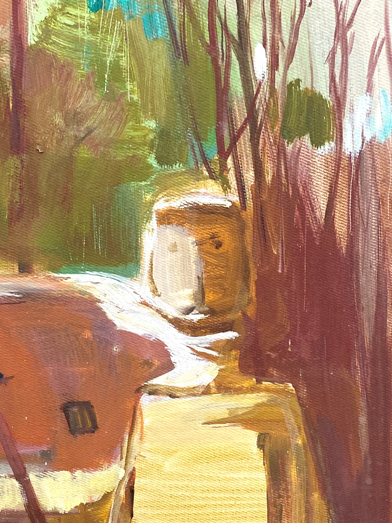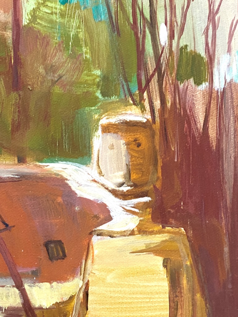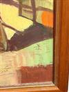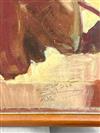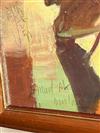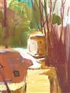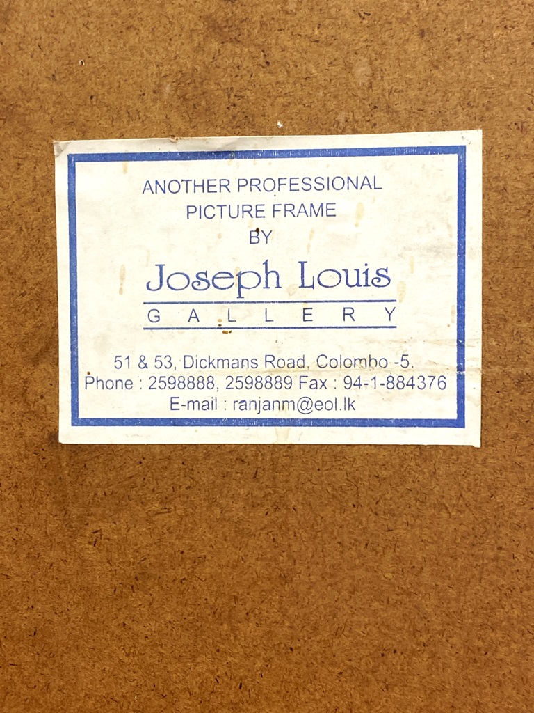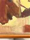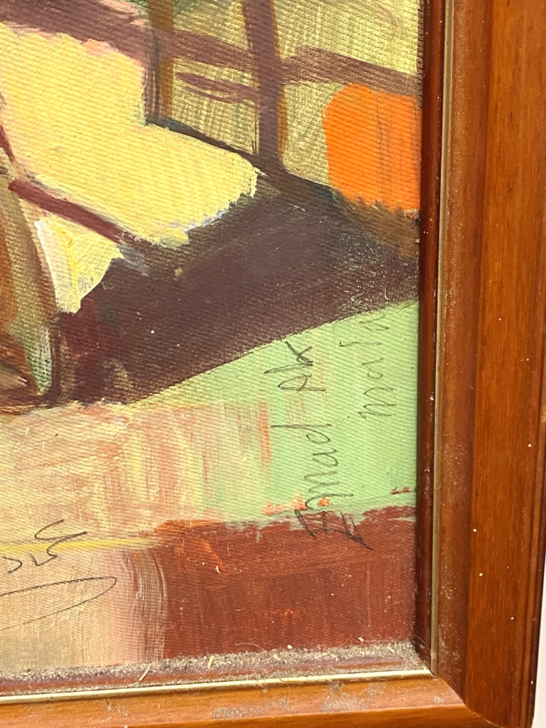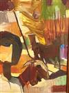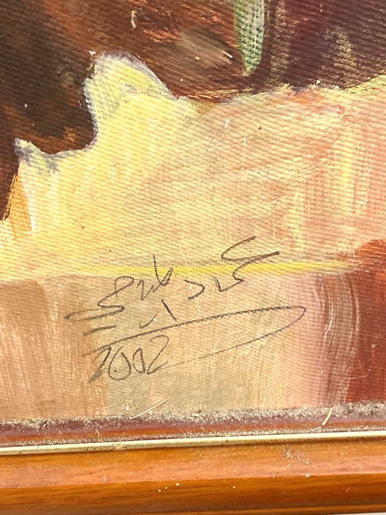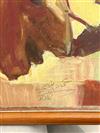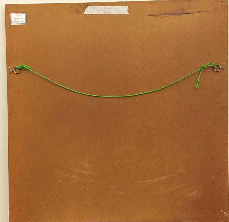 CONTEMPORARY ASIAN SCHOOL (20th century). Figure Holding a a Large Green Gourd, Vibrant, figurative painting characterized by bold colors ; it depicts a group of Middle Eastern figures suggested by the distant palm trees and the low, earth-toned buildings with a small, bright blue door. The scene is set under a dramatic sky with a large, pale sun or moon, casting warm, saturated light, and the overall mood is energetic and rooted in a specific cultural context, possibly illustrating a market scene or a rural gathering. Signed lower right. Framed. - 39" x 39" Estimate $250-350