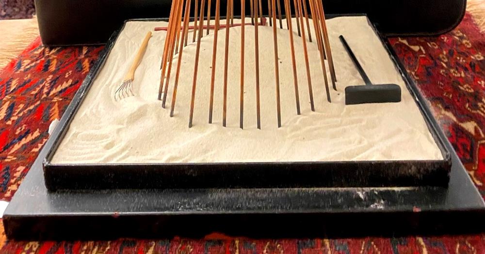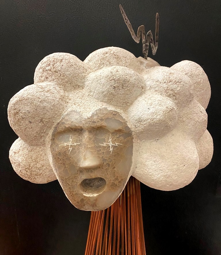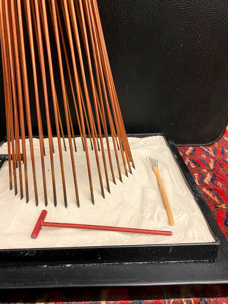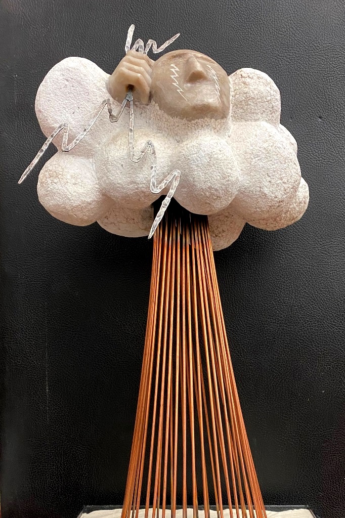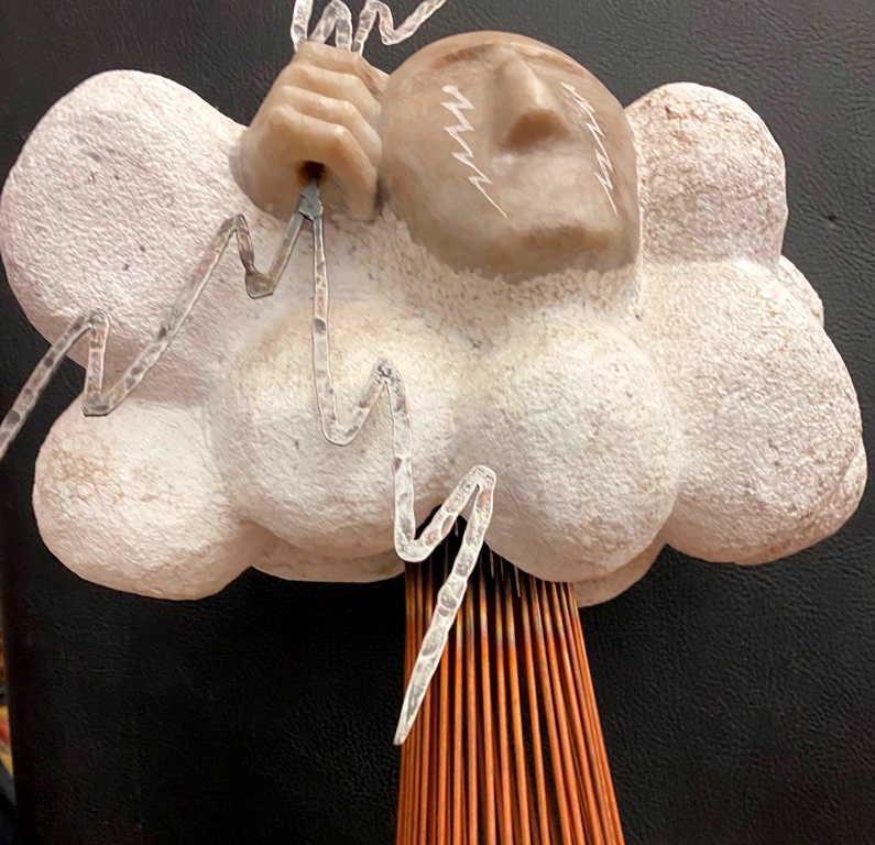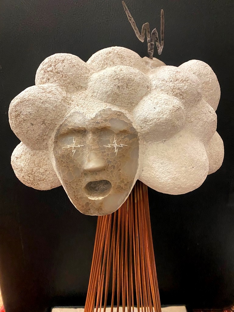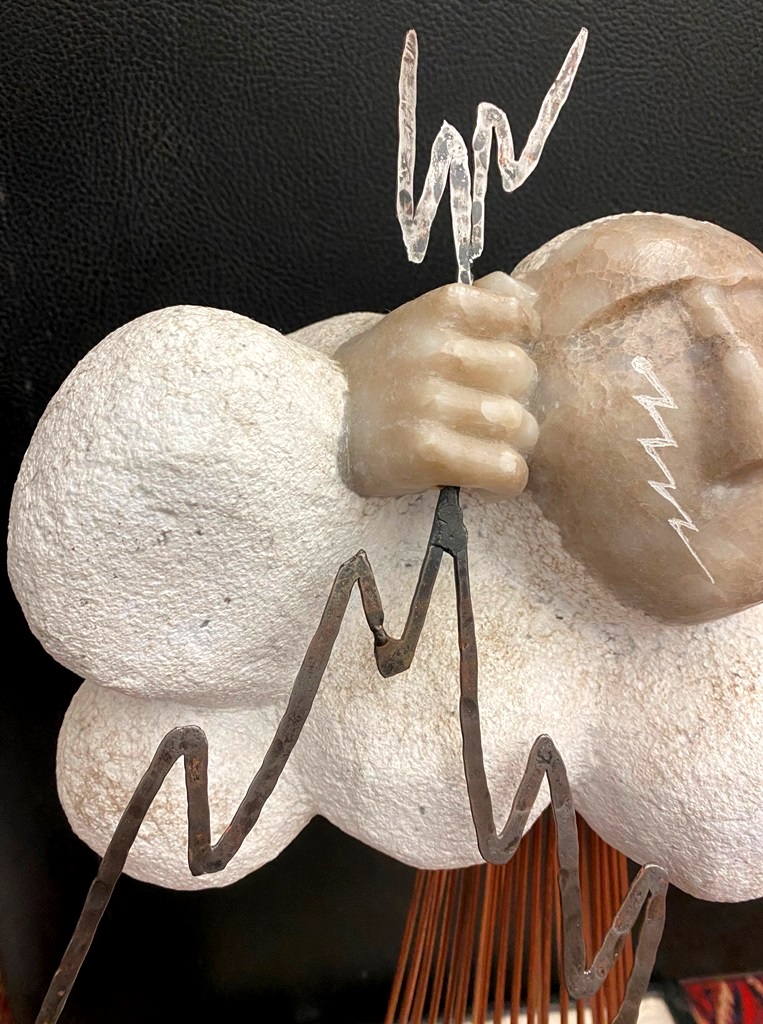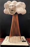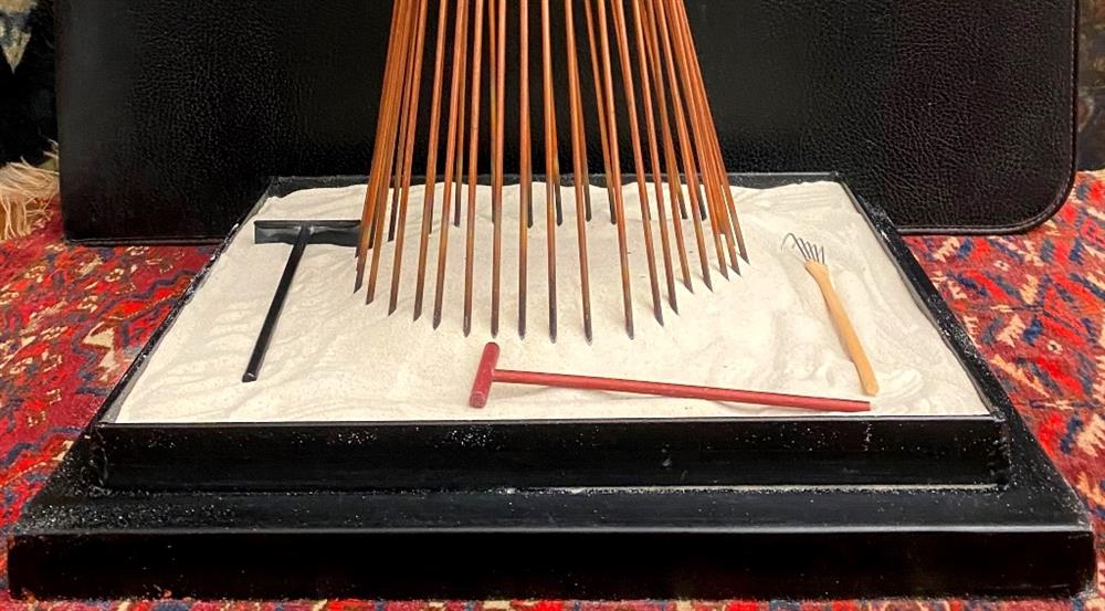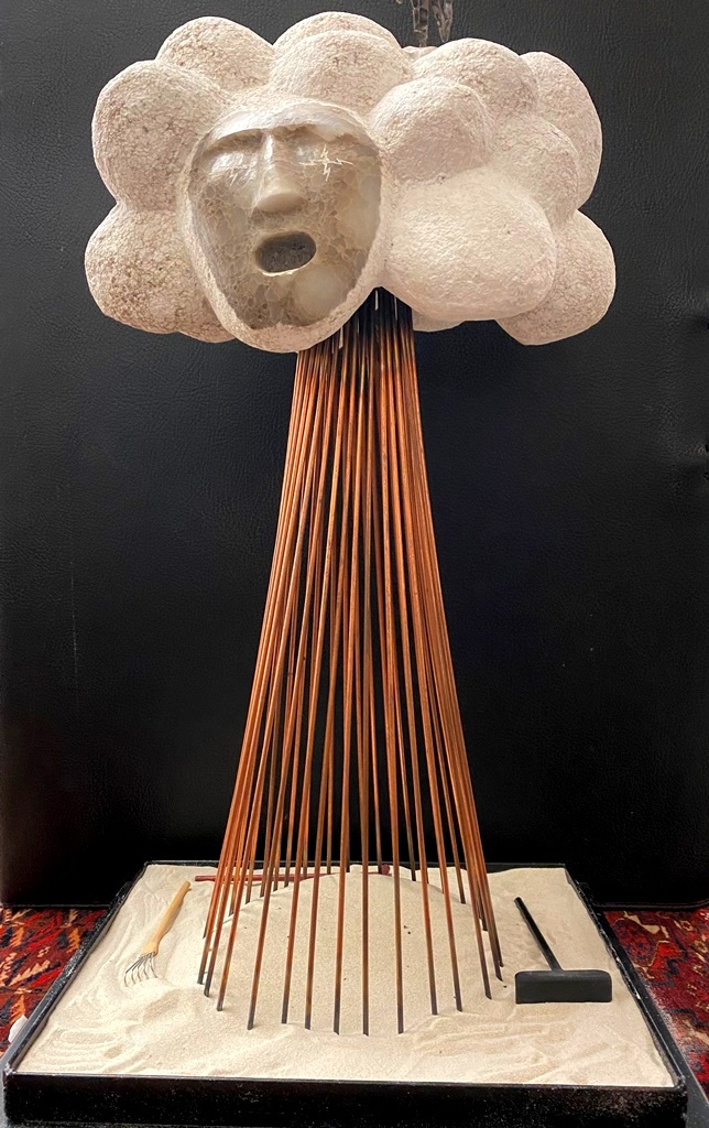 CONTEMPORARY TABLE-TOP ZEN SCULPTURE WITH SAND-RAKING BASE. Contemporary table-top sculpture presents a striking juxtaposition of classical mythology and minimalist Zen aesthetics. Dominating the upper section is a modern stone sculpture, carved in the form of a billowing cloud that subtly incorporates the head of Zeus rendered in a lighter, contrasting material. The god's power is dramatically conveyed by jagged thunderbolts, crafted from metal, which emanate from the cloud. Extending downwards from the cloud are numerous thin, polished rods, resembling rainfall or lightning strikes, which anchor the sculpture into its base—a miniature Zen garden. This base features a bed of white sand housed in a dark tray, complete with tiny raking tools, inviting contemplative interaction and contrasting the celestial, volatile power above with the earthly, meditative serenity of the rake-able sand. - H: 27". Estimate $300-400