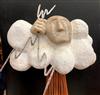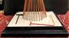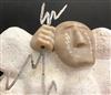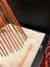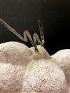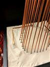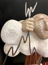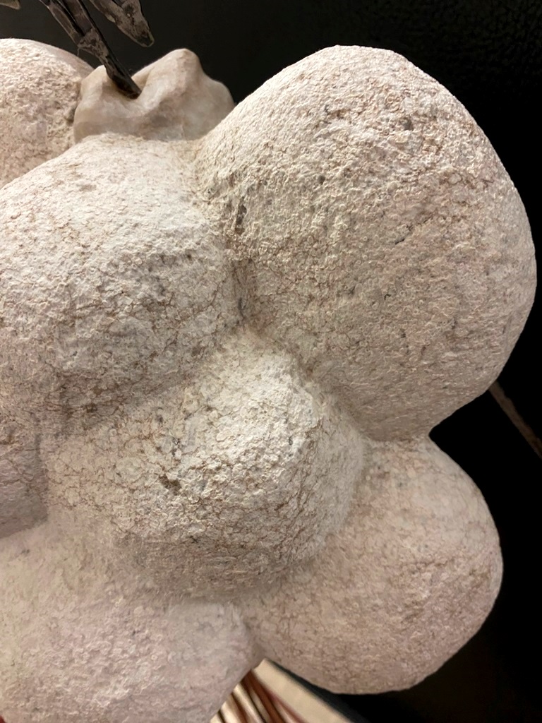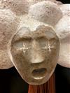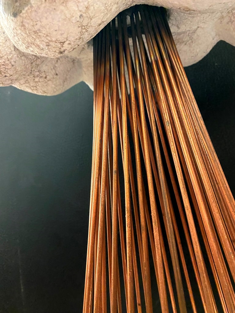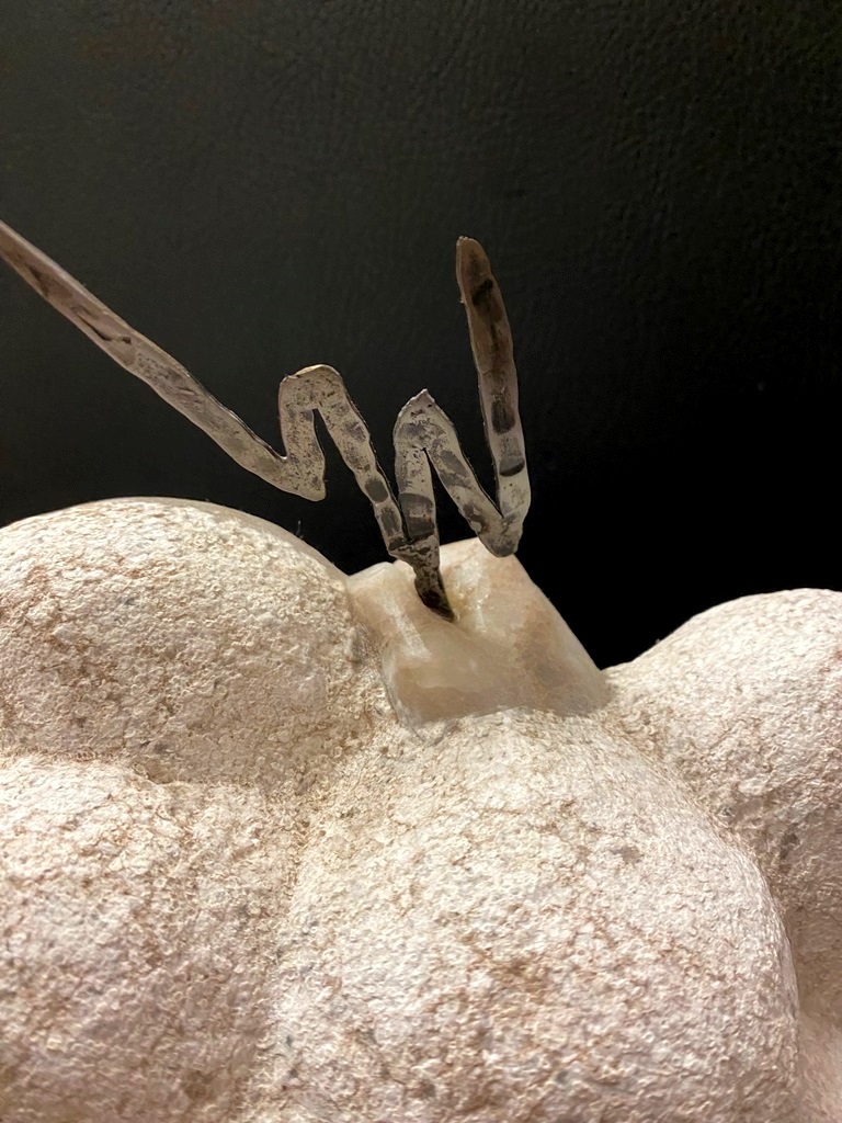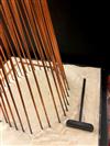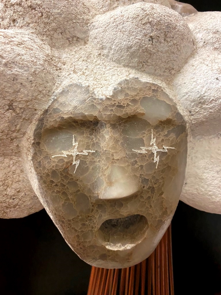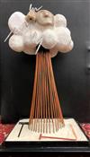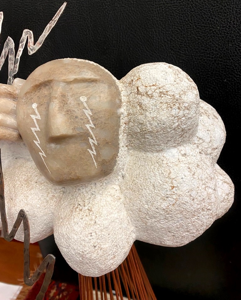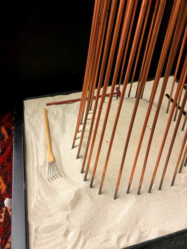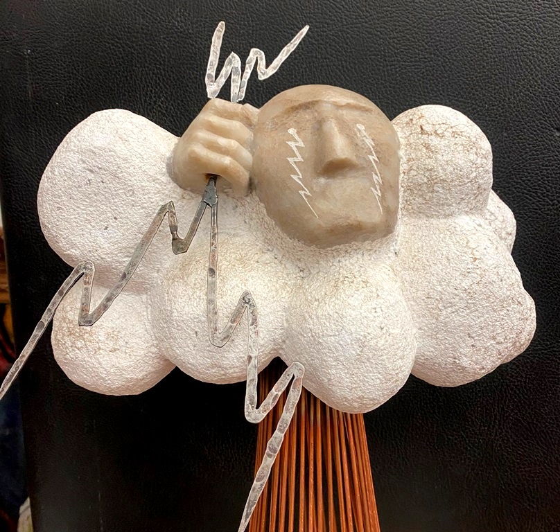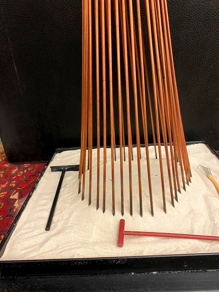 CONTEMPORARY TABLE-TOP ZEN SCULPTURE WITH SAND-RAKING BASE. Contemporary table-top sculpture presents a striking juxtaposition of classical mythology and minimalist Zen aesthetics. Dominating the upper section is a modern stone sculpture, carved in the form of a billowing cloud that subtly incorporates the head of Zeus rendered in a lighter, contrasting material. The god's power is dramatically conveyed by jagged thunderbolts, crafted from metal, which emanate from the cloud. Extending downwards from the cloud are numerous thin, polished rods, resembling rainfall or lightning strikes, which anchor the sculpture into its base—a miniature Zen garden. This base features a bed of white sand housed in a dark tray, complete with tiny raking tools, inviting contemplative interaction and contrasting the celestial, volatile power above with the earthly, meditative serenity of the rake-able sand. - H: 27". Estimate $300-400