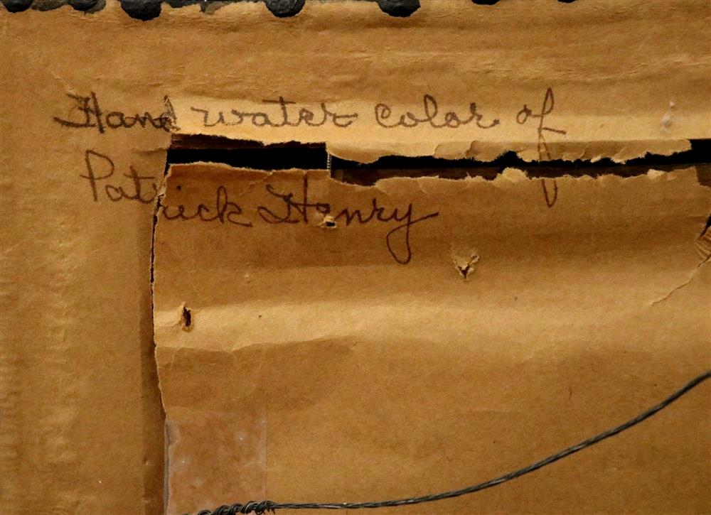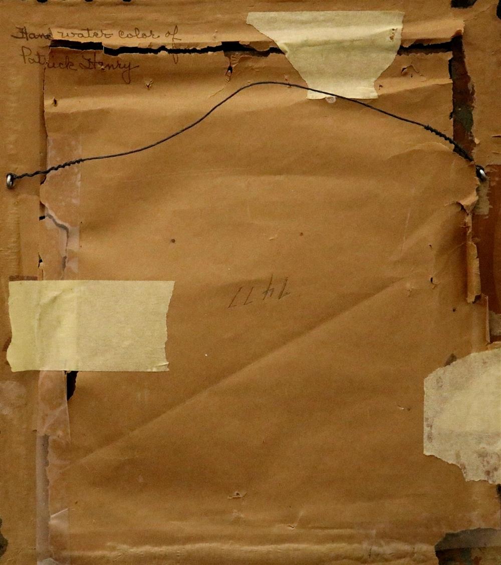 ENGLISH SCHOOL (Early 19th century). Portrait of Patrick Henry, Watercolor on paper. Verso titled. Framed. Not examined out of frame. - Sight (approx.): 9 x 7 inches; frame: 13 x 11 inches inches.Estimate $100-150