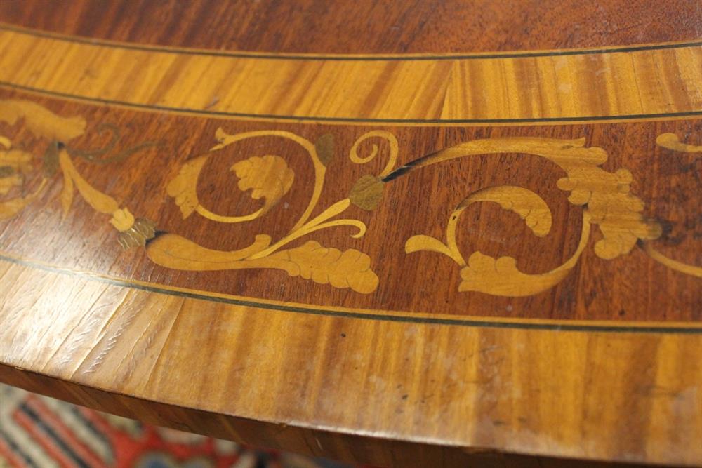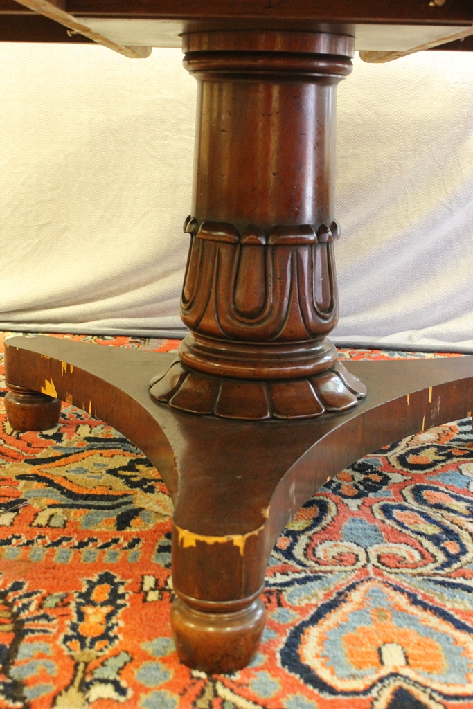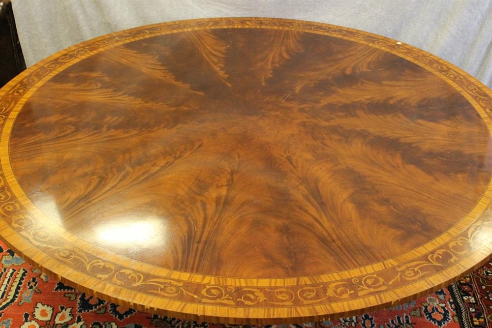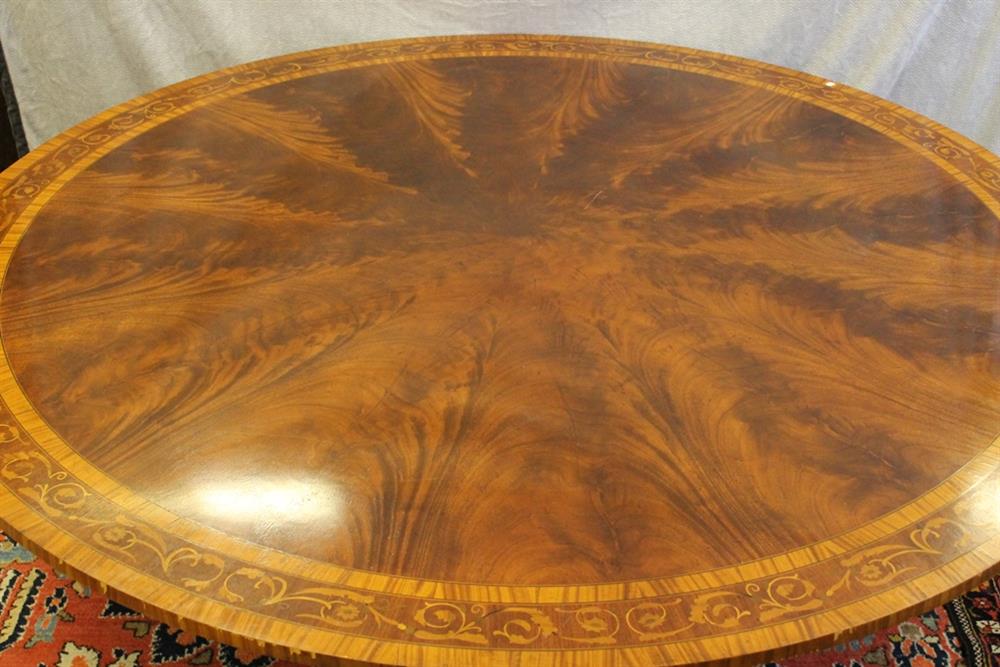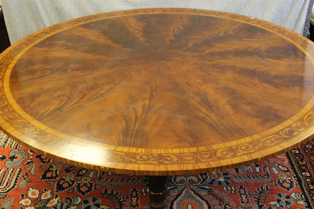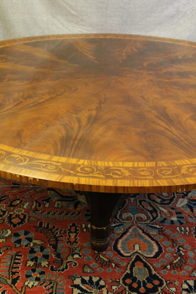 FIGURED MAHOGANY INLAID CIRCULAR-TOP DINING TABLE WITH PEDESTAL BASE. Top has cross-banded border with band of flowering vine marquetry inlay; carved cylindrical pedestal rests on triangular base raised on bun feet. - H: 30". Top, D: 84".