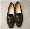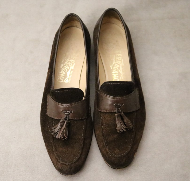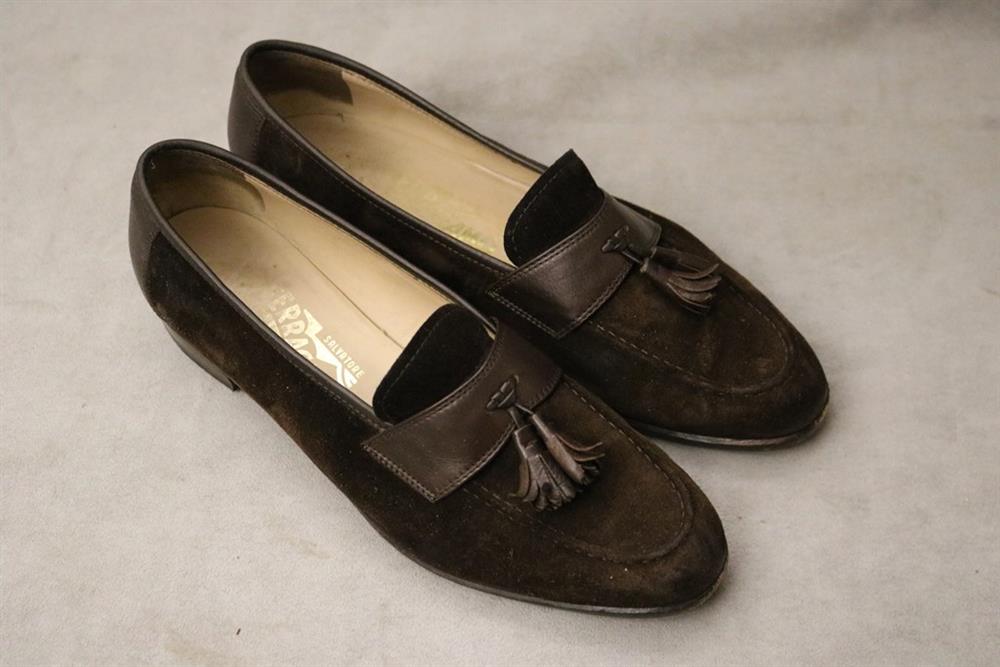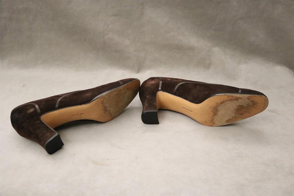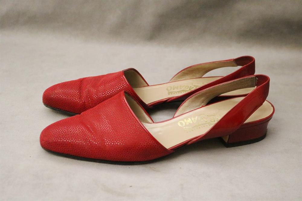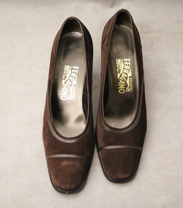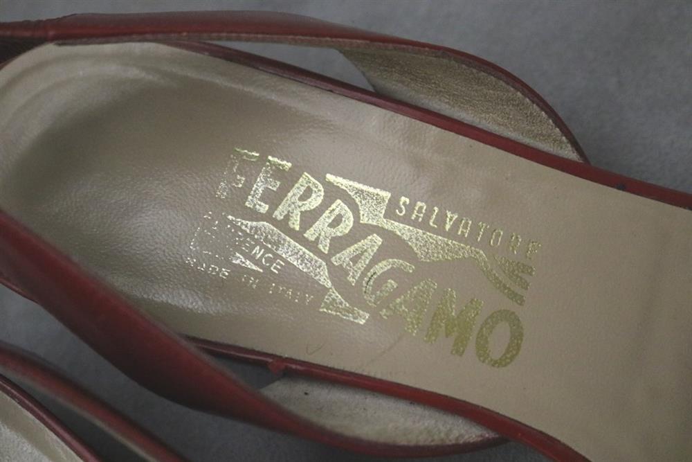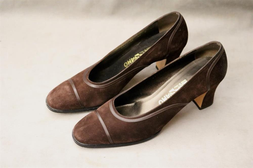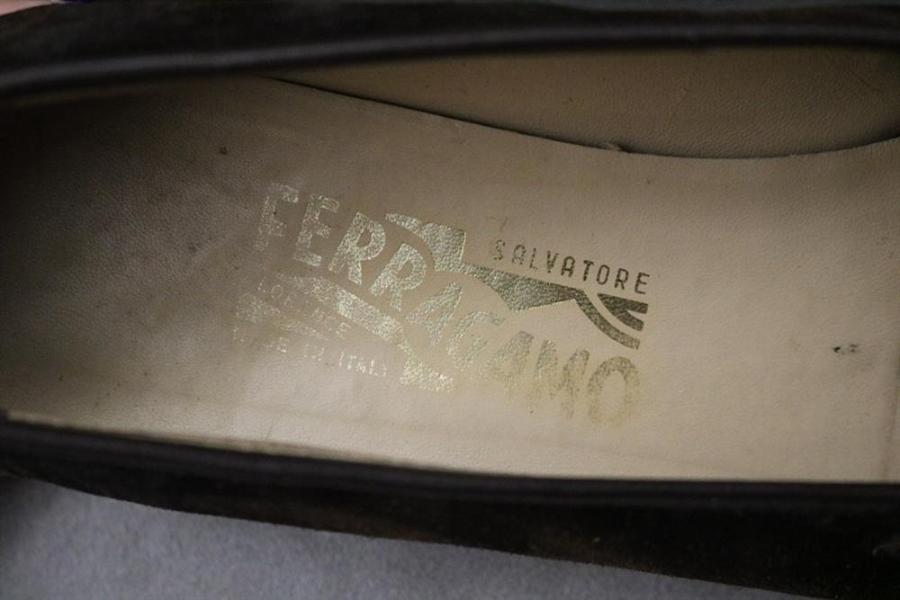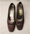 FOUR PAIRS LADY'S SALVATORE FERRAGAMO SHOES. Including red "Rosso" pebble suede sandals, chocolate brown suede block heel pumps, and two pairs of brown tassel loafers, one suede and one croco embossed, all previously worn. Estimate $100-150
