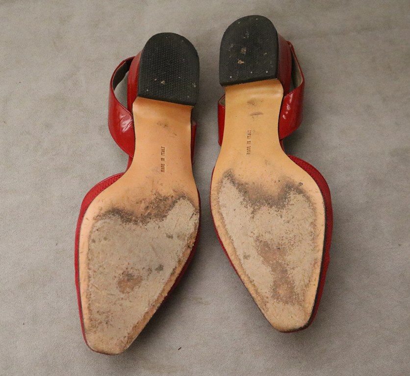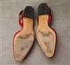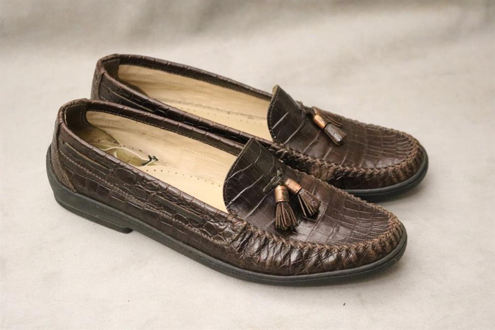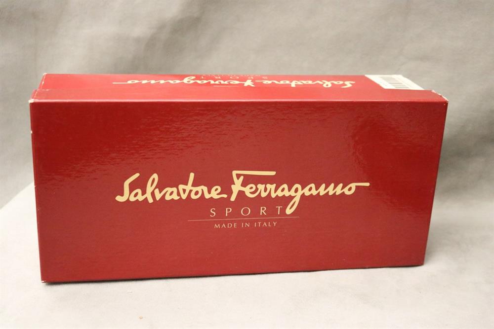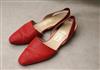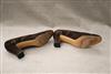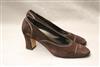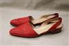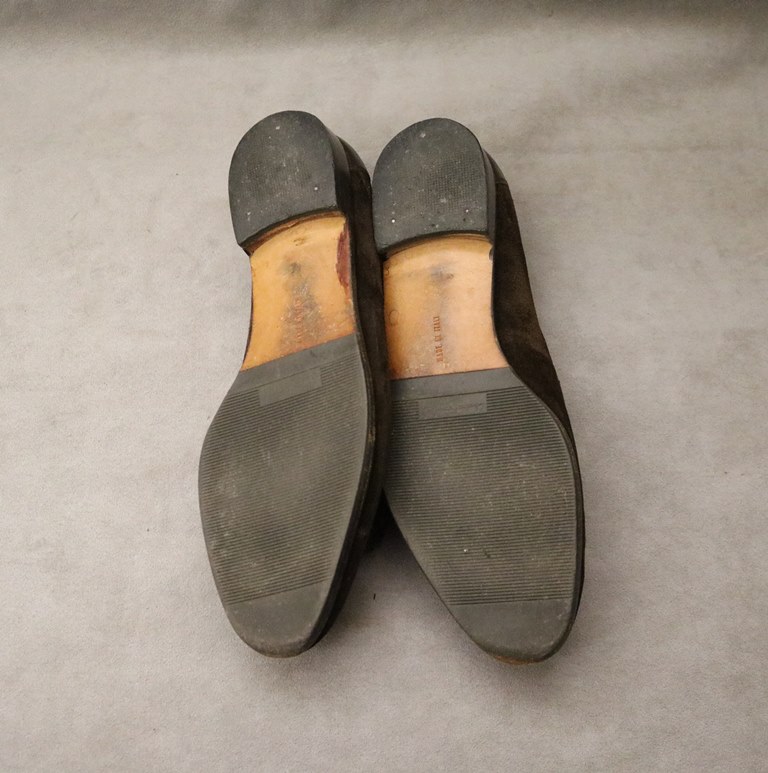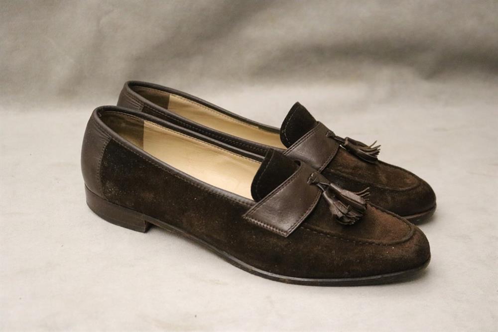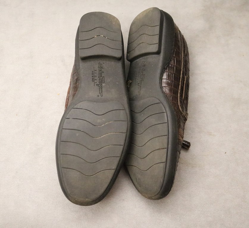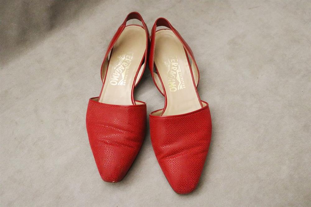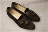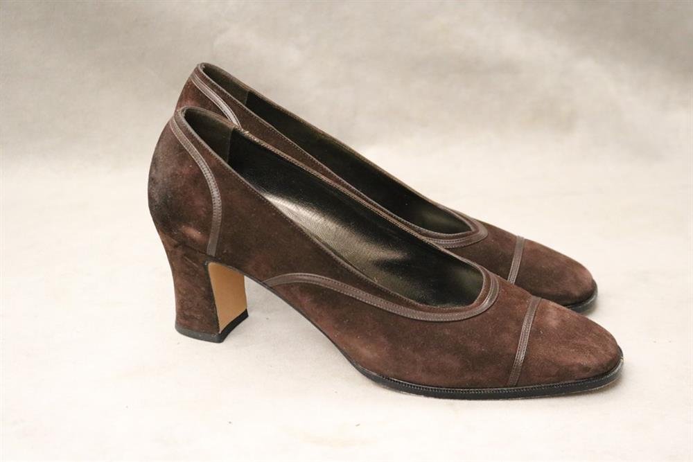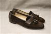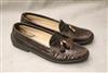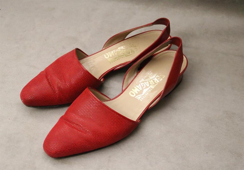 FOUR PAIRS LADY'S SALVATORE FERRAGAMO SHOES. Including red "Rosso" pebble suede sandals, chocolate brown suede block heel pumps, and two pairs of brown tassel loafers, one suede and one croco embossed, all previously worn. Estimate $100-150