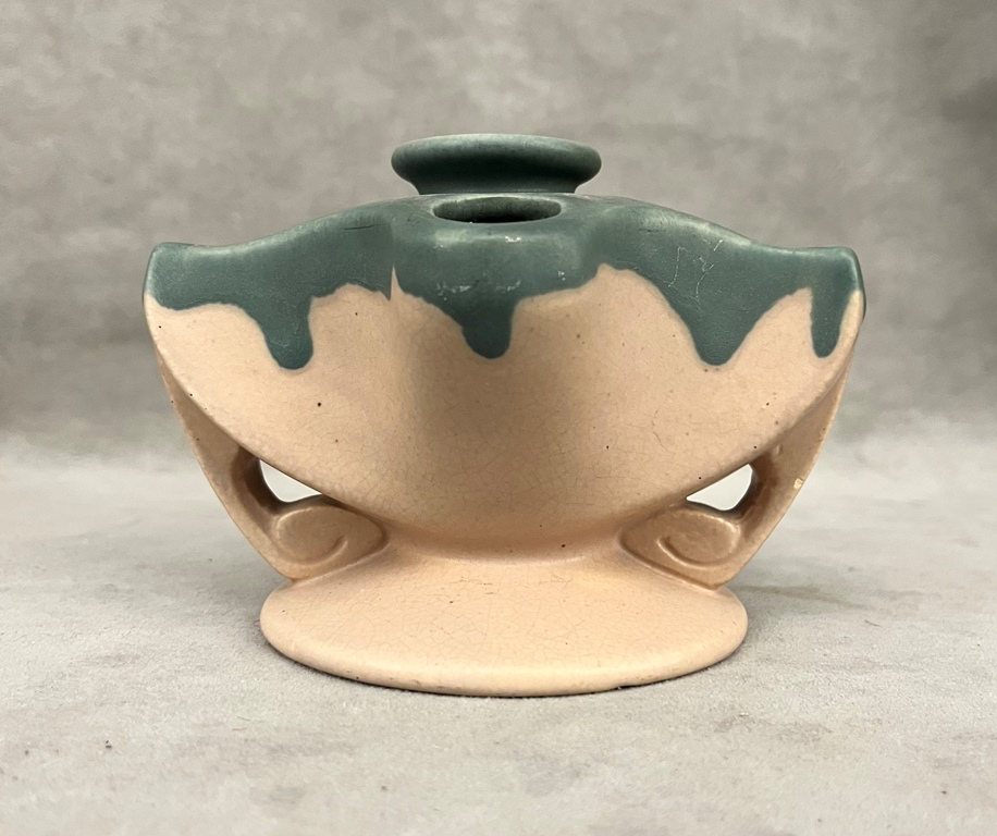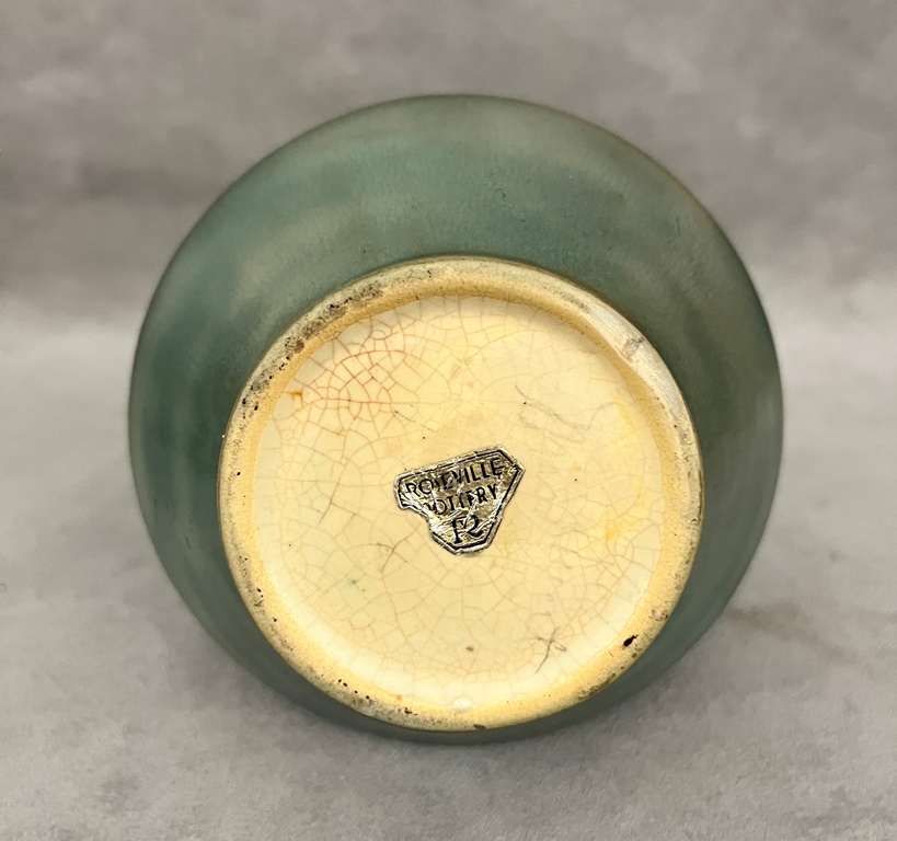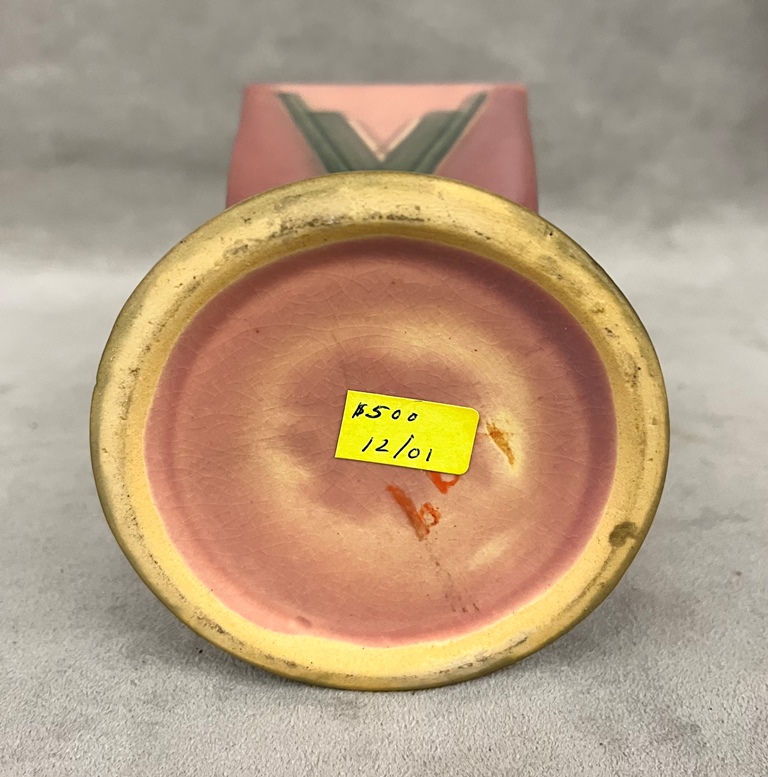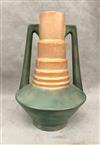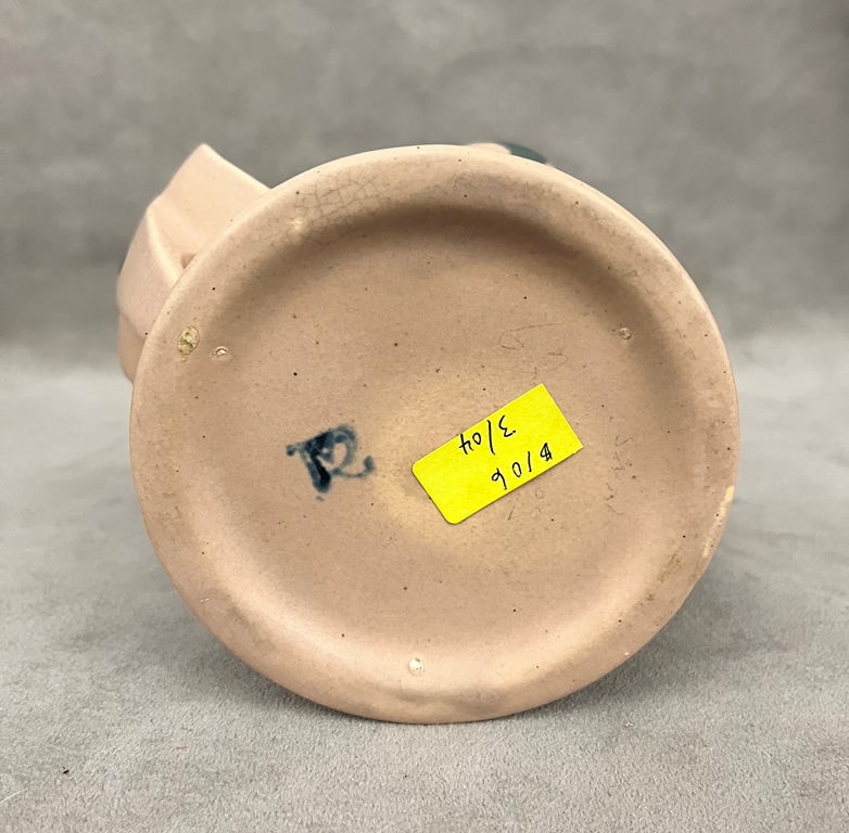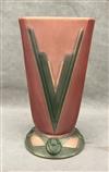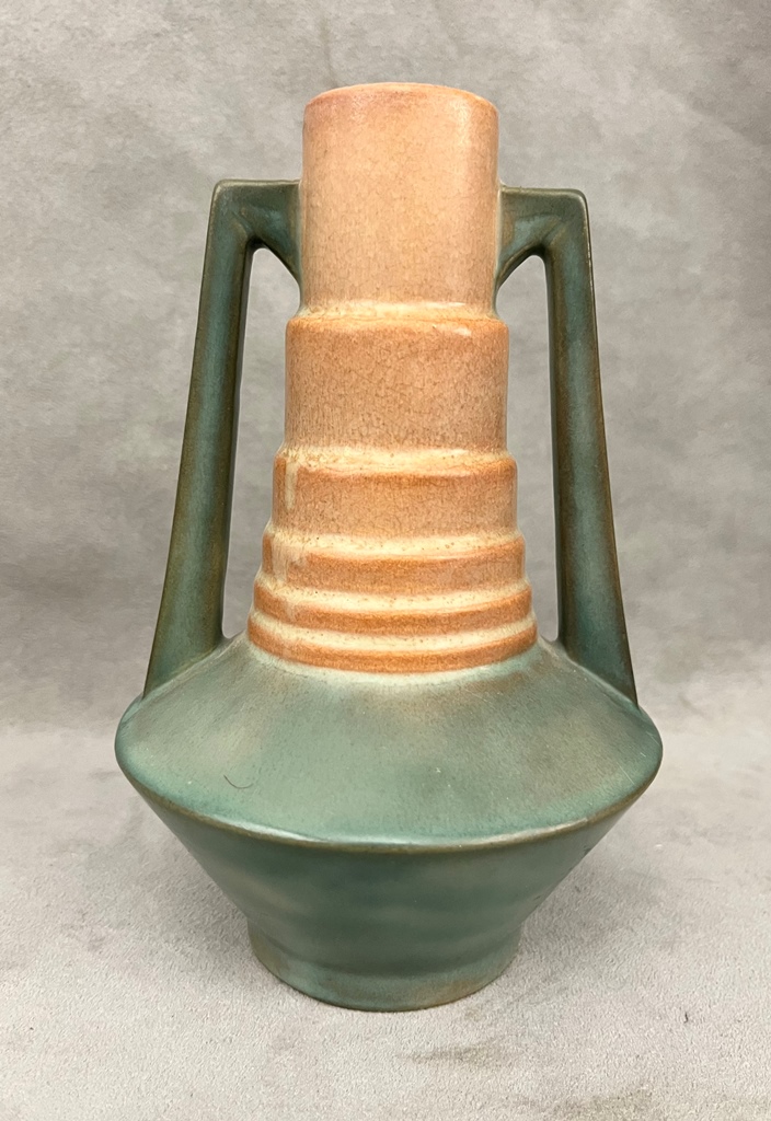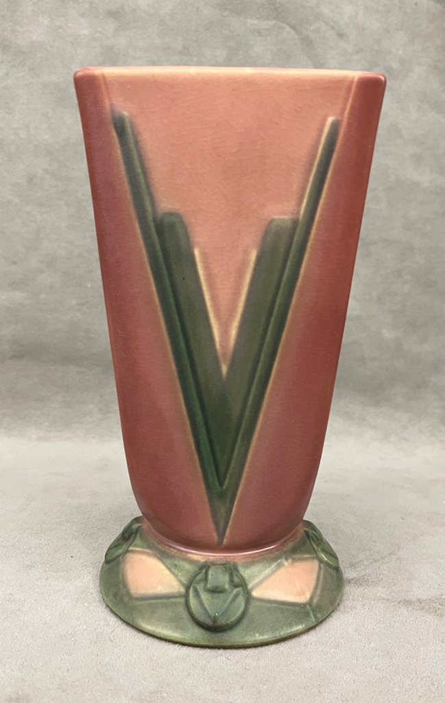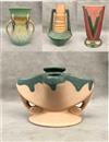 FOUR PIECES ROSEVILLE ART POTTERY. "Monticello" double-handled vessel, H: 5 3/8 in.; "Futura" double-handled telescope vase, #382-7, H: 7 1/2 in.; "Futura" Victory Vee vase, #399-7, 1928, H: 7 in.; and Carnelian flower frog vase Estimate $150-250
