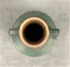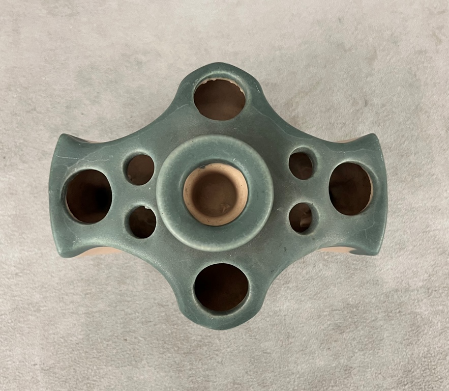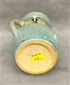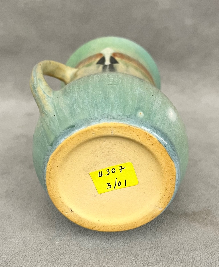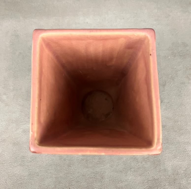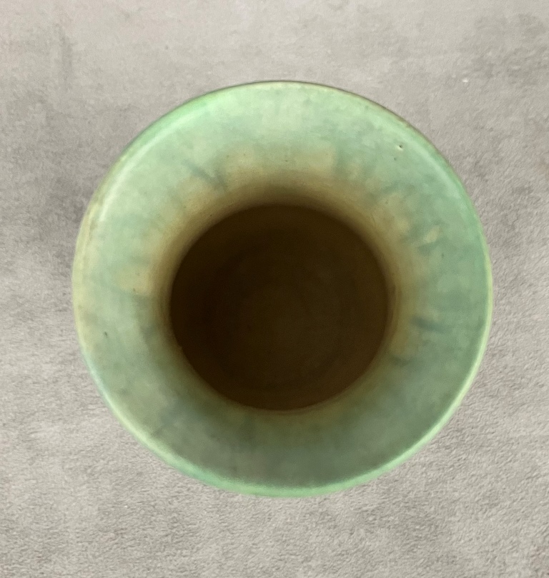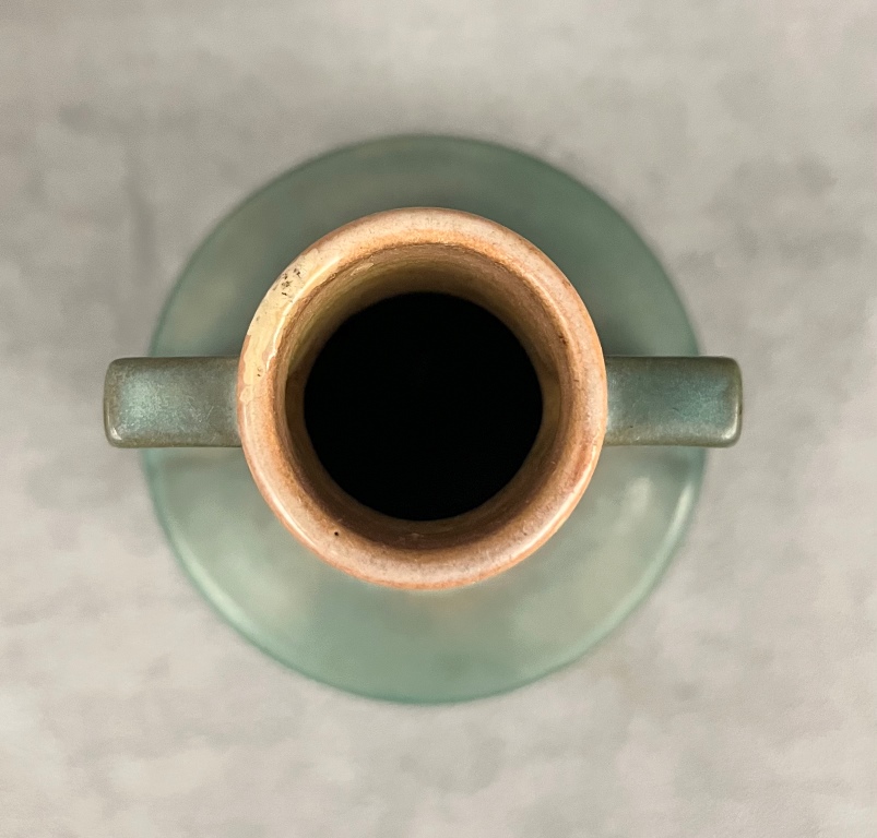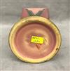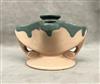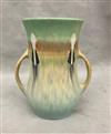 FOUR PIECES ROSEVILLE ART POTTERY. "Monticello" double-handled vessel, H: 5 3/8 in.; "Futura" double-handled telescope vase, #382-7, H: 7 1/2 in.; "Futura" Victory Vee vase, #399-7, 1928, H: 7 in.; and Carnelian flower frog vase Estimate $150-250
