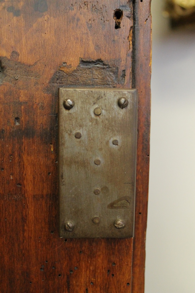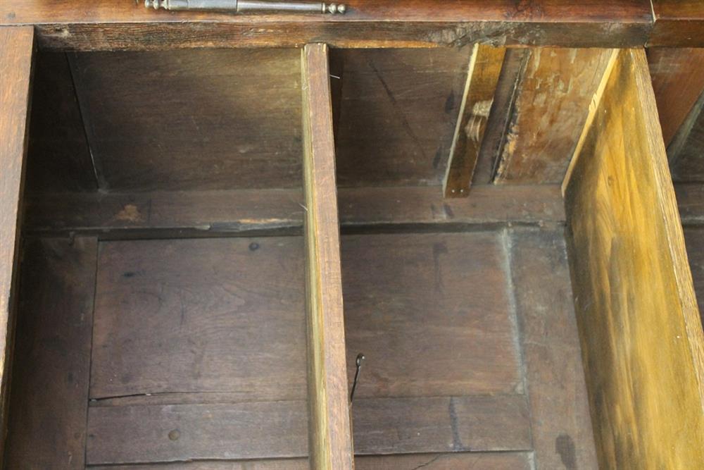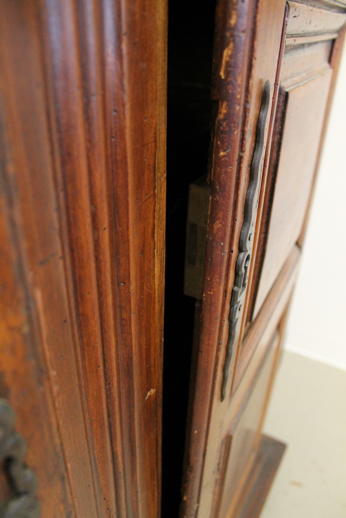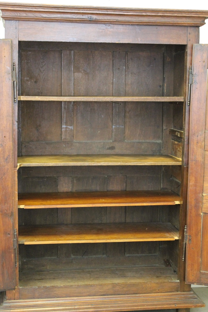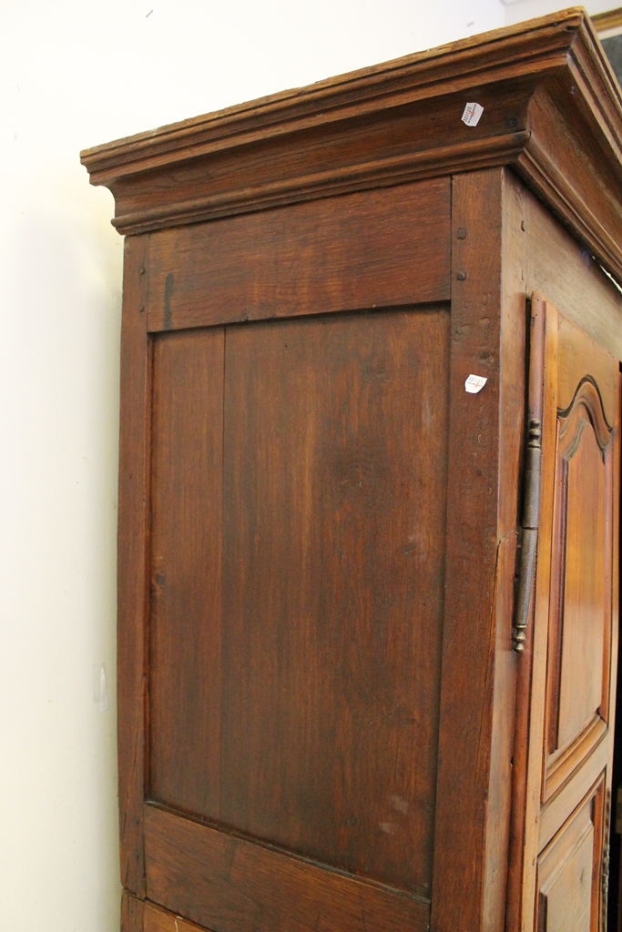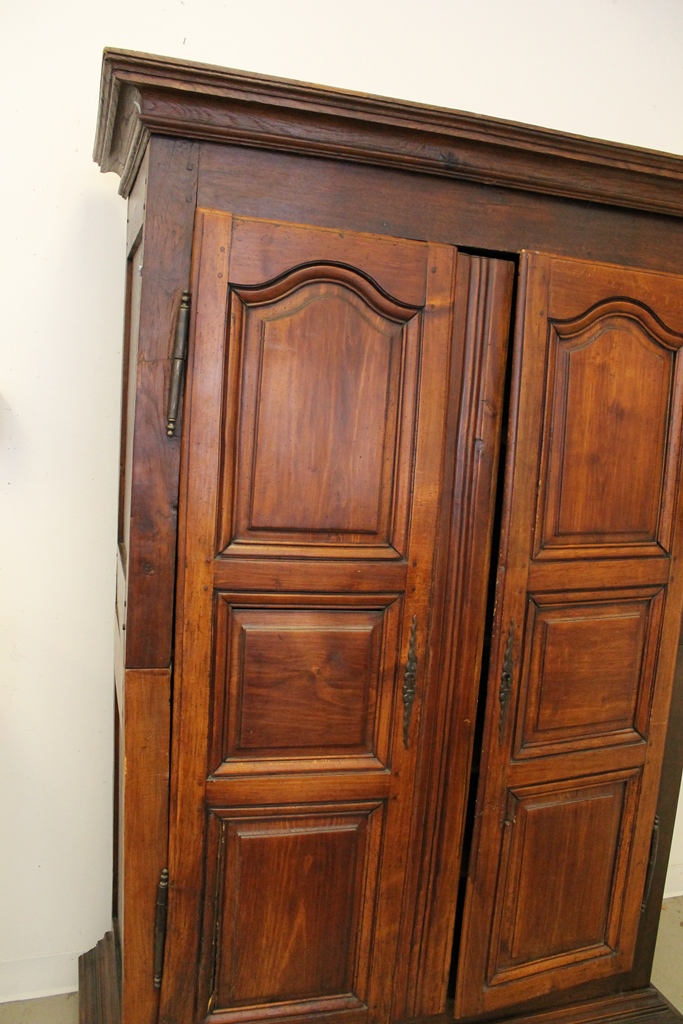 FRENCH PROVINCIAL OAK AND FRUITWOOD TWO-DOME ARMOIRE, 18th century. Flat-molded cornice over pair triple-paneled doors with iron mounts; four interior shelves. - H: 75 in. W: 51 in. D: 22 1/2 in.Estimate $400-600