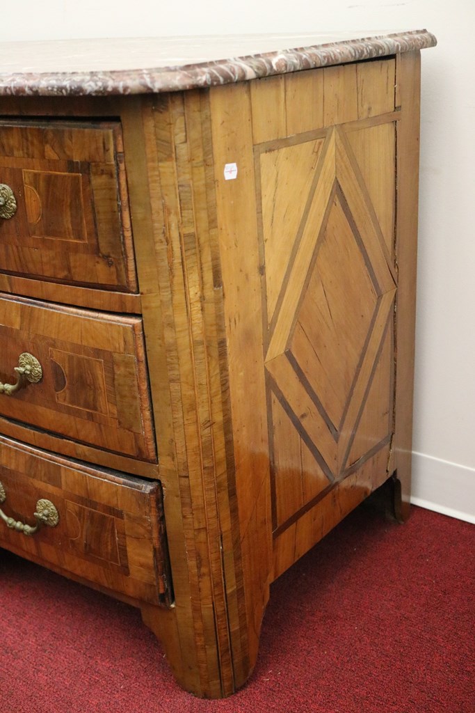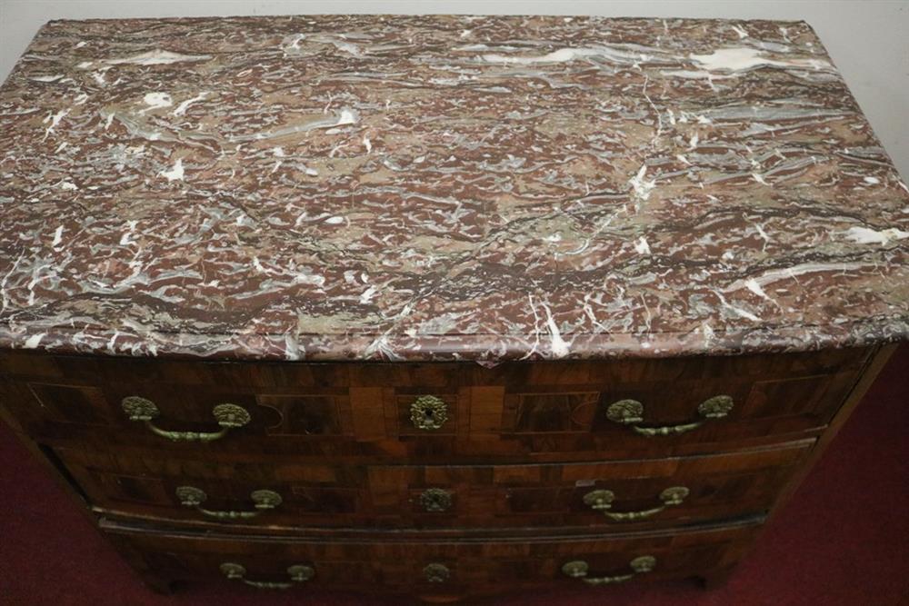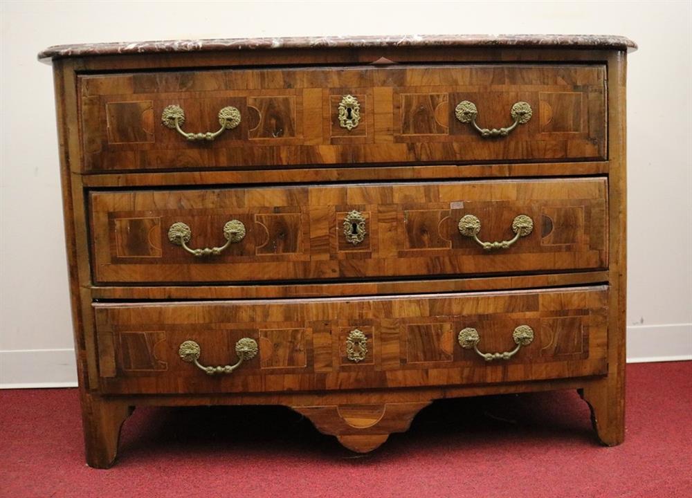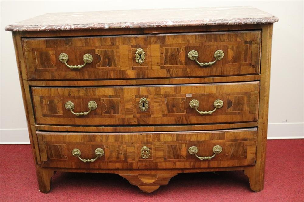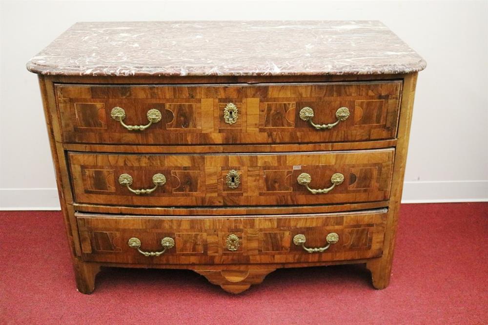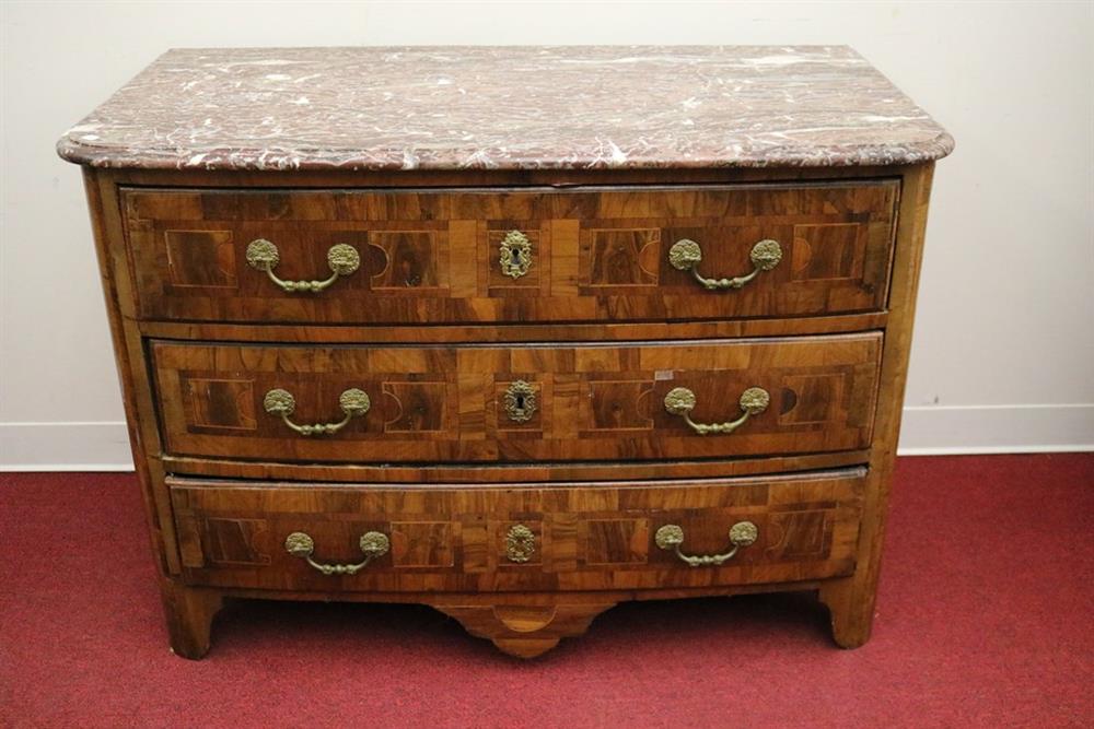 FRENCH REGENCE PROVINCIAL OLIVEWOOD AND PARQUETRY THREE-DRAWER BOWFRONT COMMODE WITH LIVER MARBLE TOP. Possibly Alsace. Shaped apron. - H: 32 1/2". W: 45". D: 23". PROVENANCE:Estate of Baroness Marie-Christine Boulart-Deschamps, Washington, DC Estimate $1,200-1,800