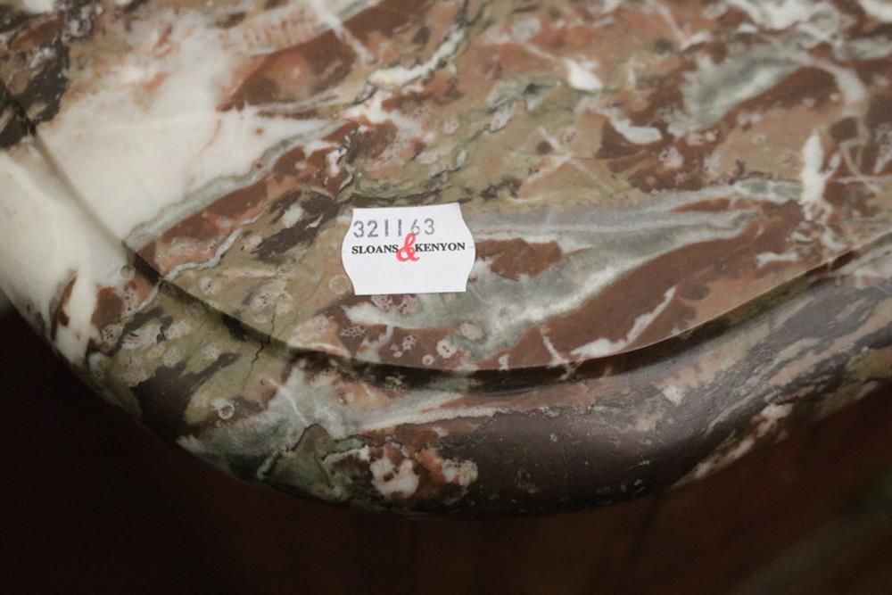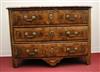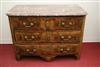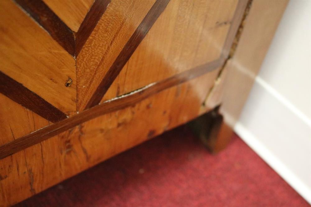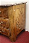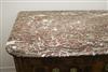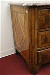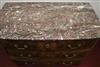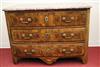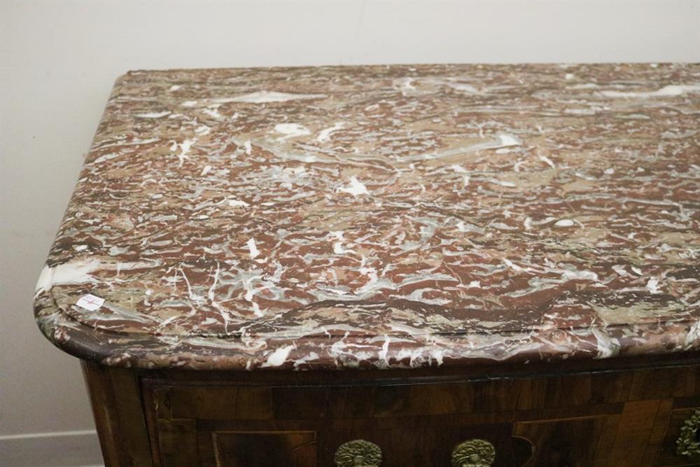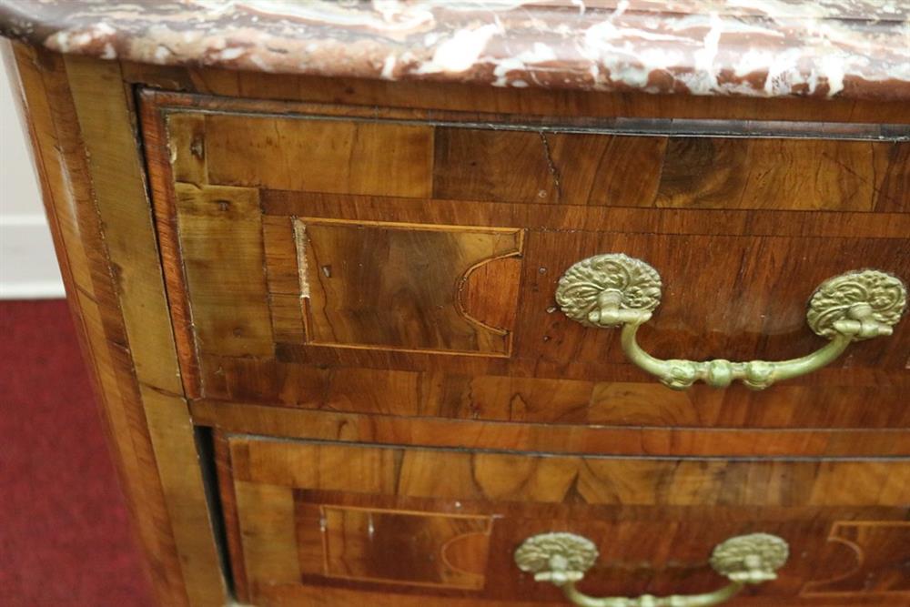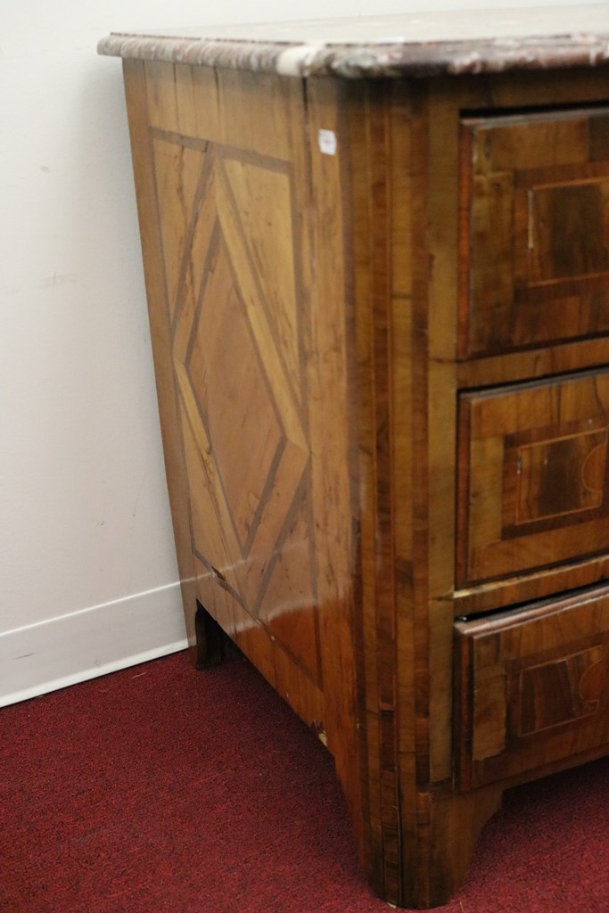 FRENCH REGENCE PROVINCIAL OLIVEWOOD AND PARQUETRY THREE-DRAWER BOWFRONT COMMODE WITH LIVER MARBLE TOP. Possibly Alsace. Shaped apron. - H: 32 1/2". W: 45". D: 23". PROVENANCE:Estate of Baroness Marie-Christine Boulart-Deschamps, Washington, DC Estimate $1,200-1,800