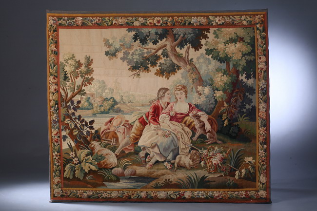 FRENCH TAPESTRY PANEL. 19th century. Worked in polychrome wool threads. Depicting a shepherd and shepherdess in a pastoral landscape, a farm house in the distance; within a scrolling foliate border. With linen backing; stretched on a simple frame - 56 in. x 62 1/2 in.