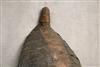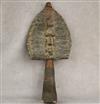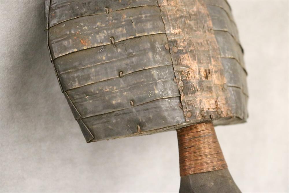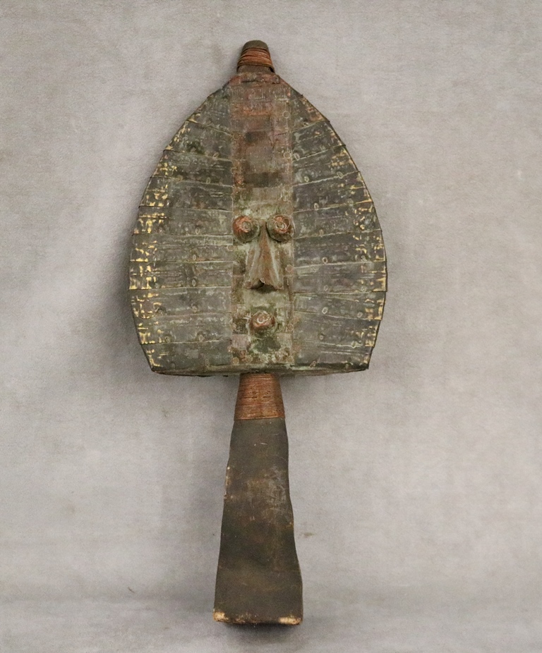 GABONESE KOTA RELIQUARY FIGURE (MBULU NGULU). Kota reliquary figure (Mbulu Ngulu) from Gabon used by the Kota people to guard the remains of their ancestors. The reliquary figure would be placed on top of a basket or container holding the bones of important ancestors. The figures are not portraits but stylized representations meant to embody the power and connection to the ancestors. The structure is a wooden base covered with metal sheets, often copper or brass. - height: 15 inches. Estimate $140-200
