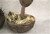 GABONESE KOTA RELIQUARY MAHONGWE FIGURES. Two small Kota reliquary figures, specifically a Mahongwe type, from the northeastern region of Gabon. These figures are associated with the Kota people and are used in ancestor worship practices. They are placed atop baskets or containers holding the remains of ancestors. Constructed from wood, covered with hammered brass and copper sheets. - height: 12 9nches. Estimate $140-200