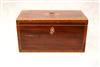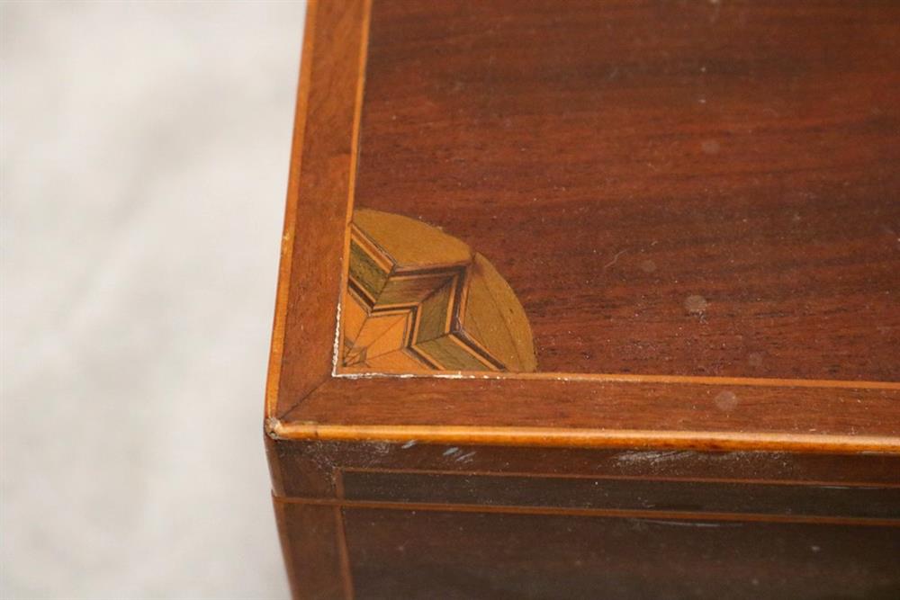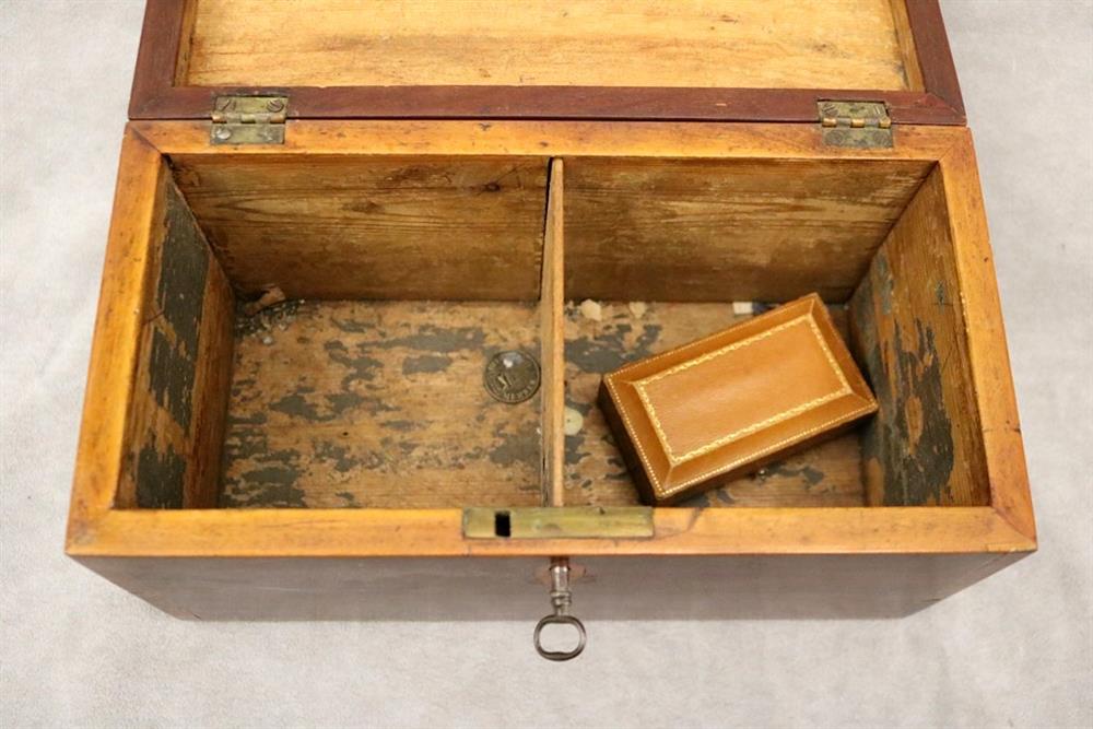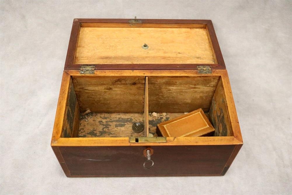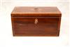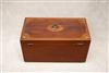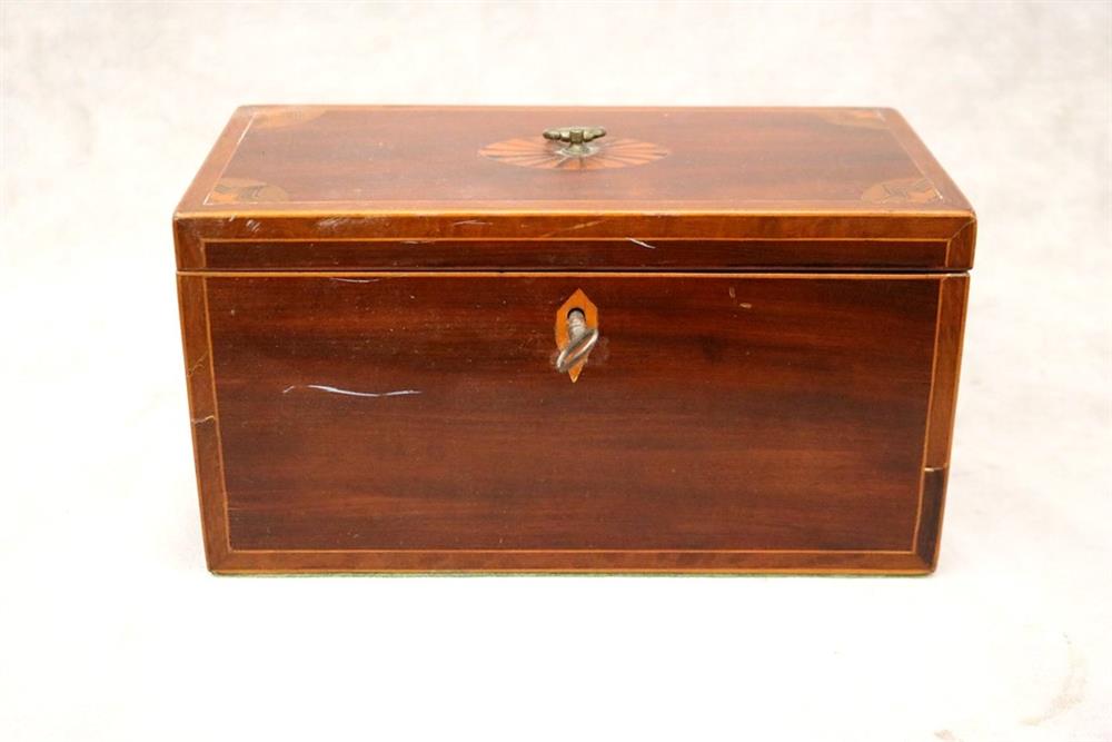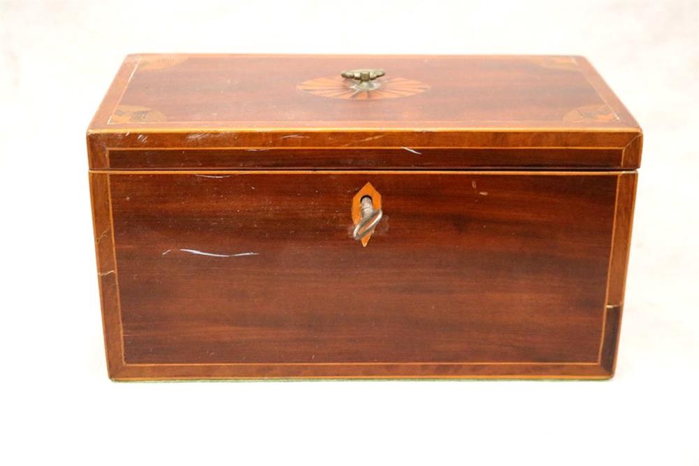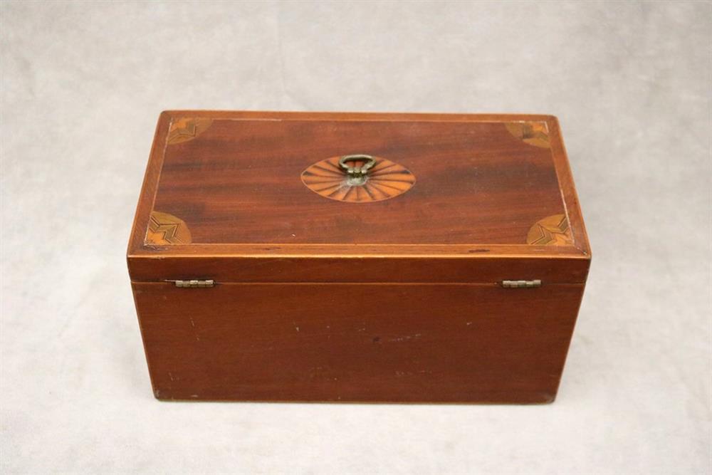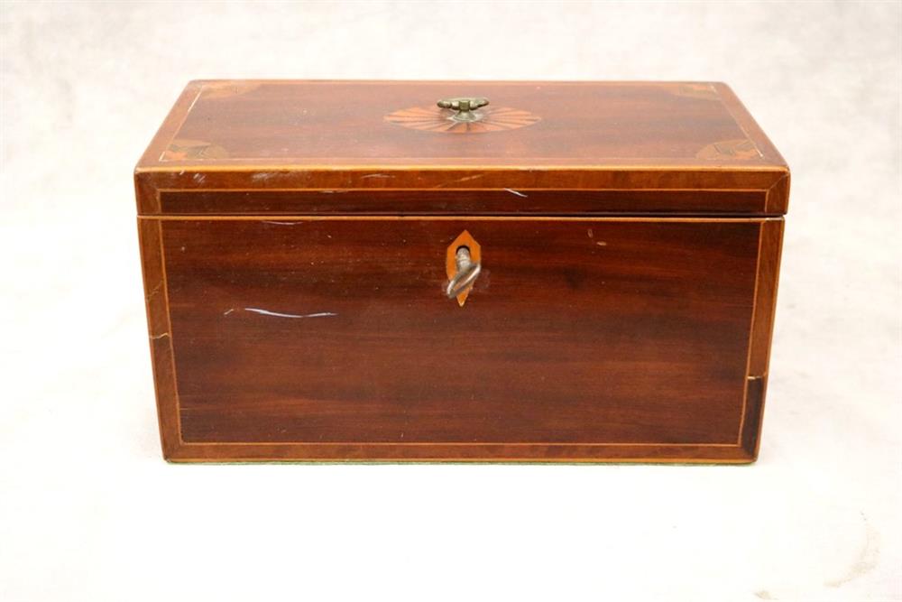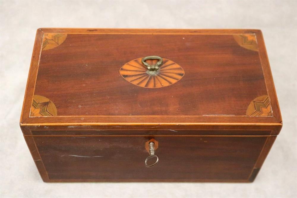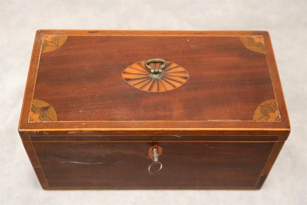 GEORGE III INLAID MAHOGANY HINGED-TOP RECTANGULAR TEA CADDY. Top inlaid with centeral lozenge shape patera and four corner quarter patera; two compartment interior; with key. - Height: 5 1/2". Top, 10 1/4" x 5 1/4".Estimate $100-200