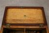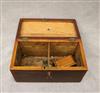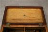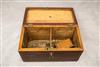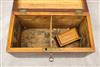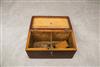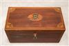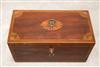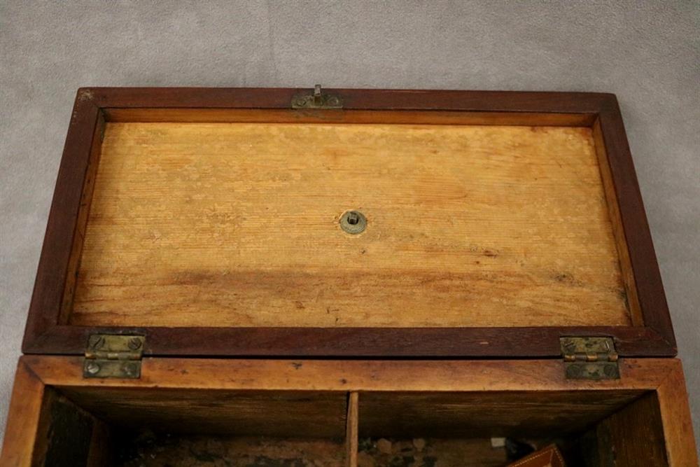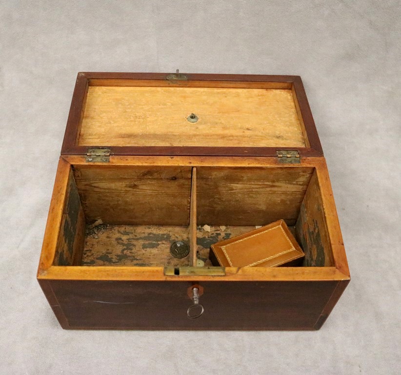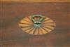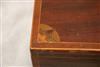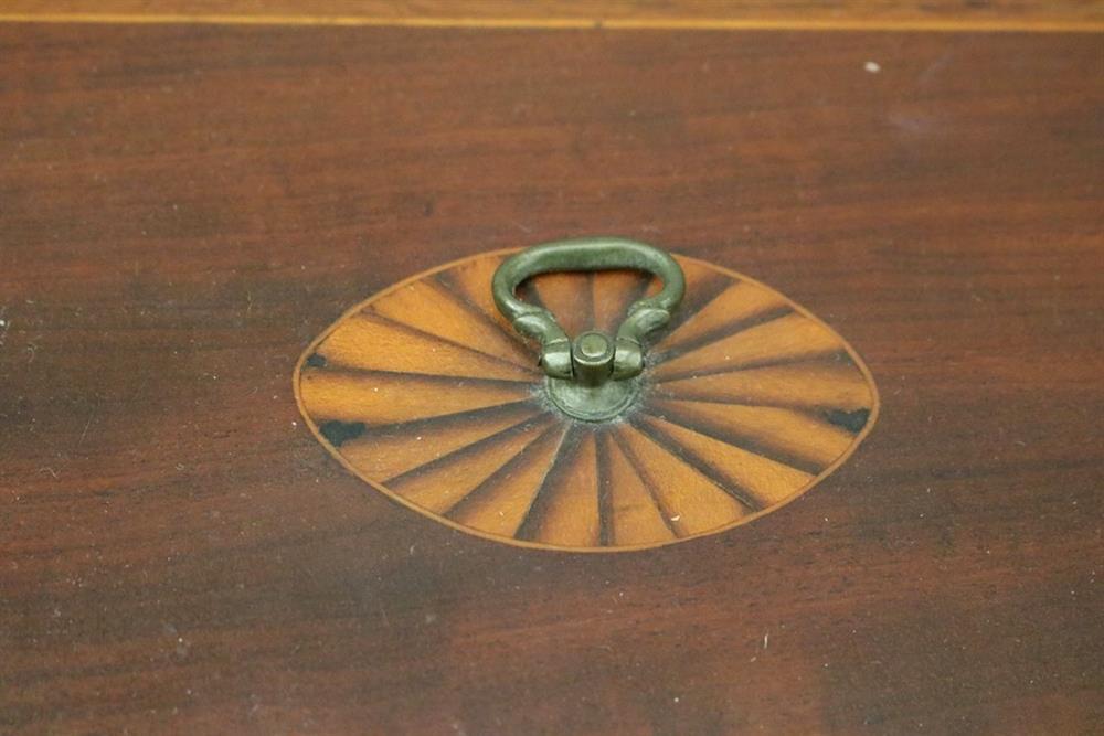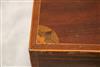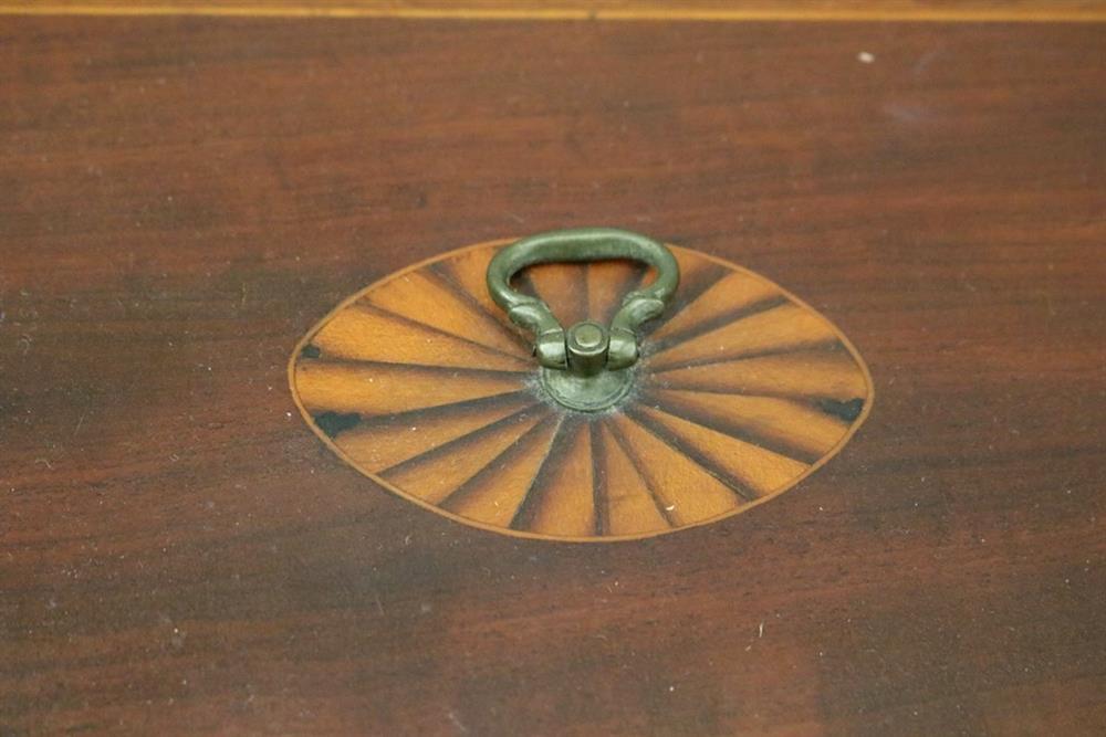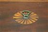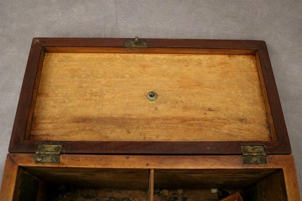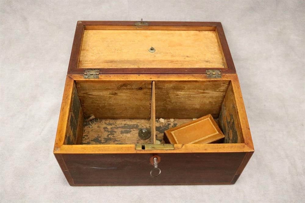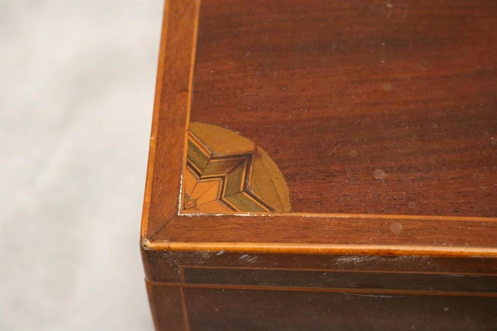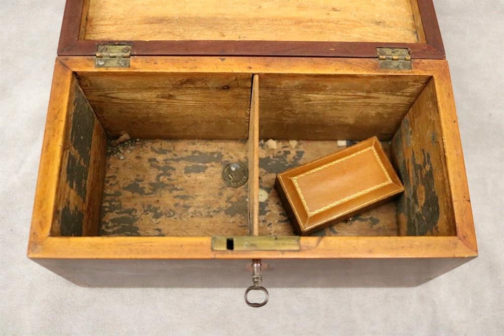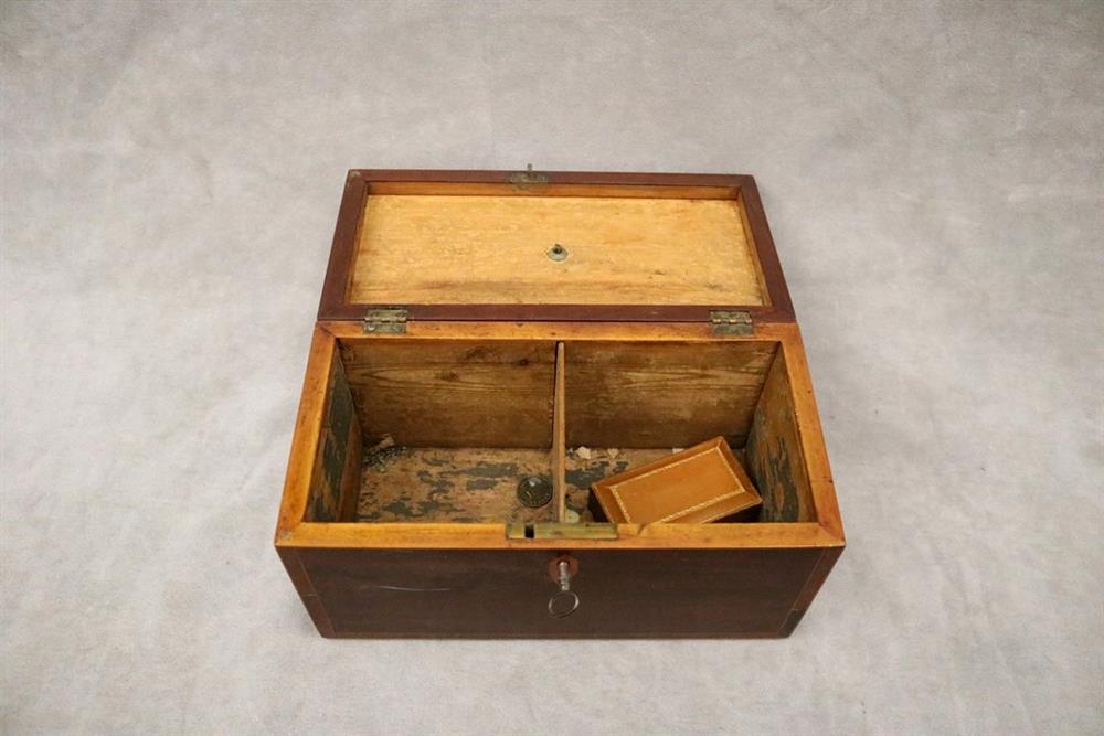 GEORGE III INLAID MAHOGANY HINGED-TOP RECTANGULAR TEA CADDY. Top inlaid with centeral lozenge shape patera and four corner quarter patera; two compartment interior; with key. - Height: 5 1/2". Top, 10 1/4" x 5 1/4".Estimate $100-200