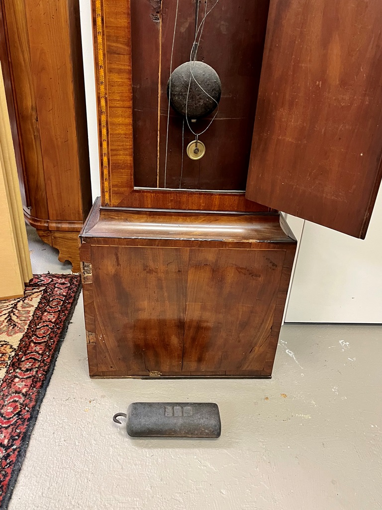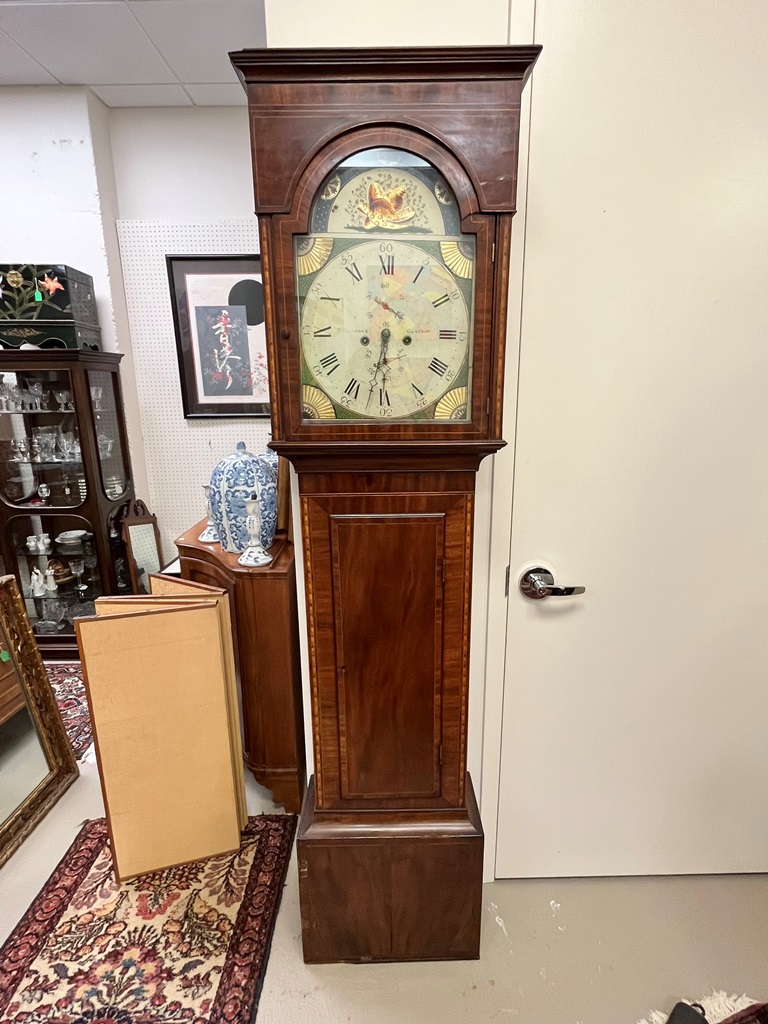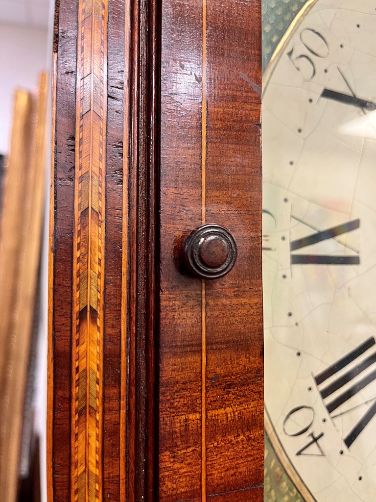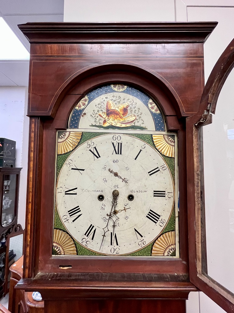 GEORGE III SCOTTISH INLAID MAHOGANY TALL-CASE CLOCK. Face signed T. Cochnone, Glasgow. Flat bonnet and case have line inlay; painted face with gilt spandrels. Lacking bracket feet; with key. H: 81 in.; W: 21 in.; D: 10 in. Imperfections Estimate $200-400