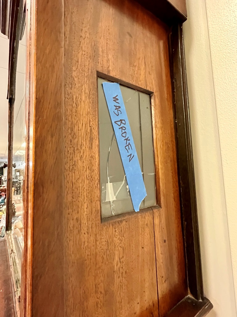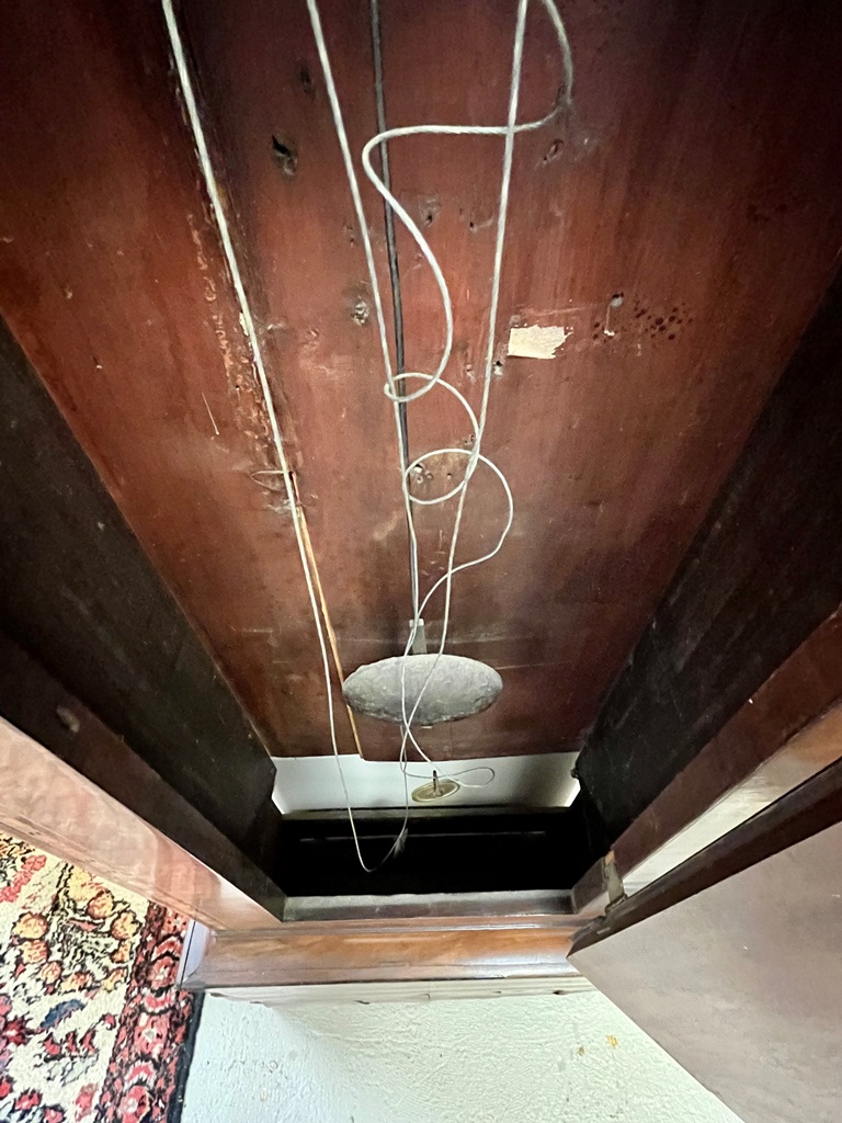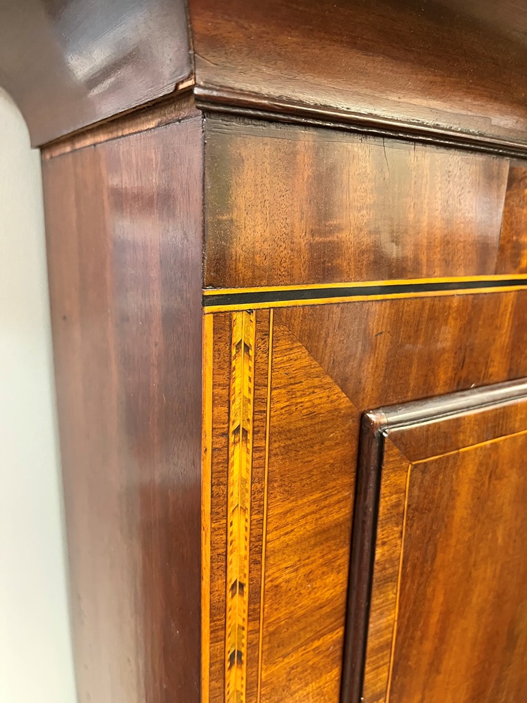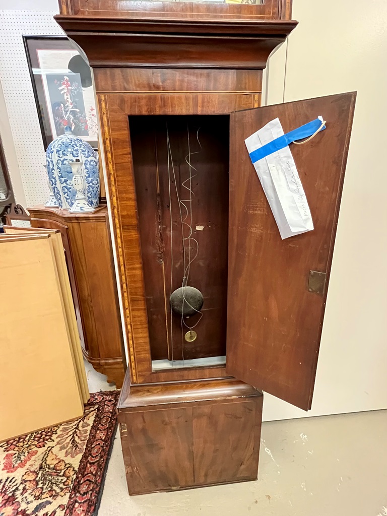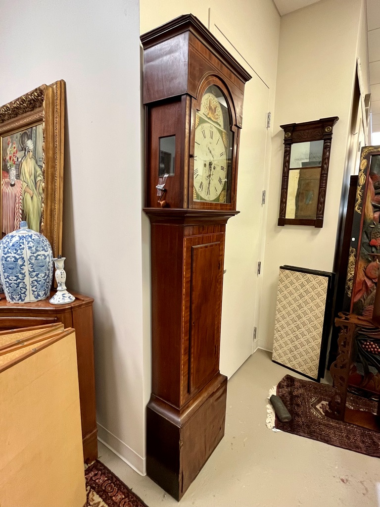 GEORGE III SCOTTISH INLAID MAHOGANY TALL-CASE CLOCK. Face signed T. Cochnone, Glasgow. Flat bonnet and case have line inlay; painted face with gilt spandrels. Lacking bracket feet; with key. H: 81 in.; W: 21 in.; D: 10 in. Imperfections Estimate $200-400