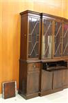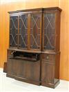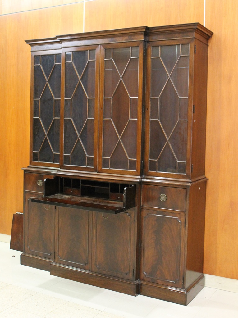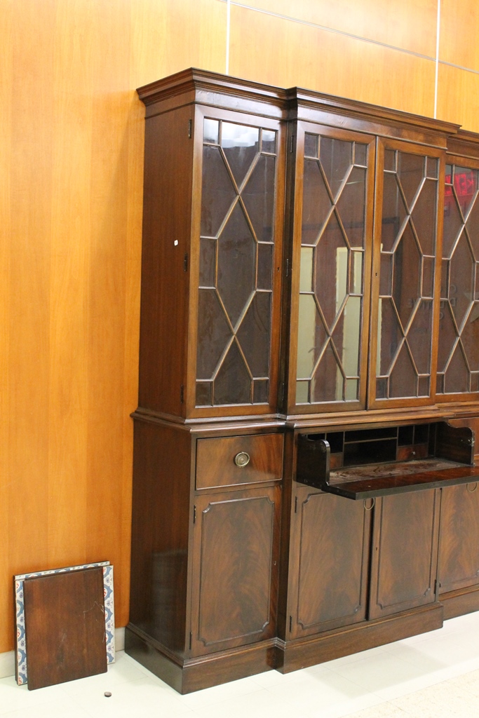 GEORGE III STYLE MAHOGANY BREAKFRONT WITH CENTRAL DRAWER FITTED AS WRITING COMPARTMENT. Upper section has flat, molded cornice over four glazed doors divided by mullions into geometric panes. Lower case has three drawers over four cabinet doors; plinth base - H: 84 in. W: 66 1/2 in. D: 20 1/2 in. Estimate $500-700