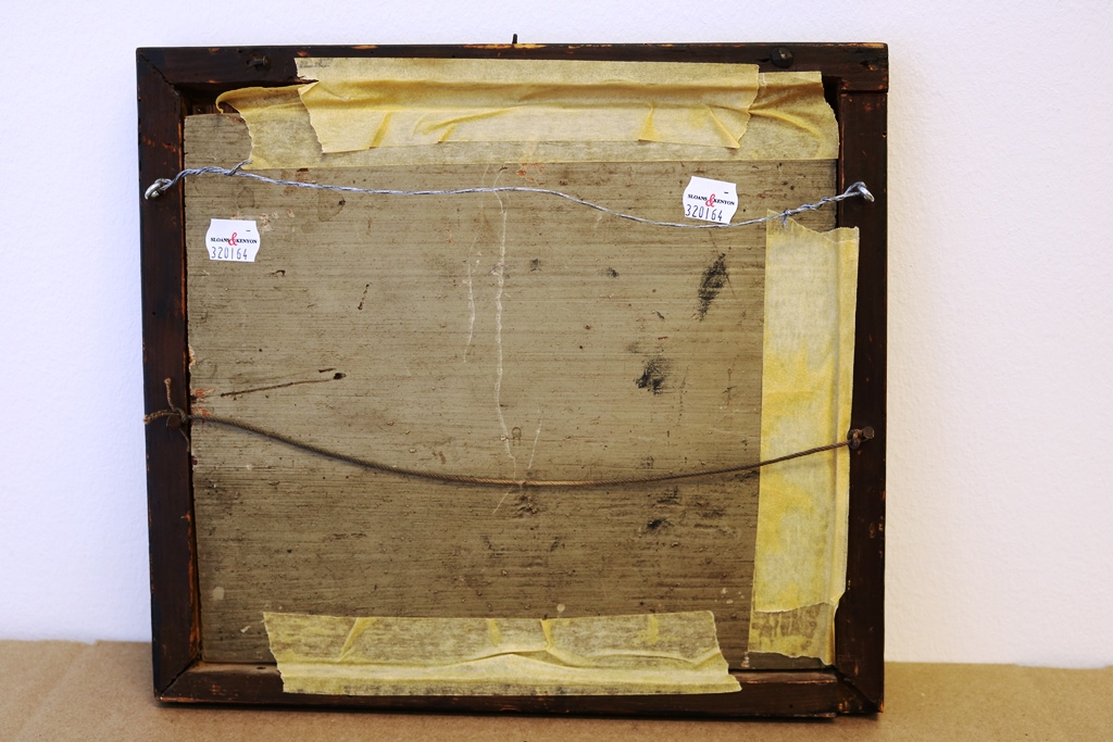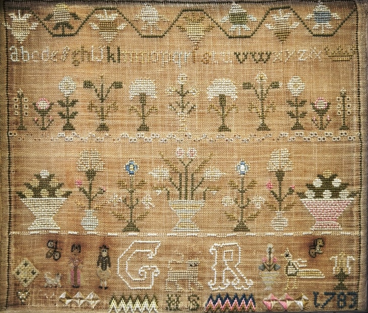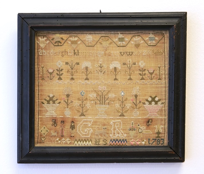 GEORGIAN NEEDLEWORK SAMPLER BEARING KING GEORGE III'S ROYAL CYPHER, INITIALED "HS" AND DATED 1783. Alphabet band, various flowering blossoms, flowers and bushes, and potted plants, and decorative motifs including animals and insects, all surrounding rampant lion flanked by the letters G and R, all above maker's initial's,"HS" and date of 1783 in lower right corner - Framed, 8 in. x 9 in. Estimate $100-150
