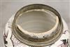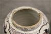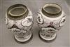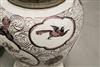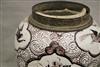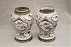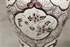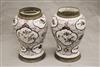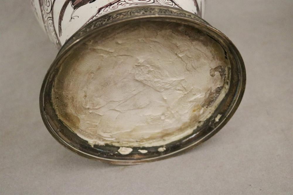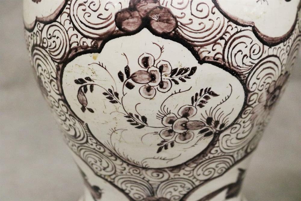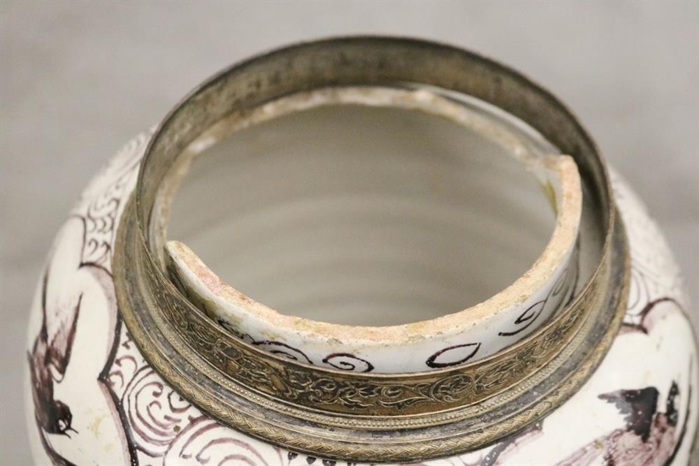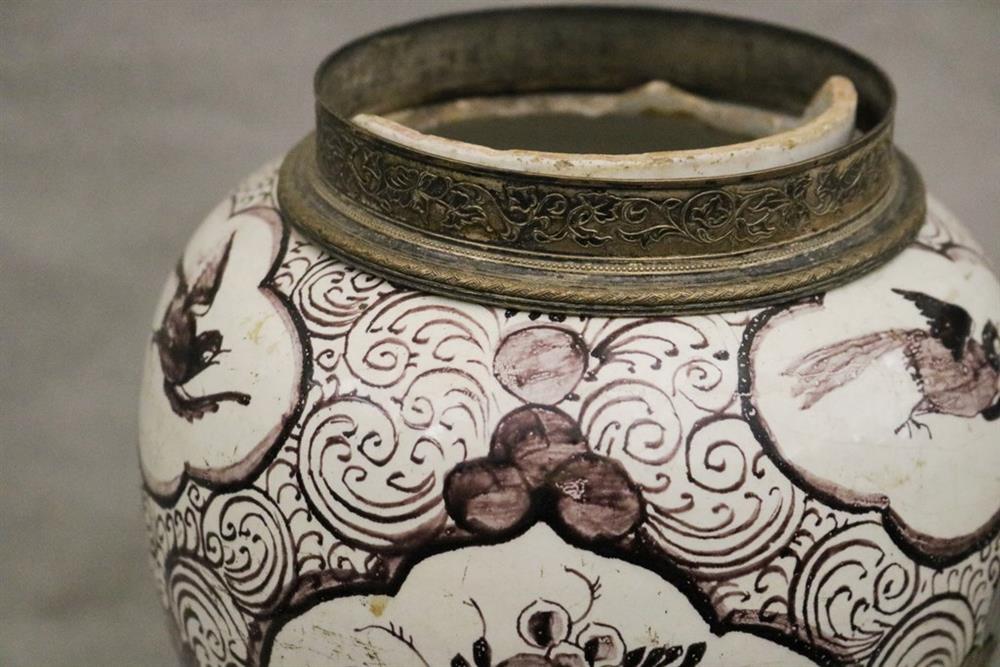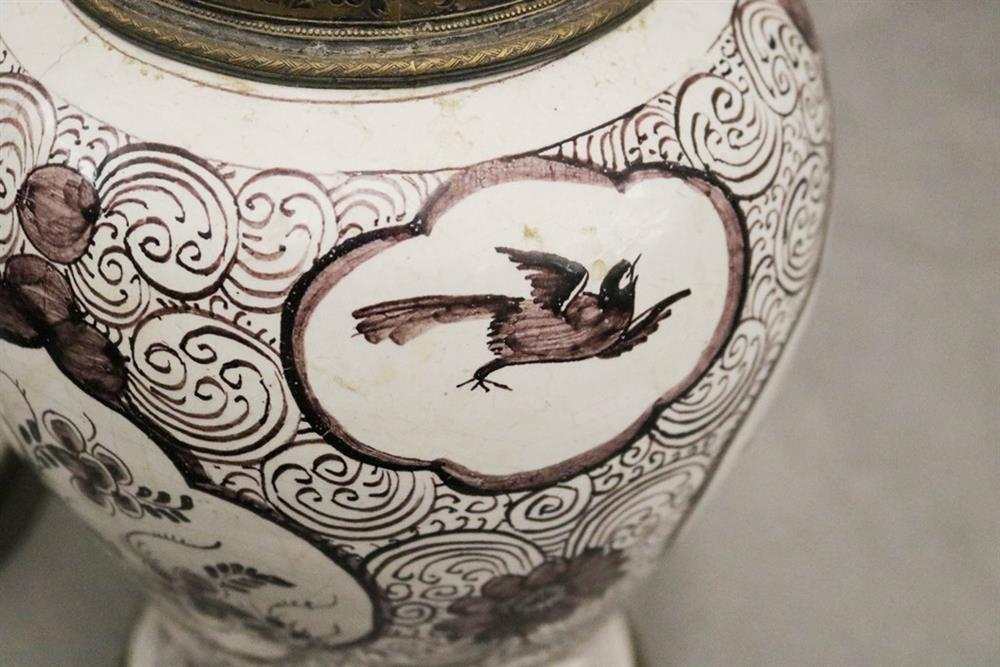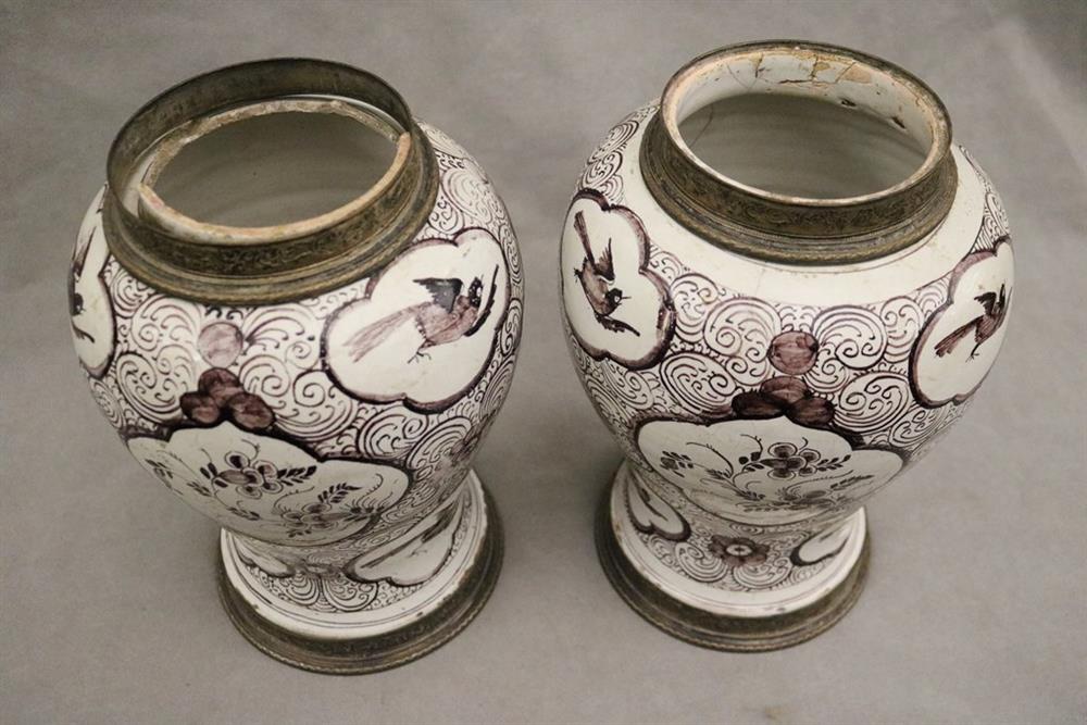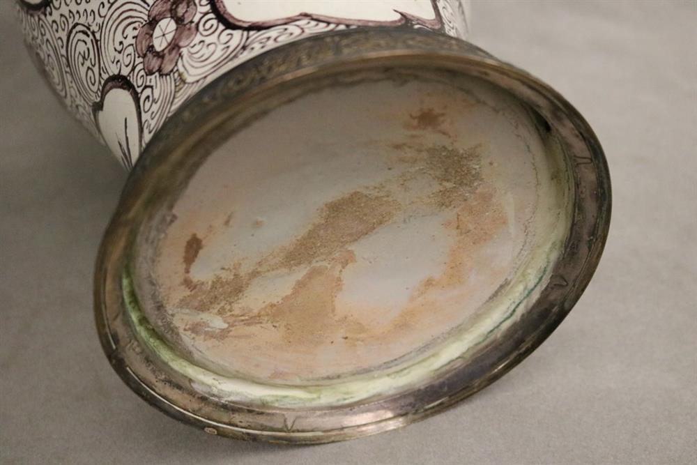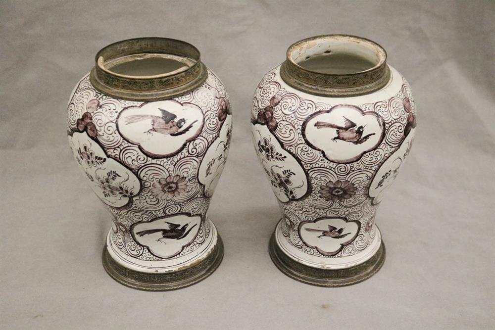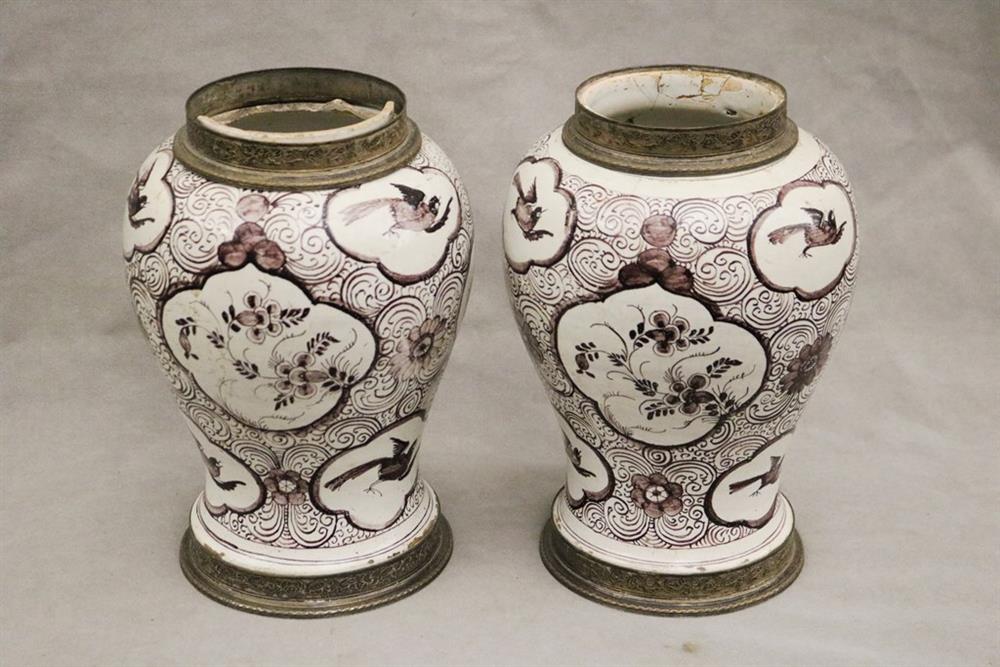 GERMAN FAIENCE AUBERGINE CHINOISERIE-DECORATED CERAMIC BALUSTER-FORM JARS WITH SILVER-PLATED MOUNTS. 18th-19th century. Reserves of floral and bird decoration on grounds with flowerheads and scrolls. (Imperfections and repaired damage). - Height: 11 1/4". PROVENANCE:Estate of Baroness Marie-Christine Boulart-Deschamps, Washington, DC Estimate $200-300