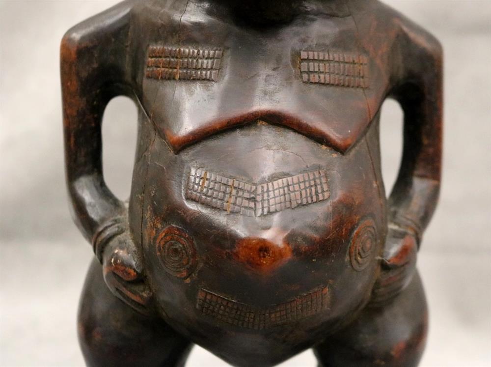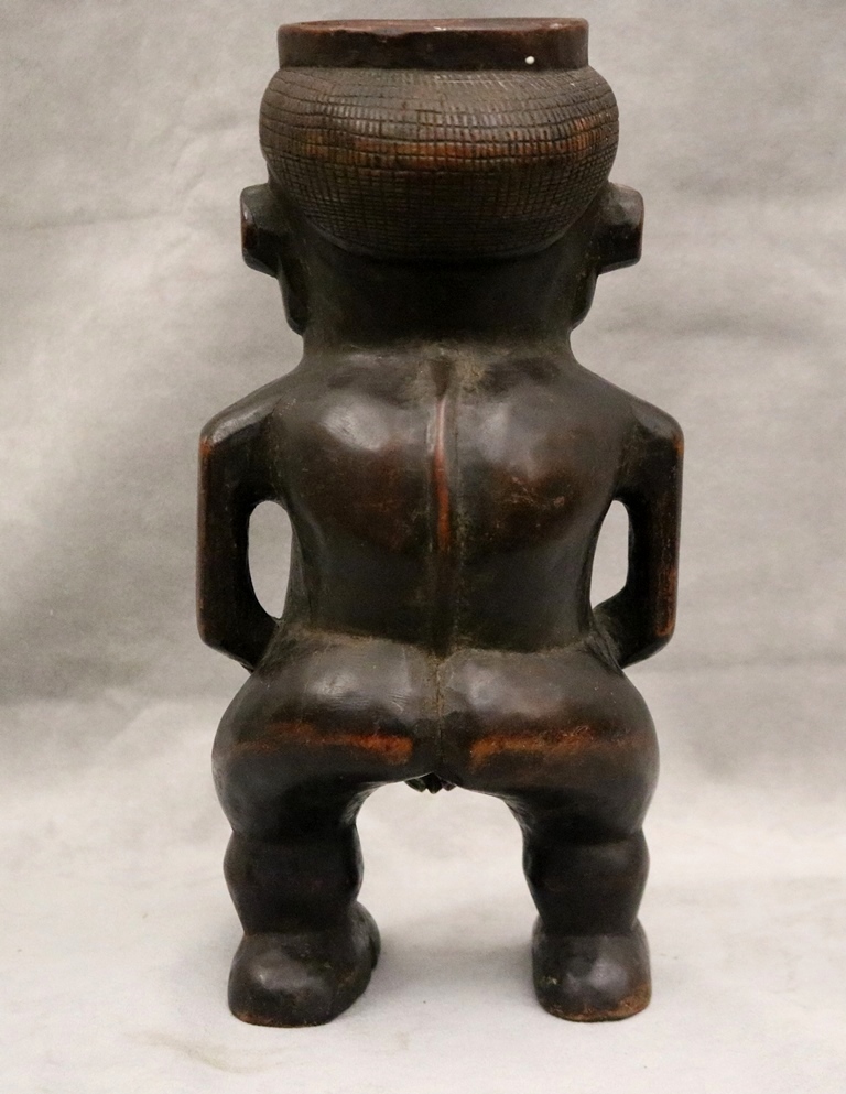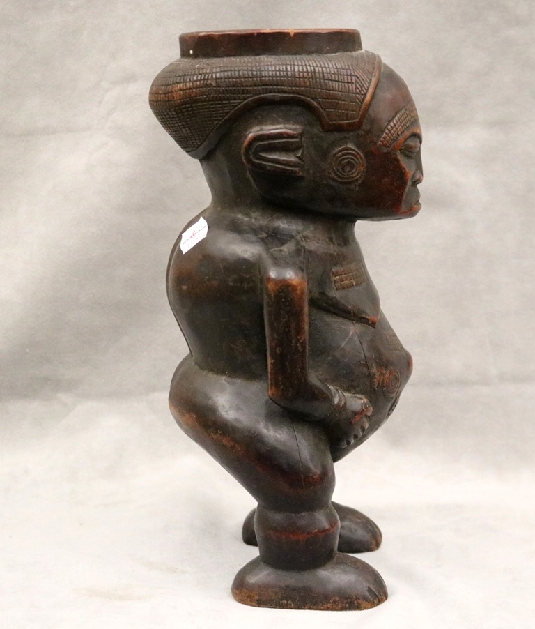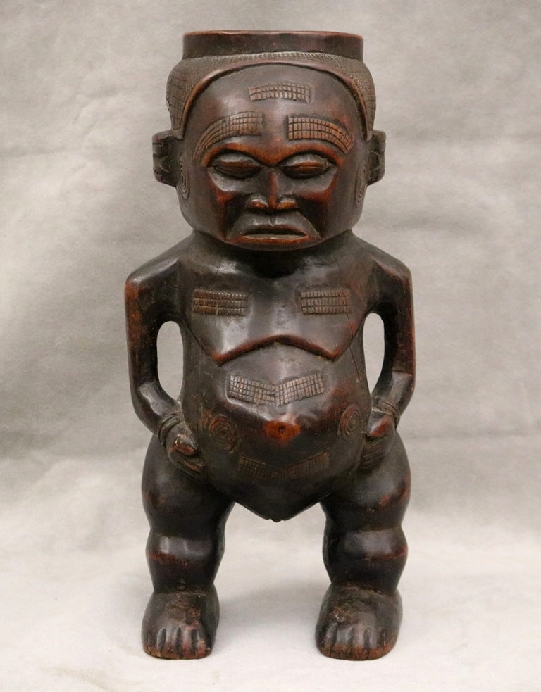 GHANIAN AKAN PALM WINE CUP AKWAABA FIGURE. Palm wine cup or drinking vessel from Ghana, likely an Akwaaba figure, which is a traditional welcome figure. These figures are often placed in shrines to greet visitors and are considered symbols of hospitality. The figure is carved with detailed features, including a prominent belly and facial markings, which are characteristic of Akan art. These vessels are not just functional but also hold cultural and spiritual significance in Ghana. - Height: 13 inches. Estimate $170-260