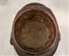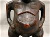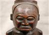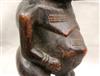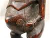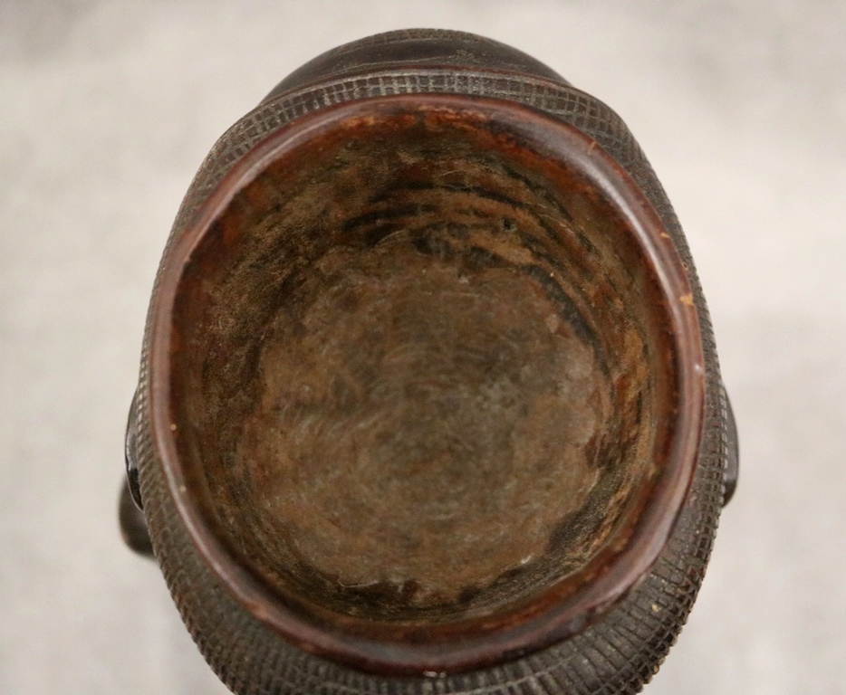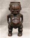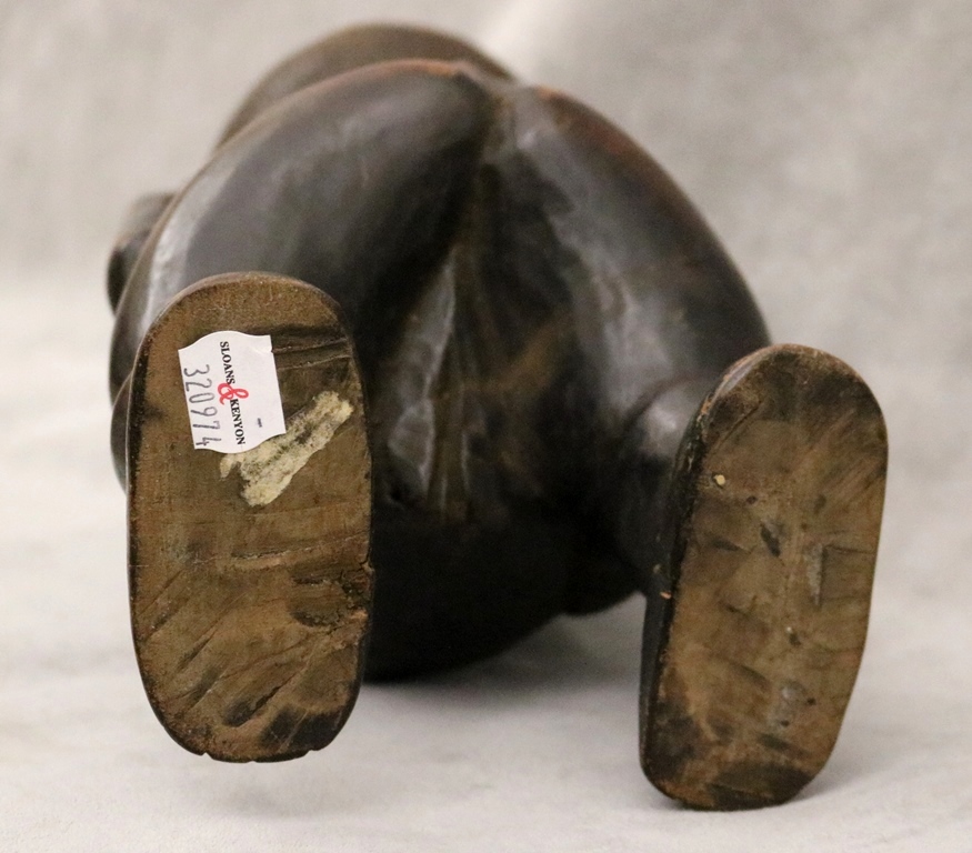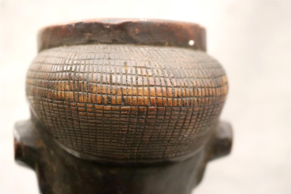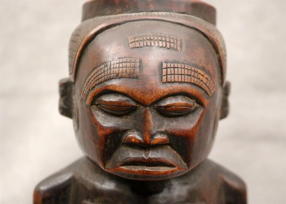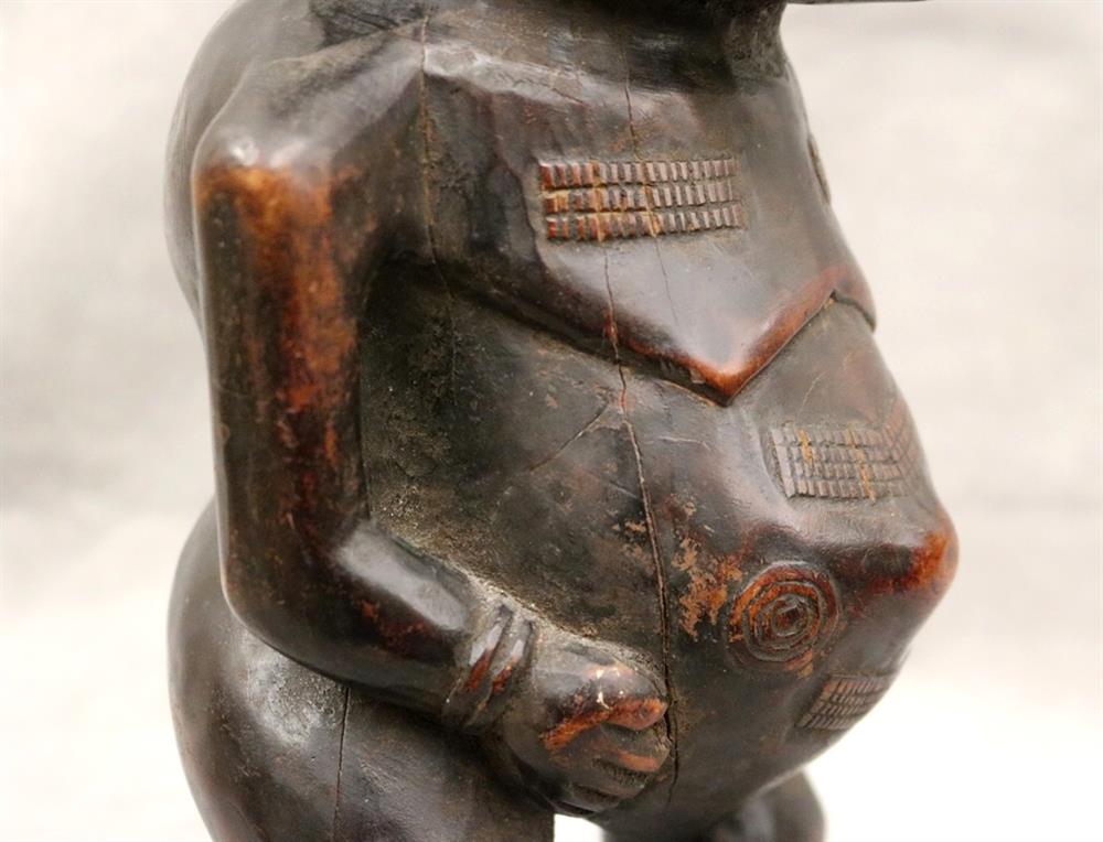 GHANIAN AKAN PALM WINE CUP AKWAABA FIGURE. Palm wine cup or drinking vessel from Ghana, likely an Akwaaba figure, which is a traditional welcome figure. These figures are often placed in shrines to greet visitors and are considered symbols of hospitality. The figure is carved with detailed features, including a prominent belly and facial markings, which are characteristic of Akan art. These vessels are not just functional but also hold cultural and spiritual significance in Ghana. - Height: 13 inches. Estimate $170-260