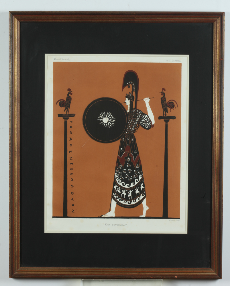 GILTWOOD FRAMED 19TH CENTURY PRALON CHROMOLITHO, ROMAN ANTIQUITIES, Published Paris, Instituto di Correspondenza Archeologica, 1864-78. Giltwood framed, of the period, chromolithograph by Pralon, from Monumenti Inediti, titled Vasi panatenaici, Volume X, Tab. XLVIIIc (xxxxx-x). Professionally framed in double matboard, uv plexiglass and giltwood moulding. - Framed: 30 1/16" high x 24" wide. Estimate $200-300 From the Collection of The Old Print Gallery, Washington, DC. Both chromolitho and framing in good conditon.