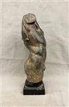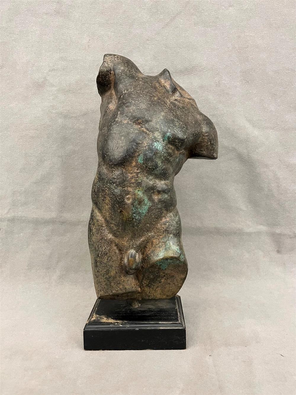 GRECO ROMAN BRONZE MALE TORSO NUDE, Early 20th century. A Greco-Roman bronze male nude torso atop a wooden base. Statue with a natural slight green patina. - Height (including base): 14.5 inches.Estimate $250-350