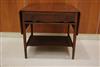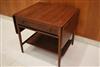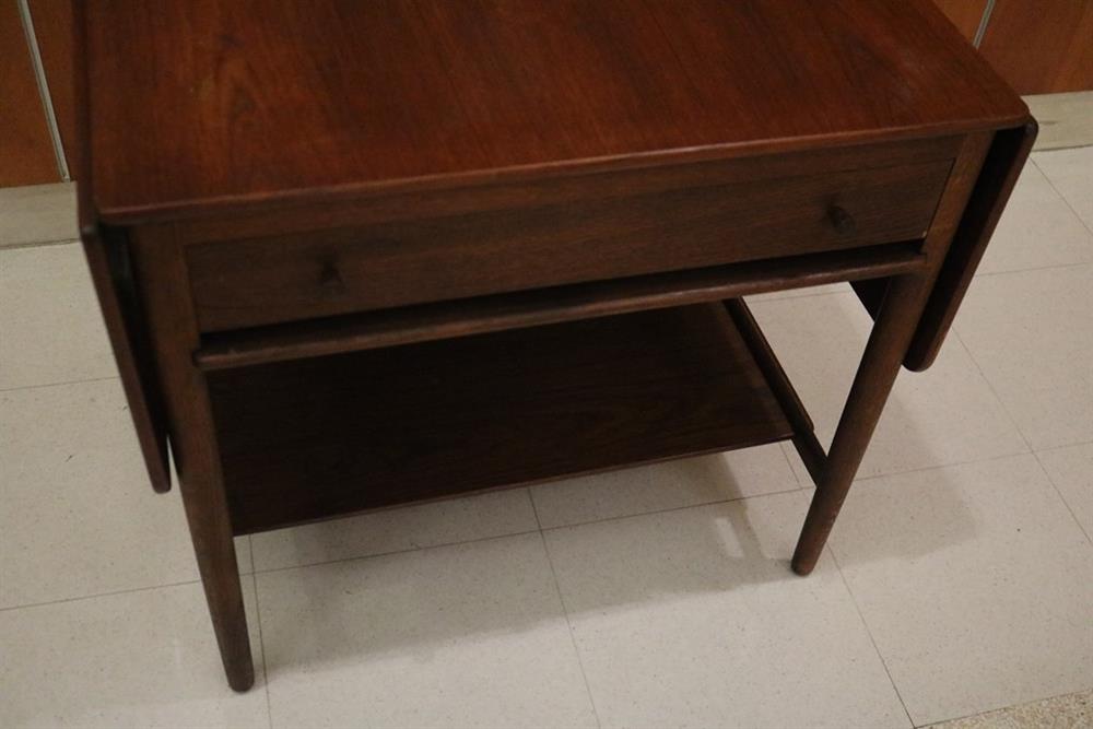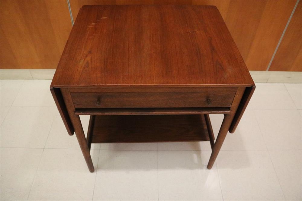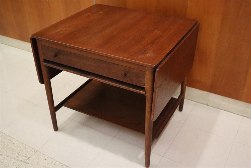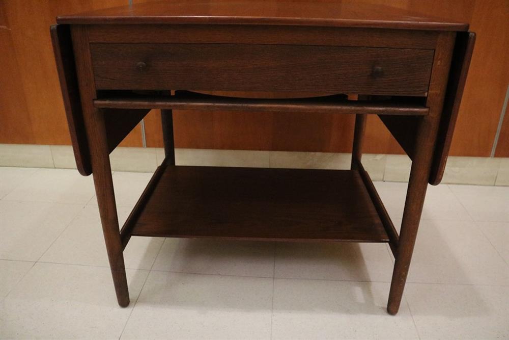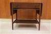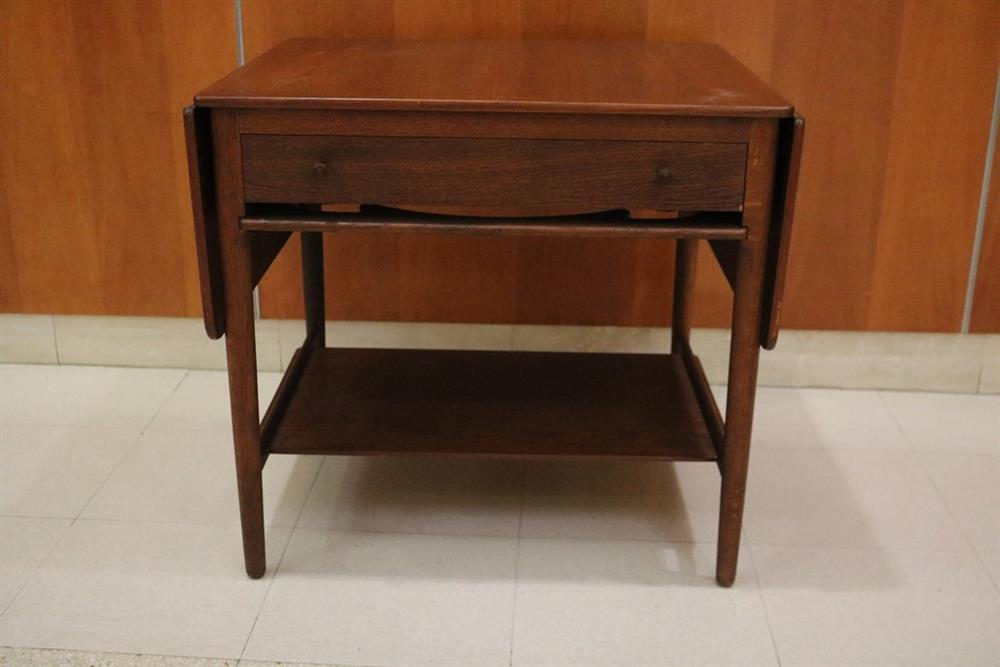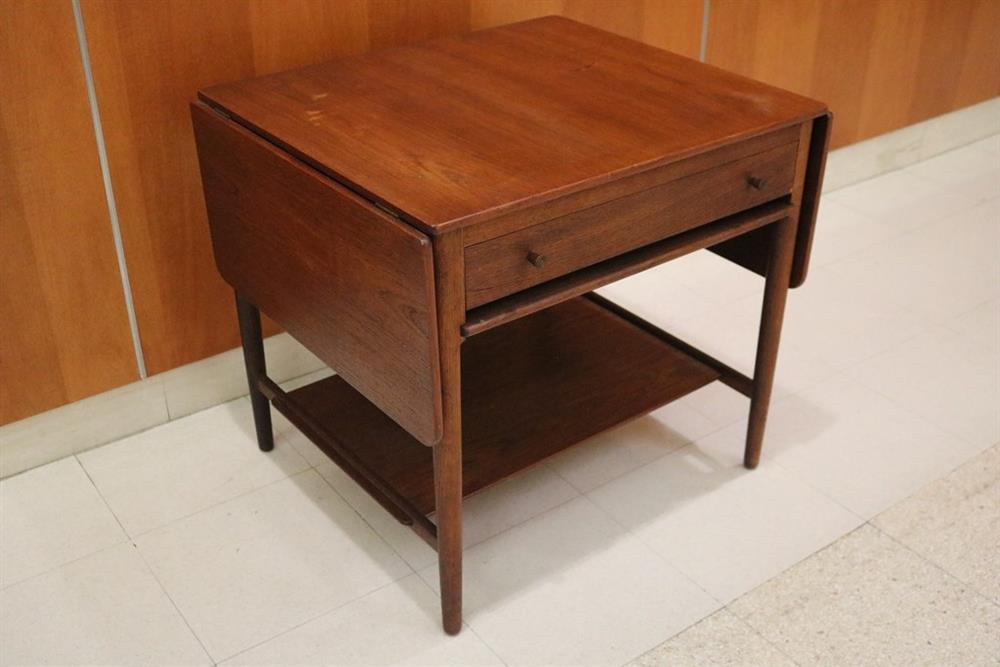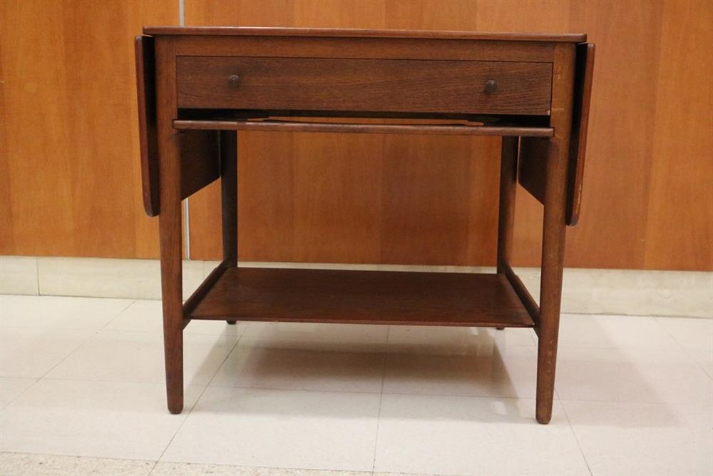 HANS WEGNER MID-CENTURY MODERN ROSEWOOD SEWING TABLE WITH FOLD-OUT EXTENSIONS. Missing under-hanging basket; some light surface wear consistent with age