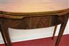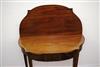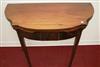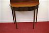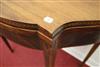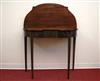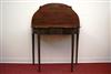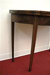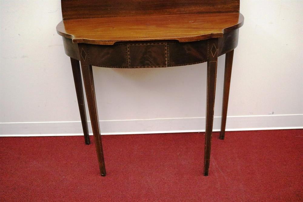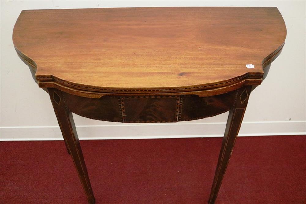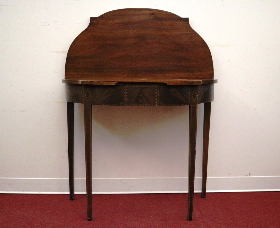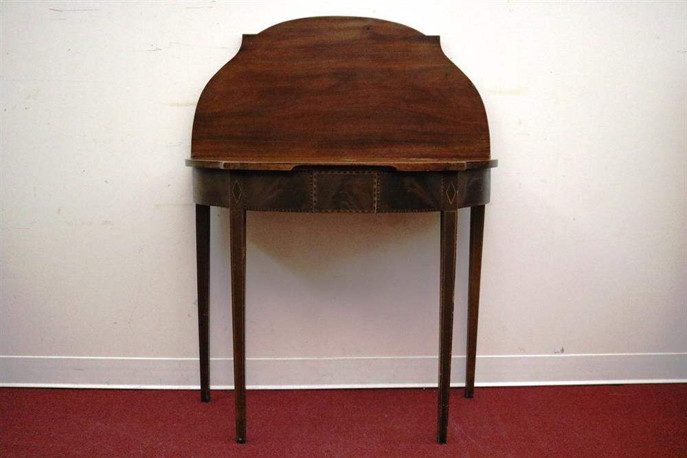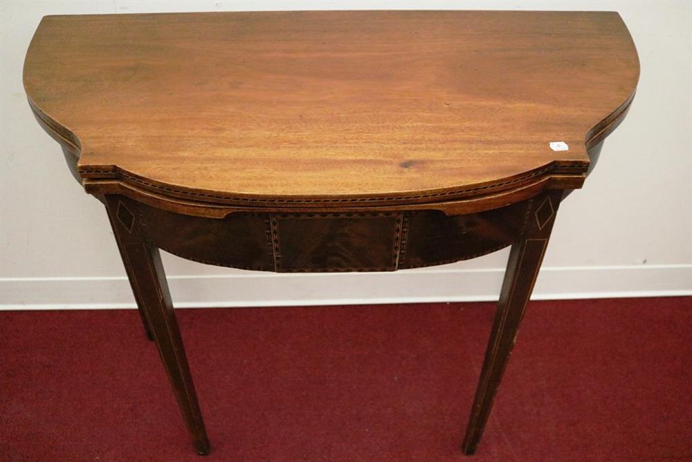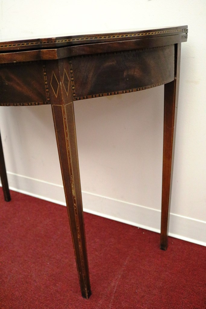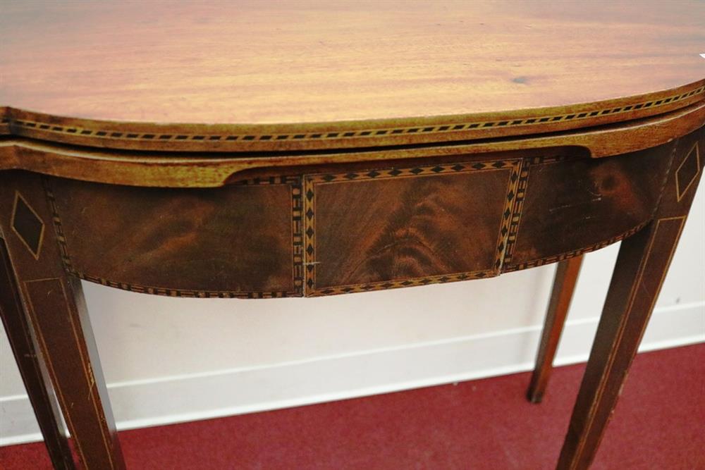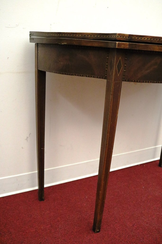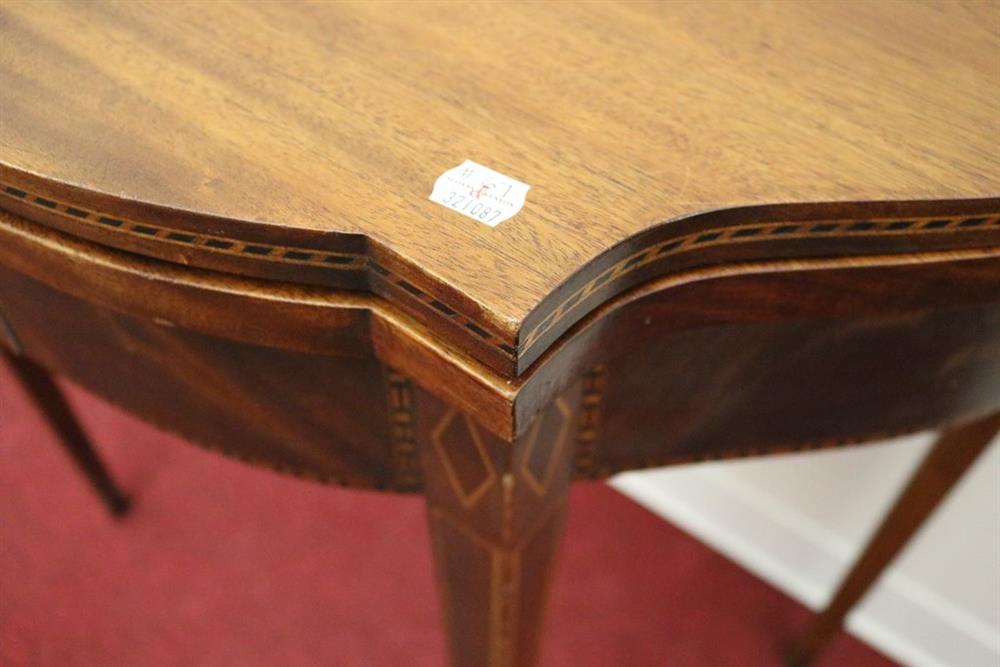 HEPPLEWHITE-STYLE INLAID MAHOGANY FOLD-TOP SWING-LEG CARD TABLE. 19th century. Shaped demilune with tapering square legs; apron centers tablet; inlaid throughout with geometric banding - H: 30 1/2 in. (folded). Top, 34 in. x 35 3/4 in., opened. Estimate $200-300
