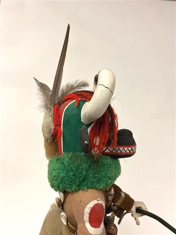 HOPI PUEBLO WAKAS (COW) KATSINA DOLL. 20th Century. Hand carved of cotton wood doll, signed "Vic M." on the bottom. Katsina doll with great detail, decorated with fur and seashells. - Height with base: 20".Estimate $250-350
