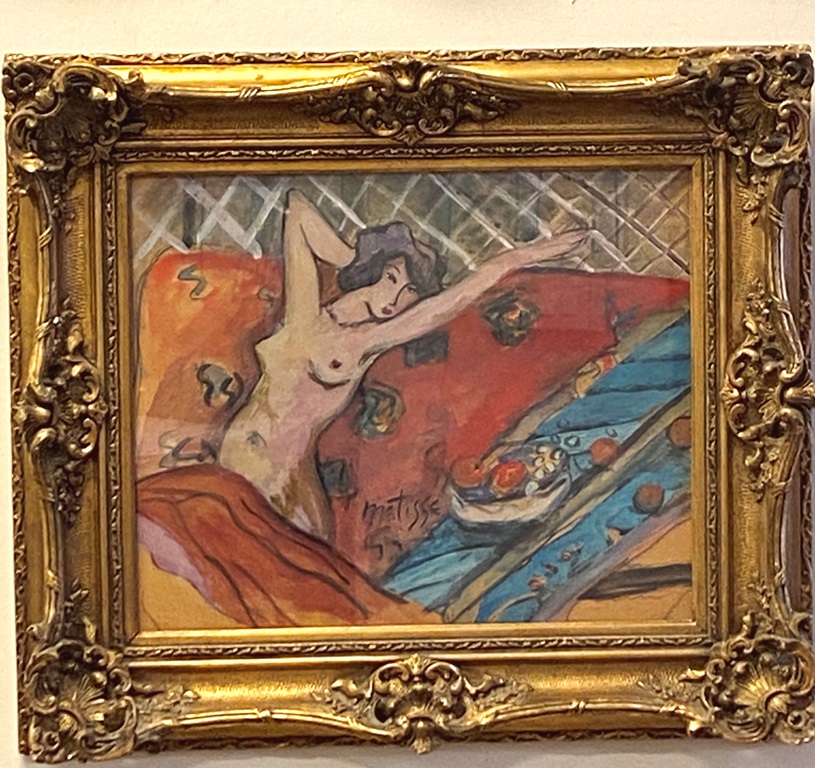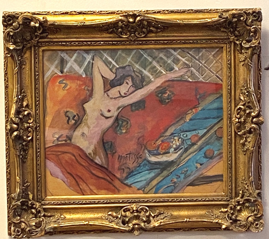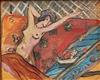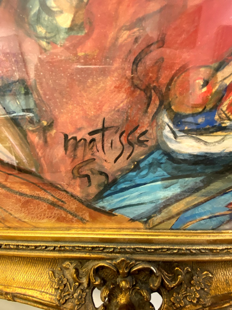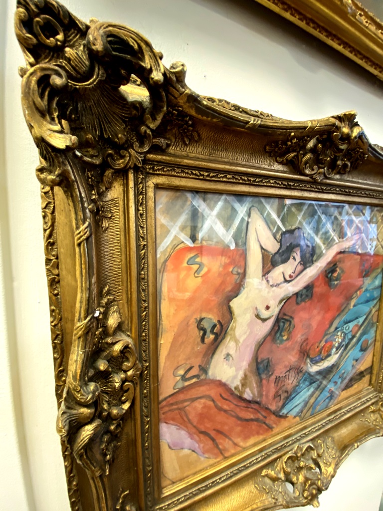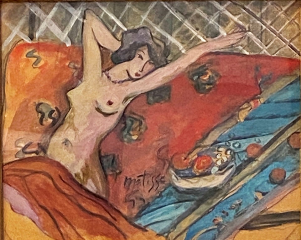 IMITATOR OF HENRI MATISSE (20th century). Nude on a Red Sofa, Mixed media (pencil, watercolor, gouache) on board. Signed "MATISSE 55" at base. Framed. Not examined out of frame. - Sight: 14.5 x 17.5 inches; frame: 22 x 24.5 inches Estimate $250-350