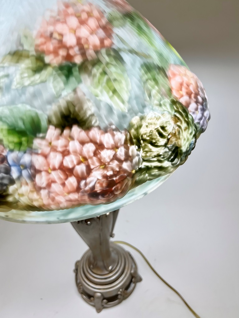 INTERIOR-FLORAL PAINTED PUFFY SHADE ART GLASS TWO-LIGHT TABLE LAMP WITH SILVERED TWO-HANDLE VASIFORM METAL BASE. Shade painted with pink, blue and white hydrangeas with green leaves on light blue textured ground. Shade, D: 14 in. H: 24 1/2 in. Estimate $200-300