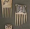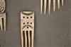 IVORY COAST BAULE AKAN COMBS. Set of five carved combs originating from the Baule people. These combs are traditionally hand-carved, and feature intricate designs and figures, reflecting the rich artistic traditions of the Baule culture. While serving as functional hair tools, Baule combs are also significant cultural artifacts, sometimes incorporating symbolic figures or motifs related to ancestry, beauty ideals, or spiritual beliefs. - Average height: 2.5 to 3 inches. Estimate $150-180