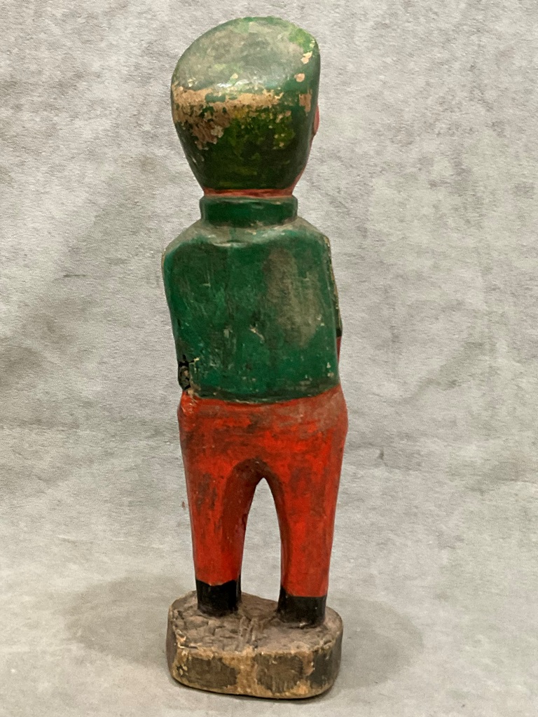 IVORY COAST BAULE PEOPLES WESTERN STYLE COLORFUL MAN WITH HIS CAT. Patinated hand-carved and decorated wooden statue from the Baule ethnic group, from central Ivory Coast. As is the case with this statue, "settlers" were often represented through institutional functions such as doctor, policeman, gendarme or judge. Thanks to African humor, some characters keep black skin and their hands in their pockets. - Height approximately: 18 inches. Estimate $100-120