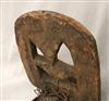 IVORY COAST SENUFO KWORO HEADDRESS. Kworo headdress from the Senufo people of Cote d'Ivoire. These headdresses are used in the Poro society's initiation rites, specifically during the Kworo or second phase of initiation, where initiates undergo a symbolic death and rebirth. The headdress typically features a carved wooden plank mounted on a basketry cap, often depicting stylized animal figures or abstract designs. - Height: 15 inches. Estimate $120-160