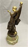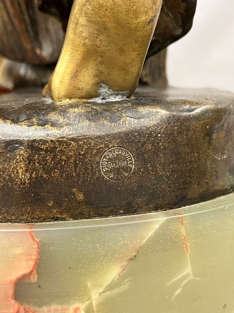 JEAN-LEON GEROME (French, 1824-1904). La danseuse à la pomme (The Dancer with an Apple), Gilt and brown patina raised bronze of a semi-clad girl with long diaphanous dress, balancing on one foot, the other leg outstretched, an apple in her right hand and the hem of her dress held up in her left. It is signed and inscribed 'J.L. GEROME. / C / SIOT-DECAUVILLE / FONDEUR / PARIS' " (foundry stamp) on base. Bronze is raised on a original green marble cylindrical plinth PROVENANCE: Sotheby's / 19th century Furniture / 16 November 2011 / Lot 310 - Height (including base): 24.75 inches Estimate $7,000-8,000