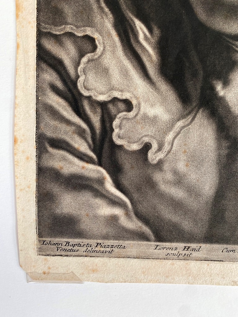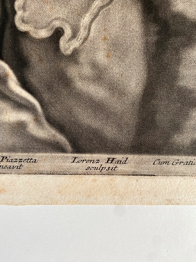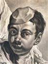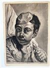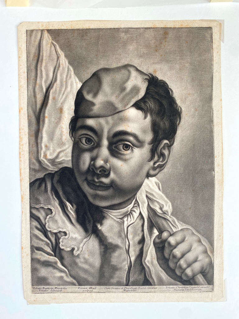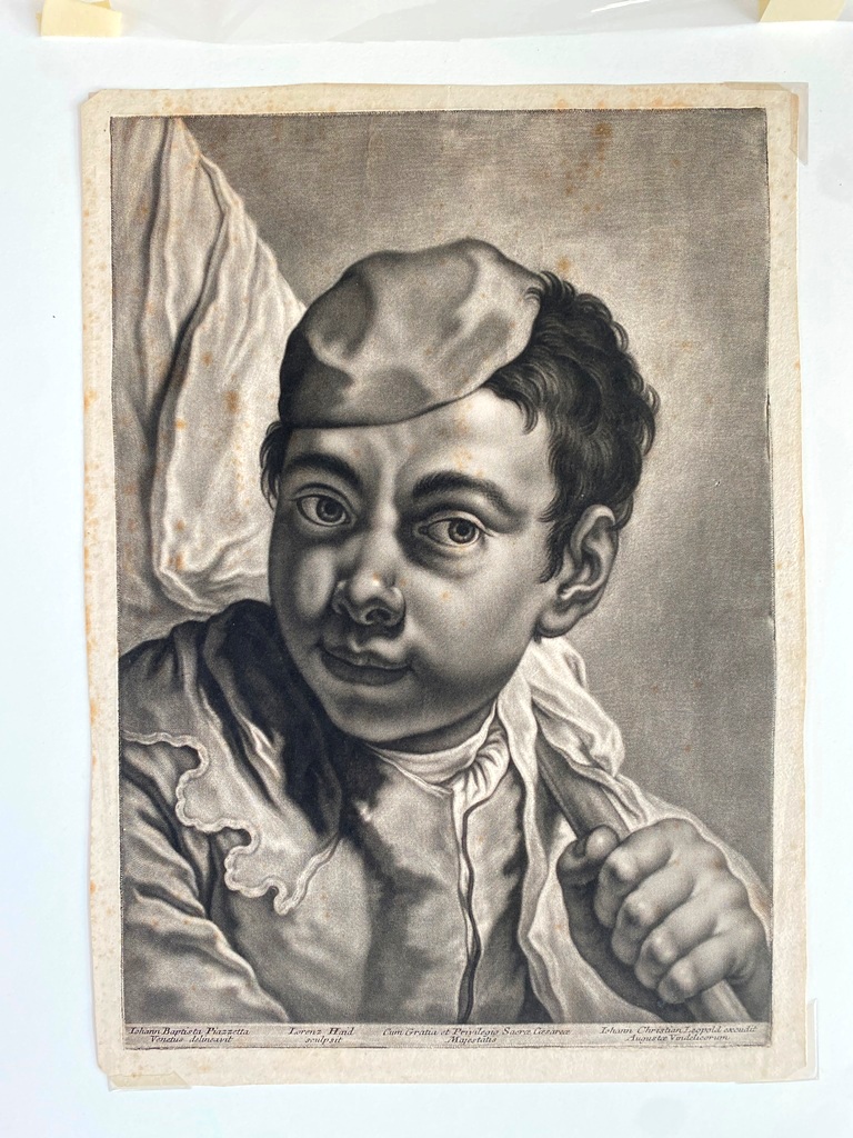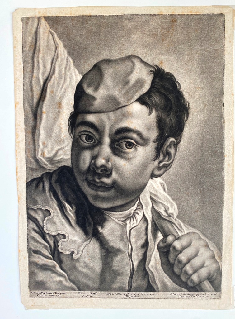 JOHANN LORENZ HAID (German 1702-1750). L'Enseigne mor (The Moorish Sign), circa mid-1700s. Mezzotint print after the work of Italian painter Giovanni Battista Piazzetta (1682-1754) and was published by Johann Christian Leopold in in Augsburg, Germany. The print was likely part of a series of 22 imaginary portrait heads published in Augsburg around 1730-50. The print depicts a young boy with a cap and a large sack over his shoulder. The inscription at the base provides the name of the artists, the publisher and the copyright (Cum Gratia et Privilegio Sacrae Caesareae Majestatis"). Unframed. Not mounted or laid down. - Image: 15 x 10.5 inches; sheet: 16 x 11.5 inches Estimate $200-250