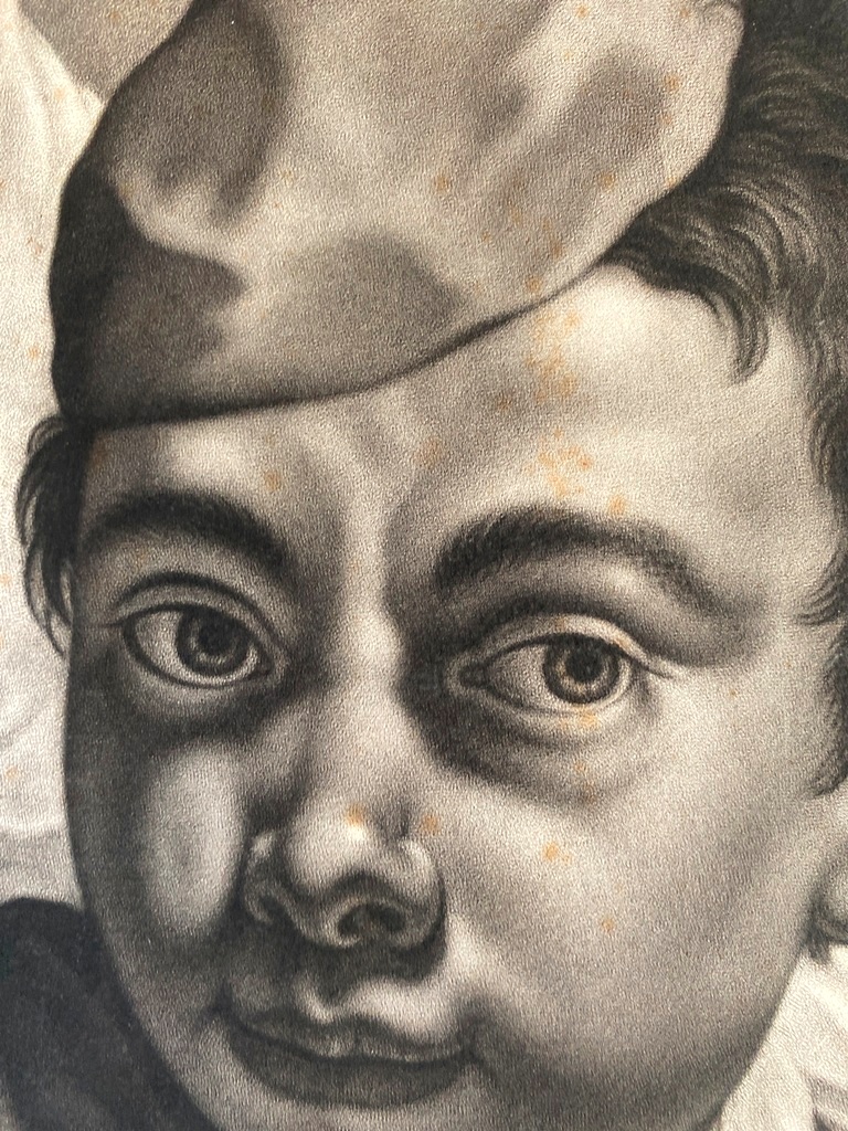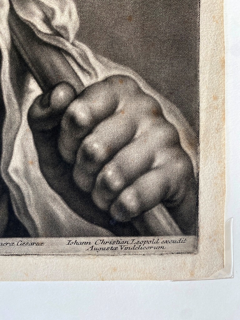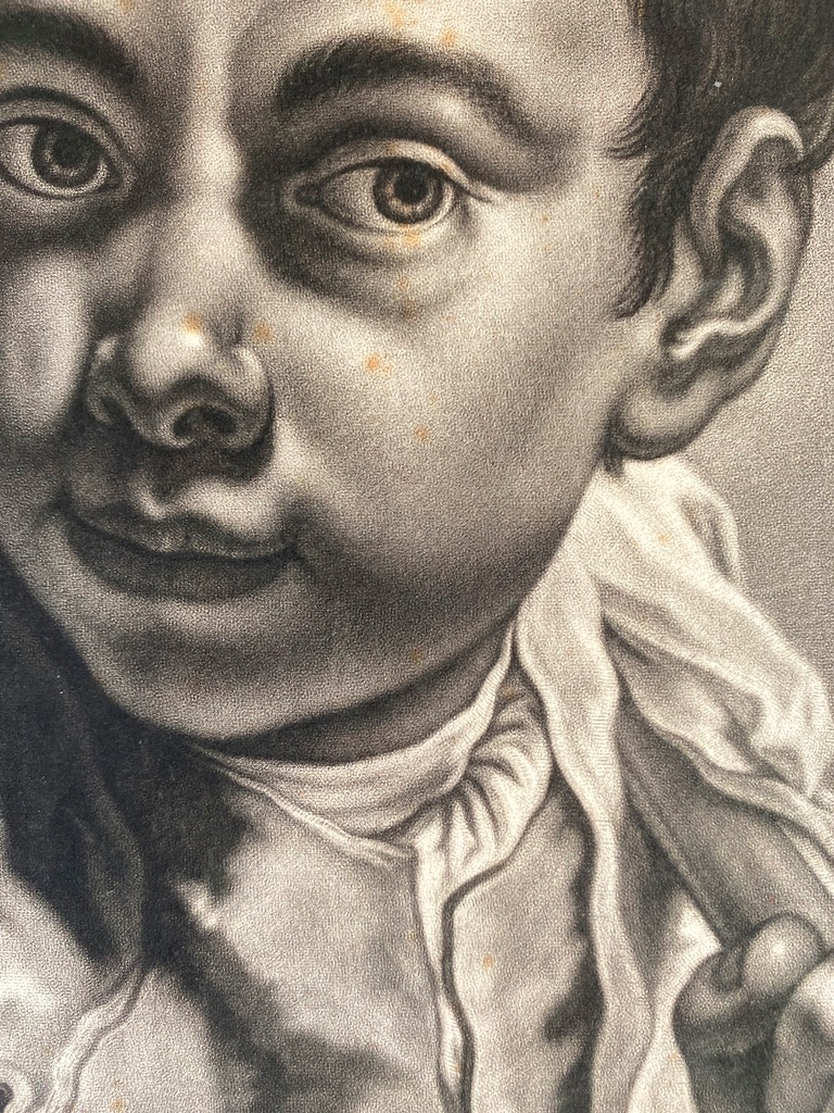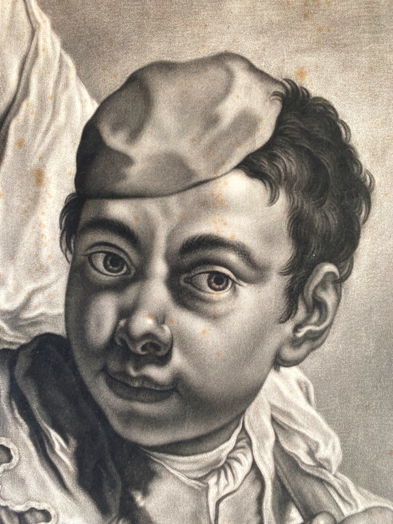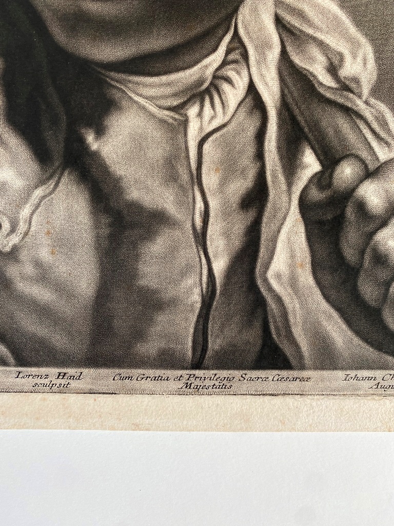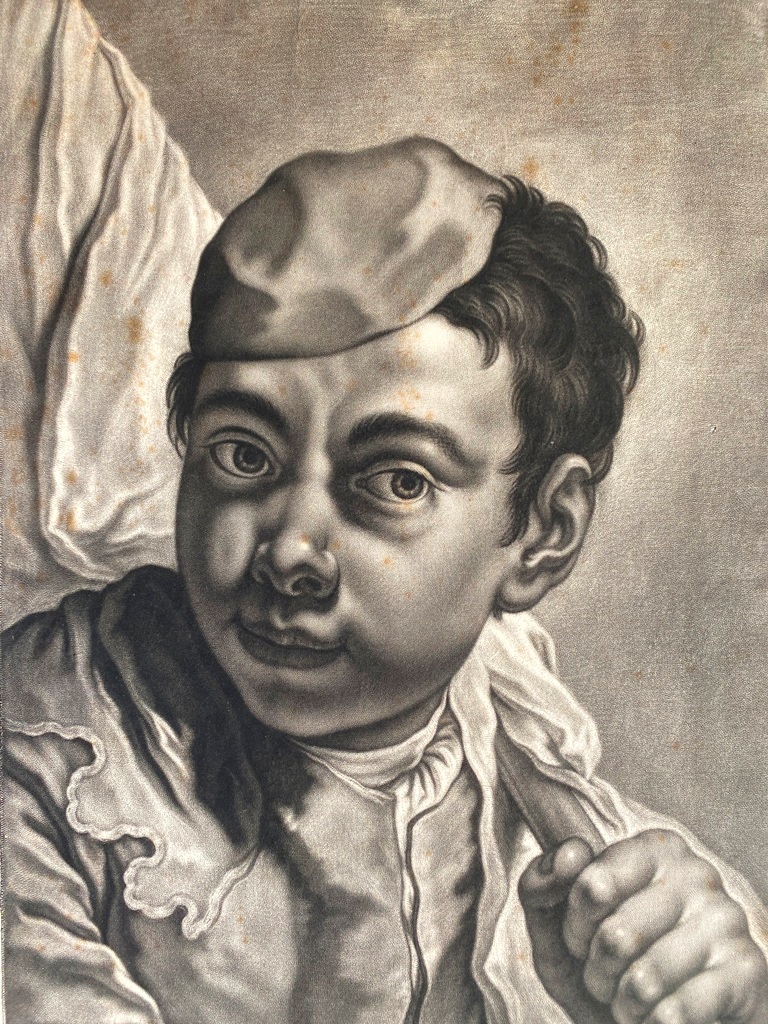 JOHANN LORENZ HAID (German 1702-1750). L'Enseigne mor (The Moorish Sign), circa mid-1700s. Mezzotint print after the work of Italian painter Giovanni Battista Piazzetta (1682-1754) and was published by Johann Christian Leopold in in Augsburg, Germany. The print was likely part of a series of 22 imaginary portrait heads published in Augsburg around 1730-50. The print depicts a young boy with a cap and a large sack over his shoulder. The inscription at the base provides the name of the artists, the publisher and the copyright (Cum Gratia et Privilegio Sacrae Caesareae Majestatis"). Unframed. Not mounted or laid down. - Image: 15 x 10.5 inches; sheet: 16 x 11.5 inches Estimate $200-250