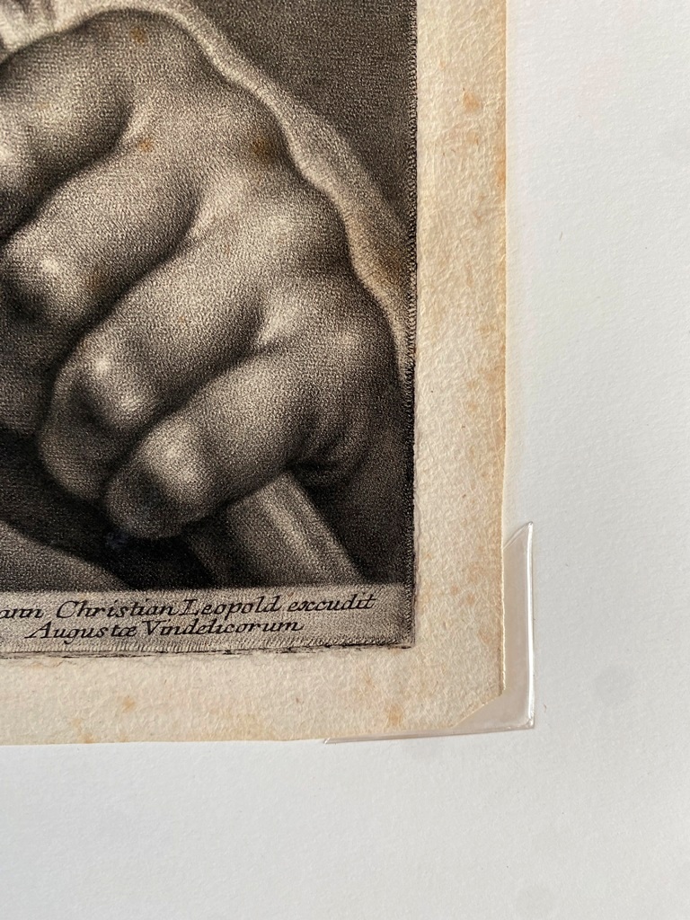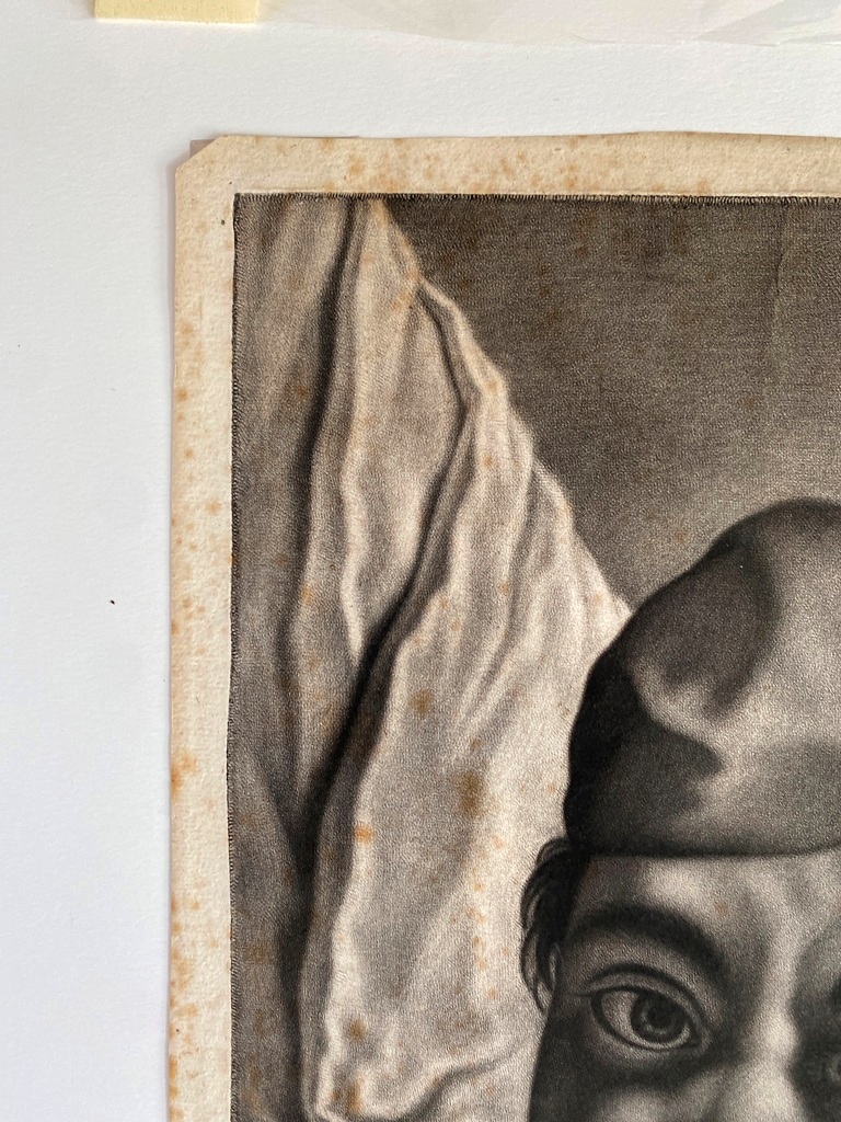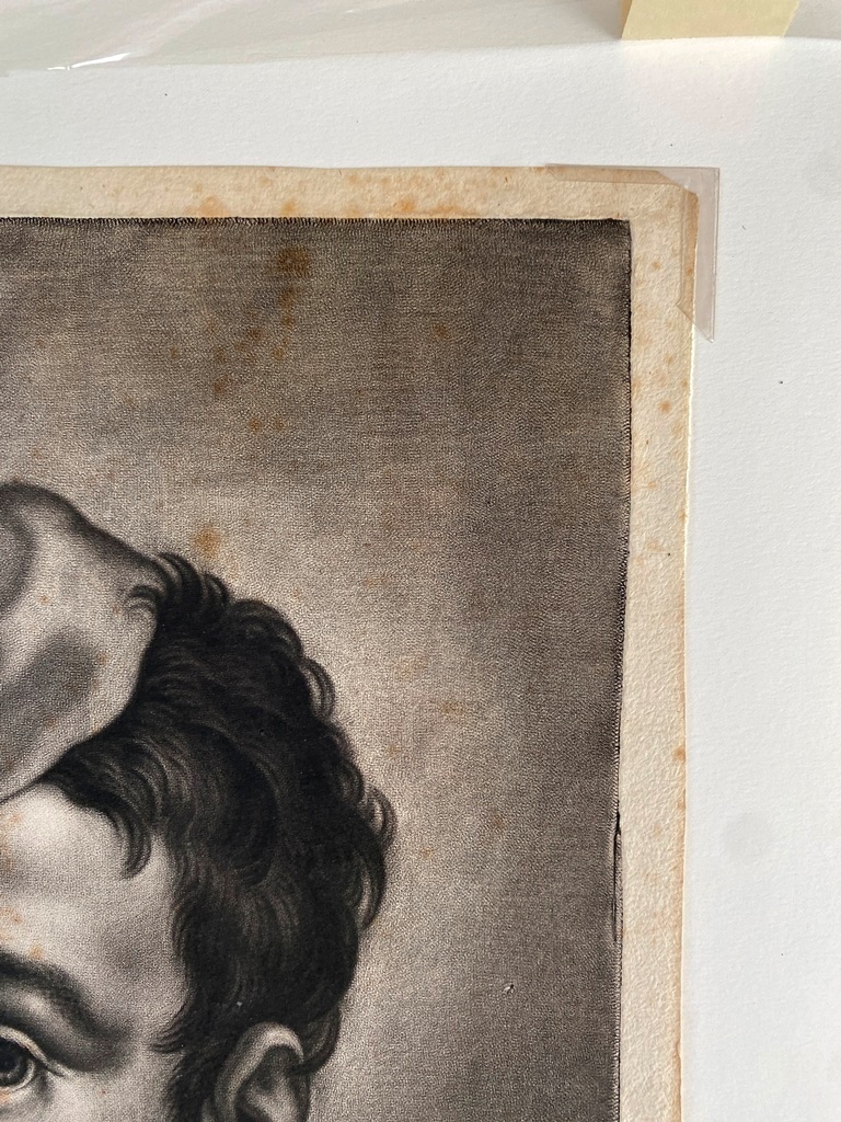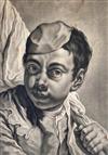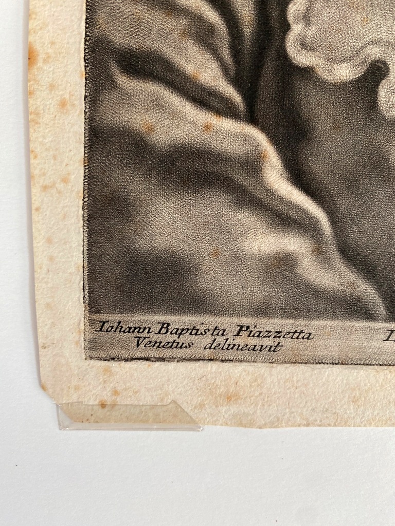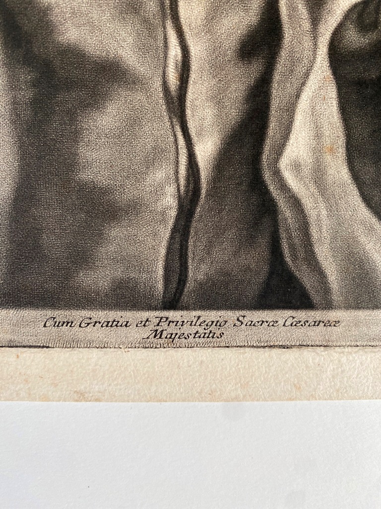 JOHANN LORENZ HAID (German 1702-1750). L'Enseigne mor (The Moorish Sign), circa mid-1700s. Mezzotint print after the work of Italian painter Giovanni Battista Piazzetta (1682-1754) and was published by Johann Christian Leopold in in Augsburg, Germany. The print was likely part of a series of 22 imaginary portrait heads published in Augsburg around 1730-50. The print depicts a young boy with a cap and a large sack over his shoulder. The inscription at the base provides the name of the artists, the publisher and the copyright (Cum Gratia et Privilegio Sacrae Caesareae Majestatis"). Unframed. Not mounted or laid down. - Image: 15 x 10.5 inches; sheet: 16 x 11.5 inches Estimate $200-250