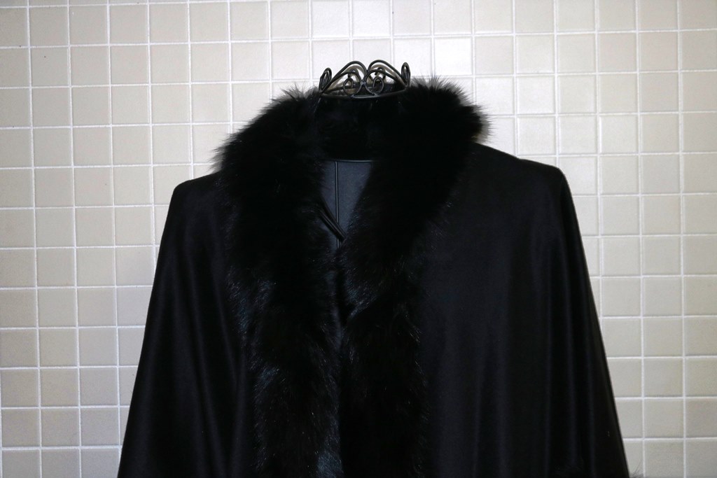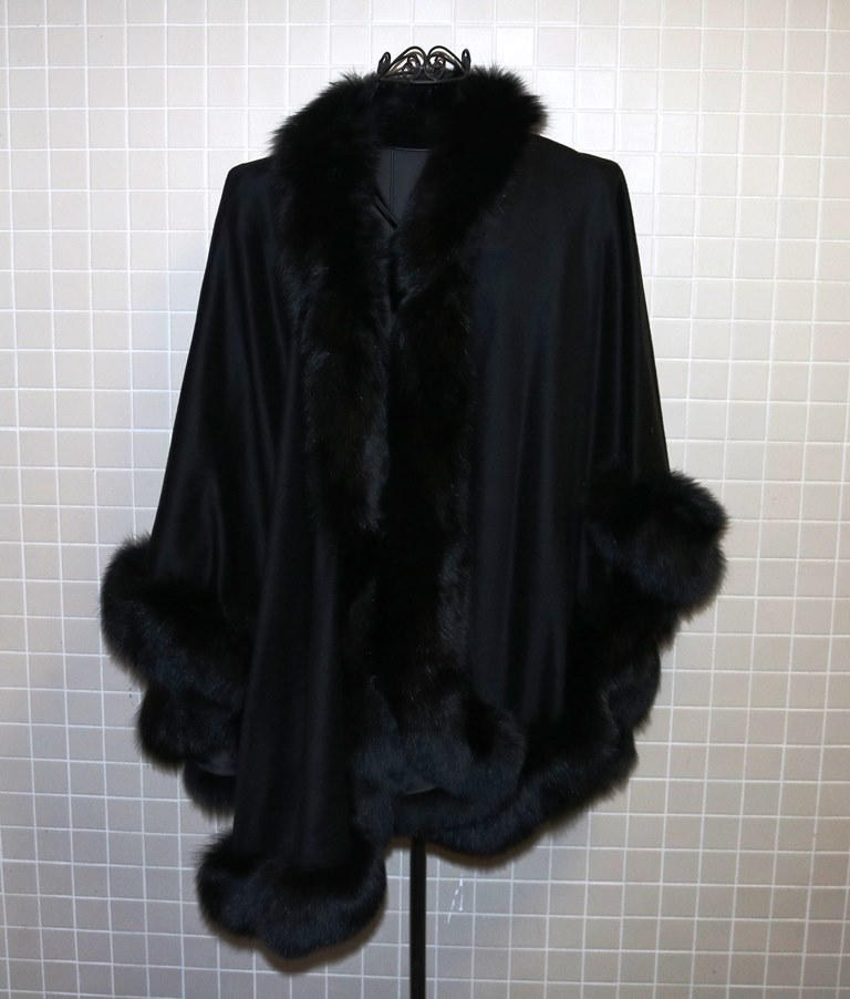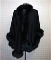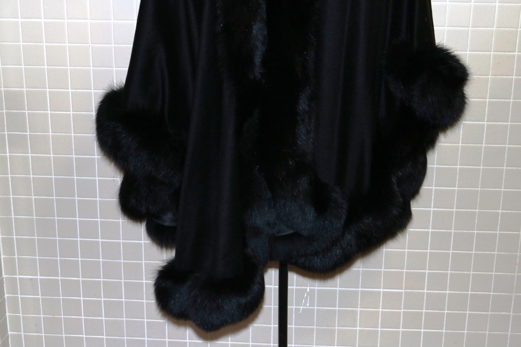 LADY'S BLACK CASHMERE CAPE WITH BLACK FUR TRIM.